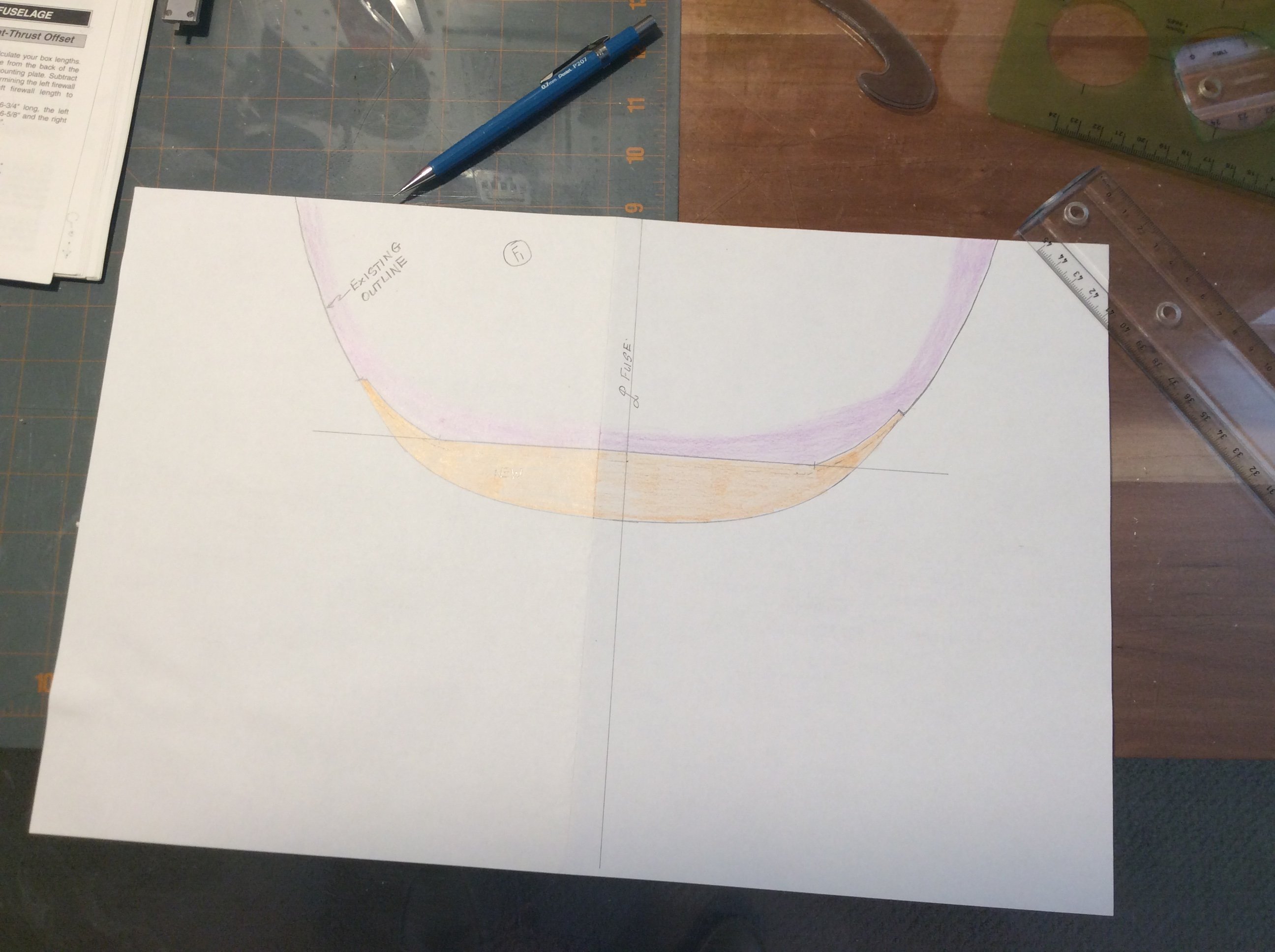 So if you look at the picture of the drawing I made of the bottom of bulkhead F1. The out line of the bottom of the bulk is in purple. There is a added section in orange added to the bottom of F1 and the shape is blended in to F1. If I do this and add that piece to the bottom of F1 it will take up the excess cowl material. Will have to do some shaping to blend that backwards into the fuselage but that can be done once the extra piece is added and the cowl fitted. What do think.