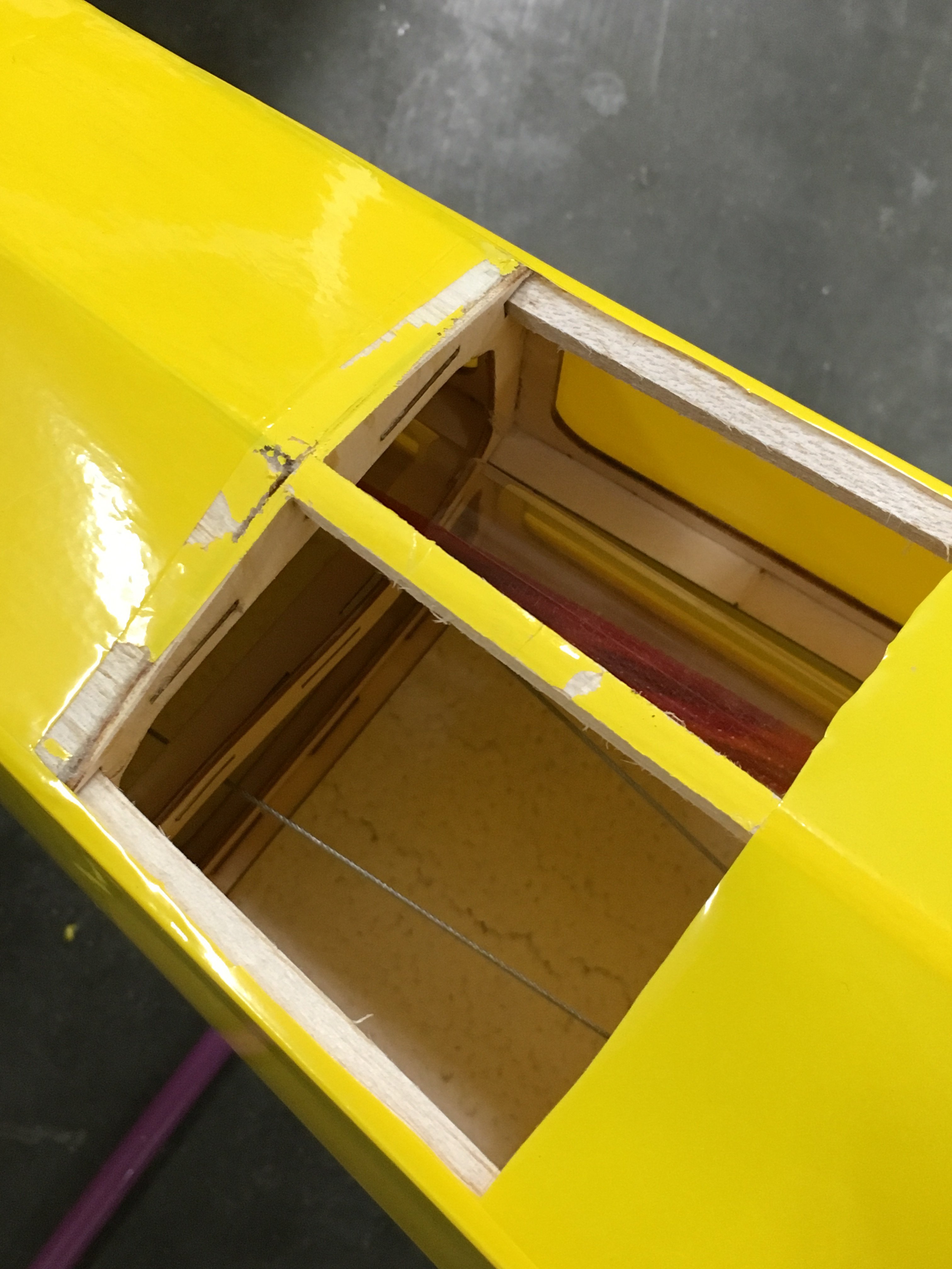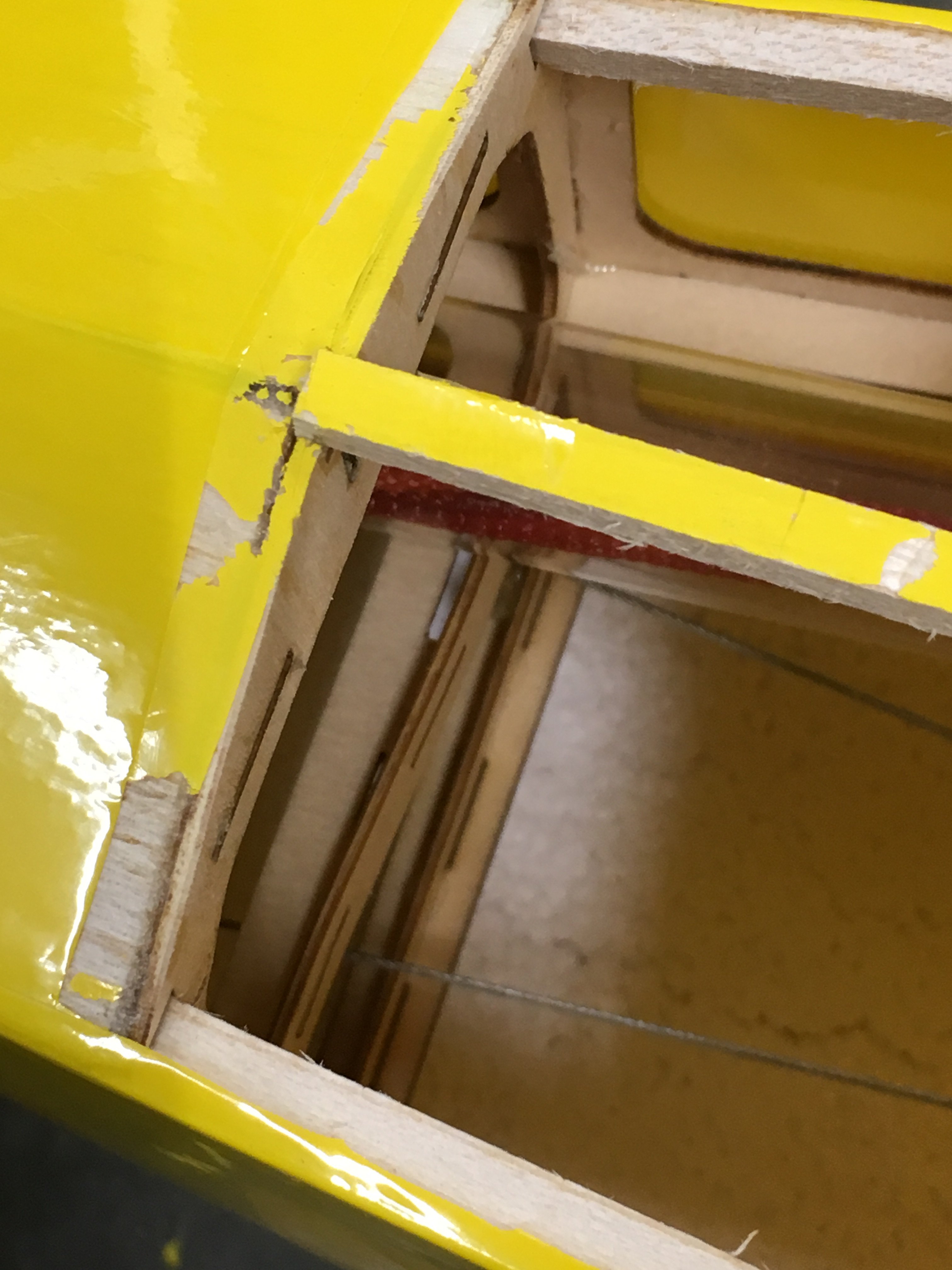 Looks like the top longeron glue joint failed because it was subject to a torsion load in which it is not designed for. It will probably end up with some cross bracing between formers to alleviate this.
