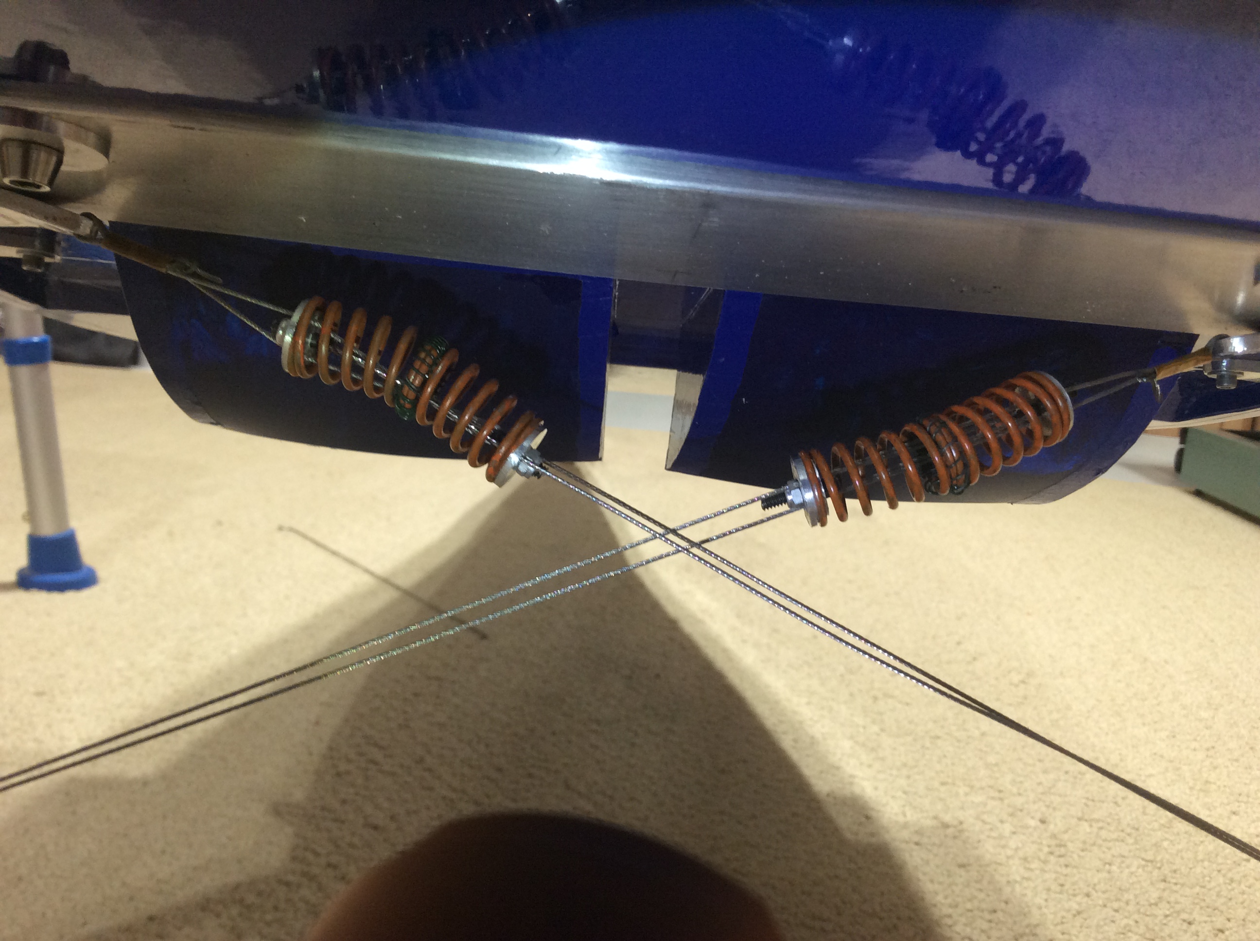 Also decided to add a little more support to the landing gear. Made a cable cross brace with compression springs Setup. It took a little doing and some lathe work for the parts but it worked out well. It add about an extra 35 lbs of load capability to each wheel. I just do not like or believe tension springs should be used on landing gear.