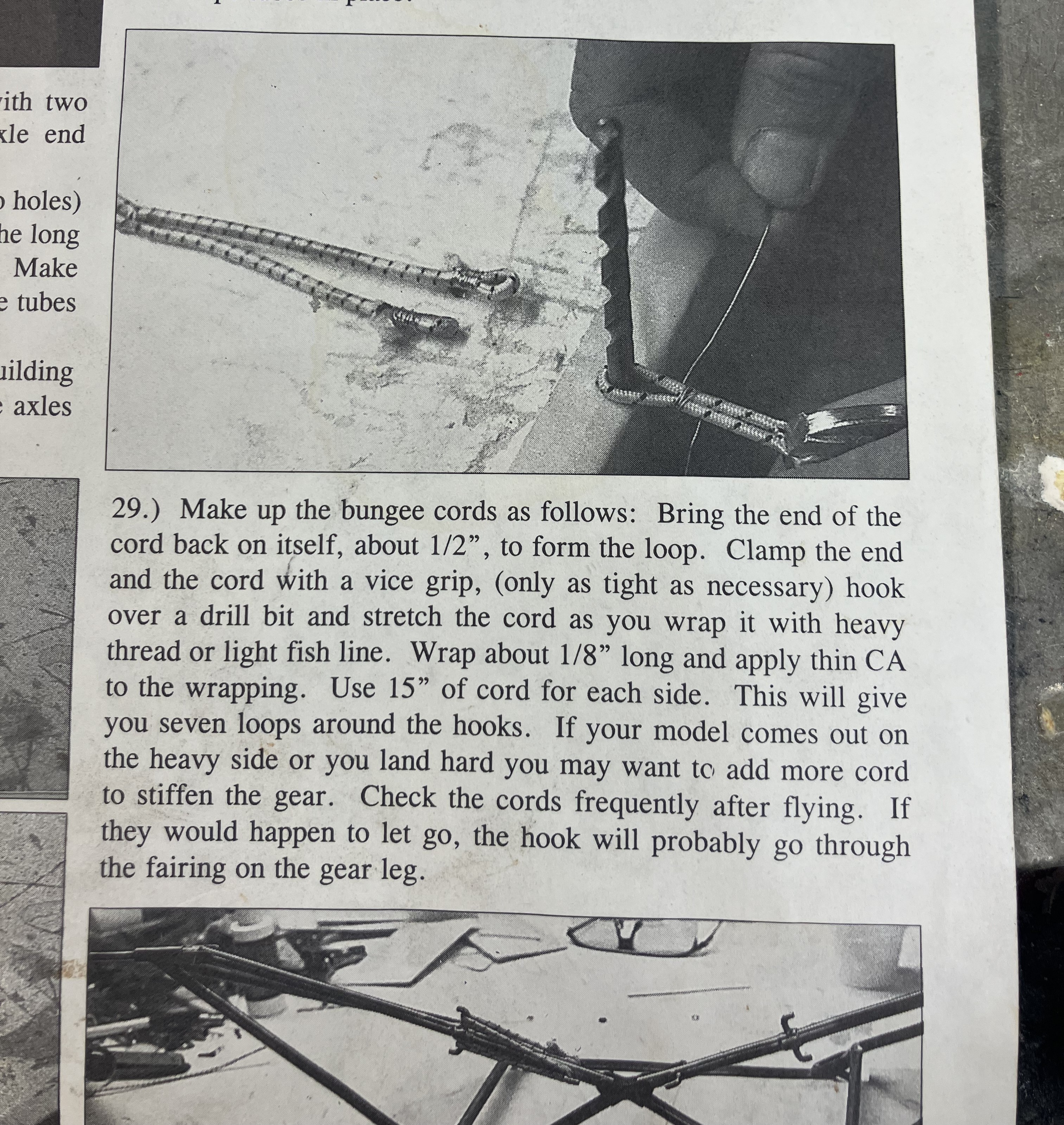 You can get bungee cord in many diameters, my Super Cub uses 1/8" cord. I found on the Champ that stiffer springs work better. I had 50 pound per inch springs that just barely deflected at rest, anything less a perfect greased landing the plane bounced. At a scale contest last year, was chatting with Mike Barbee and told me that he likes his gear stiff. After that I added a second internal spring to each strut and my landings improved. Photos of the Cub gear are below, on the Cub, the bungees are 36" long stretched and wrapped so there are 20 strands, Started with 26" long but too soft.