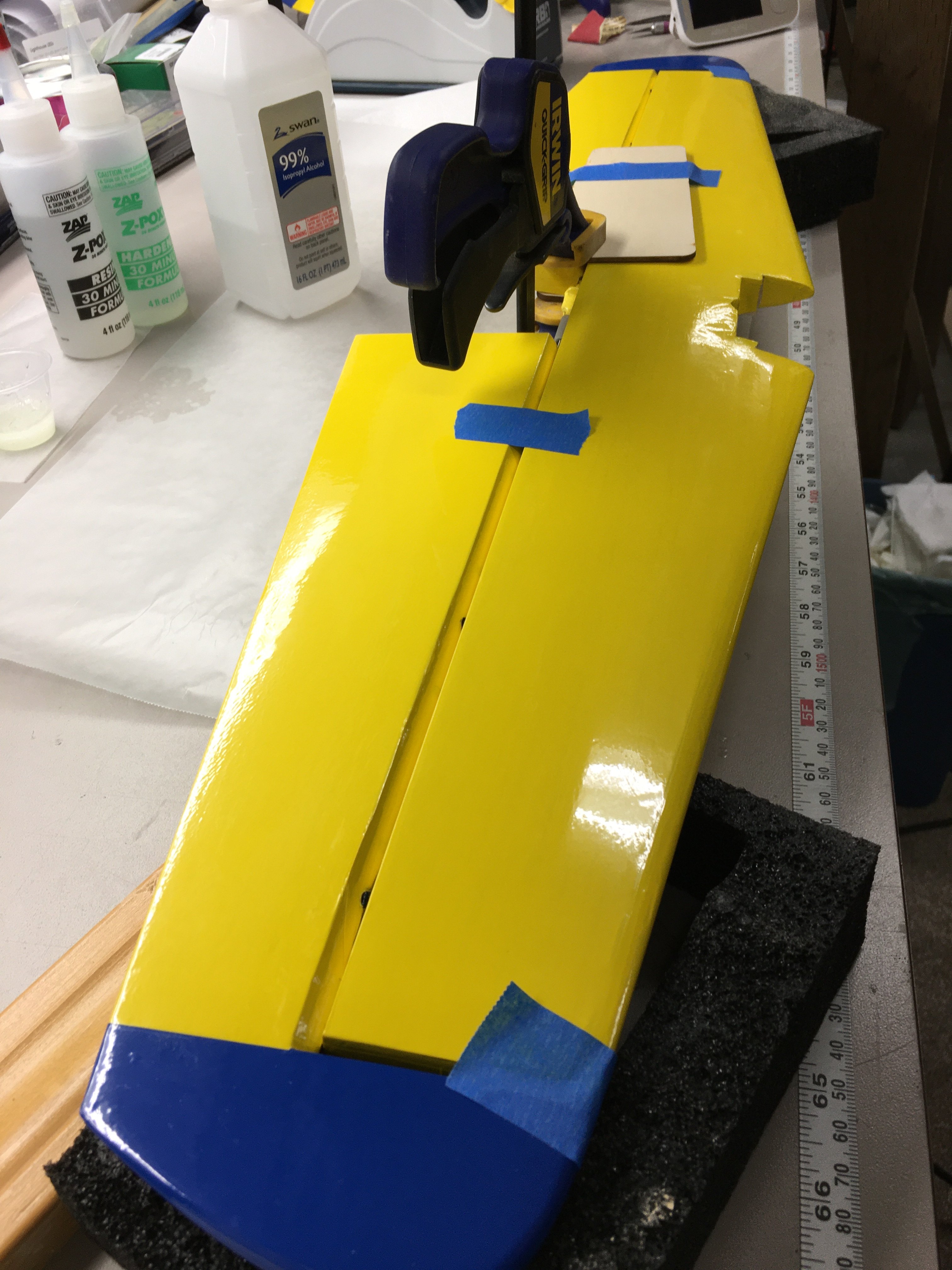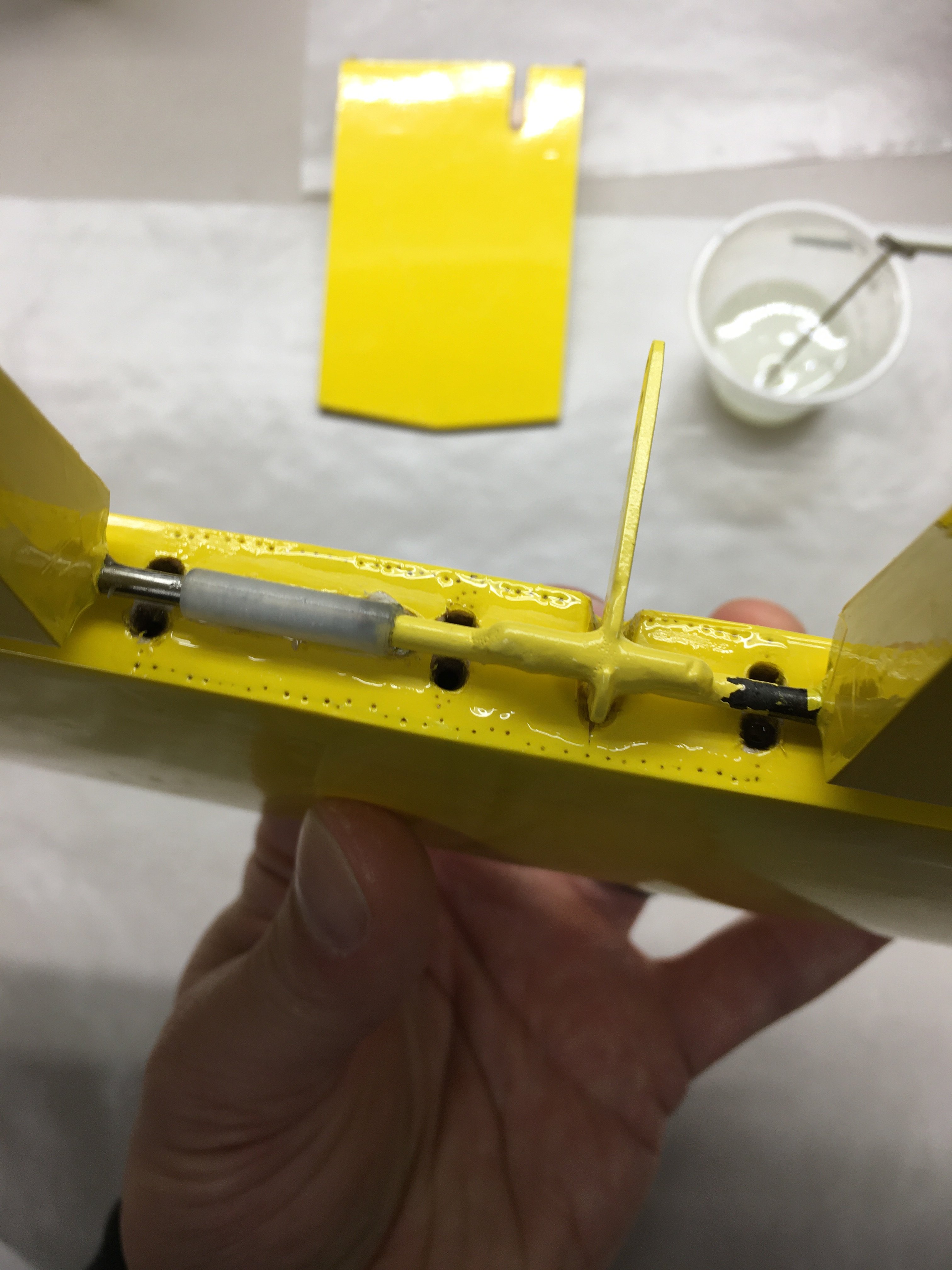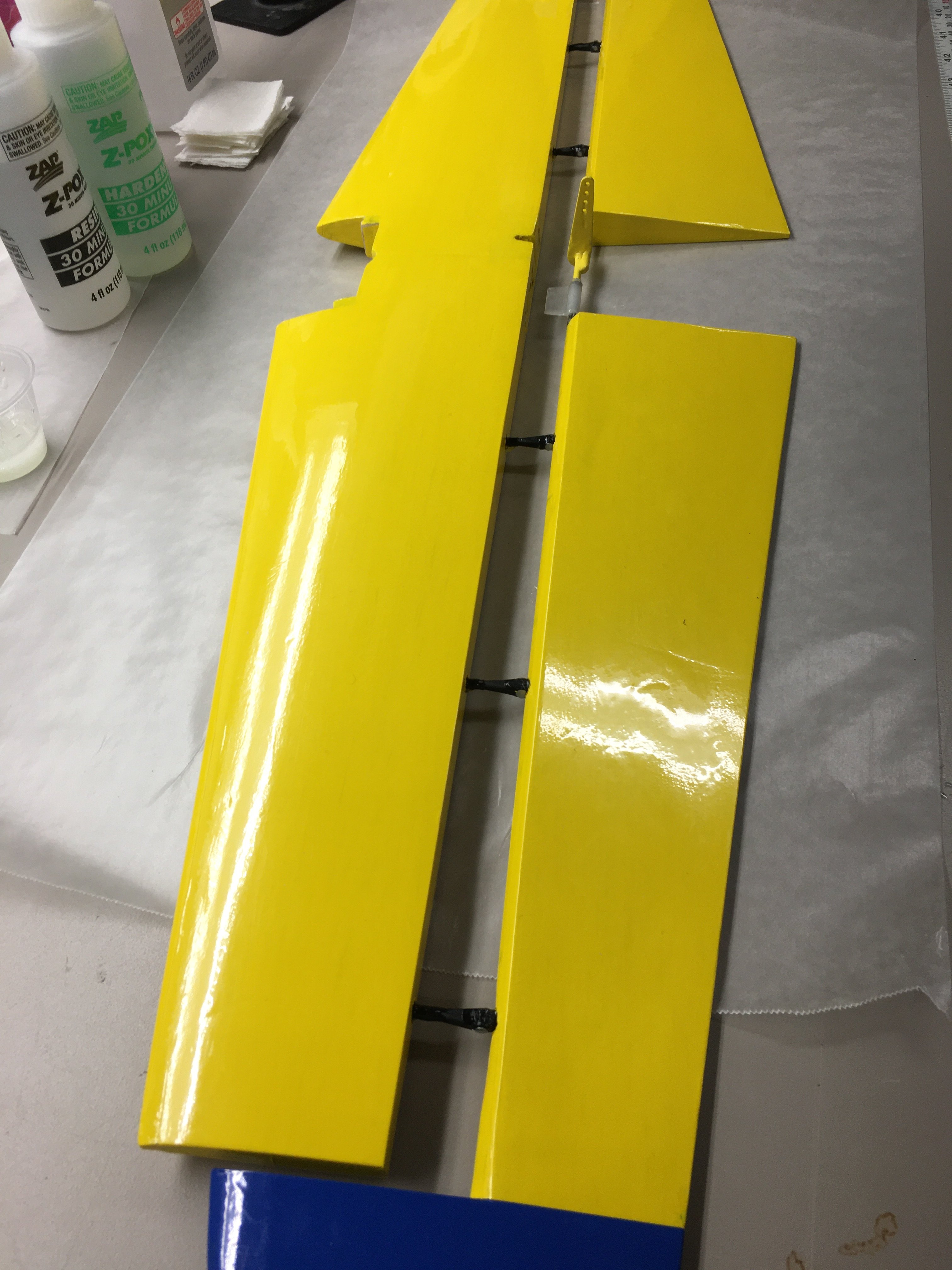 Using 30min Zap Epoxy, I mix it up in a mixing cup with a small plastic dowel used for rod building finishing resin. Use the rod to coat the epoxy inside the hinge holes. Lightly cover one barbed end of the pin by smearing with the mixing rod and insert into one half of the control surface. Do this with all the pins. You should have little to no excess resin. Do the other side and repeat.