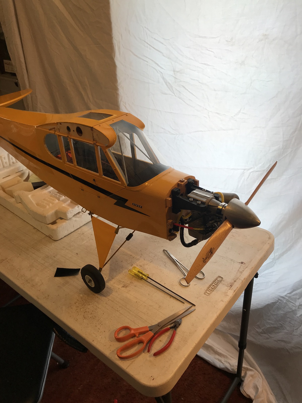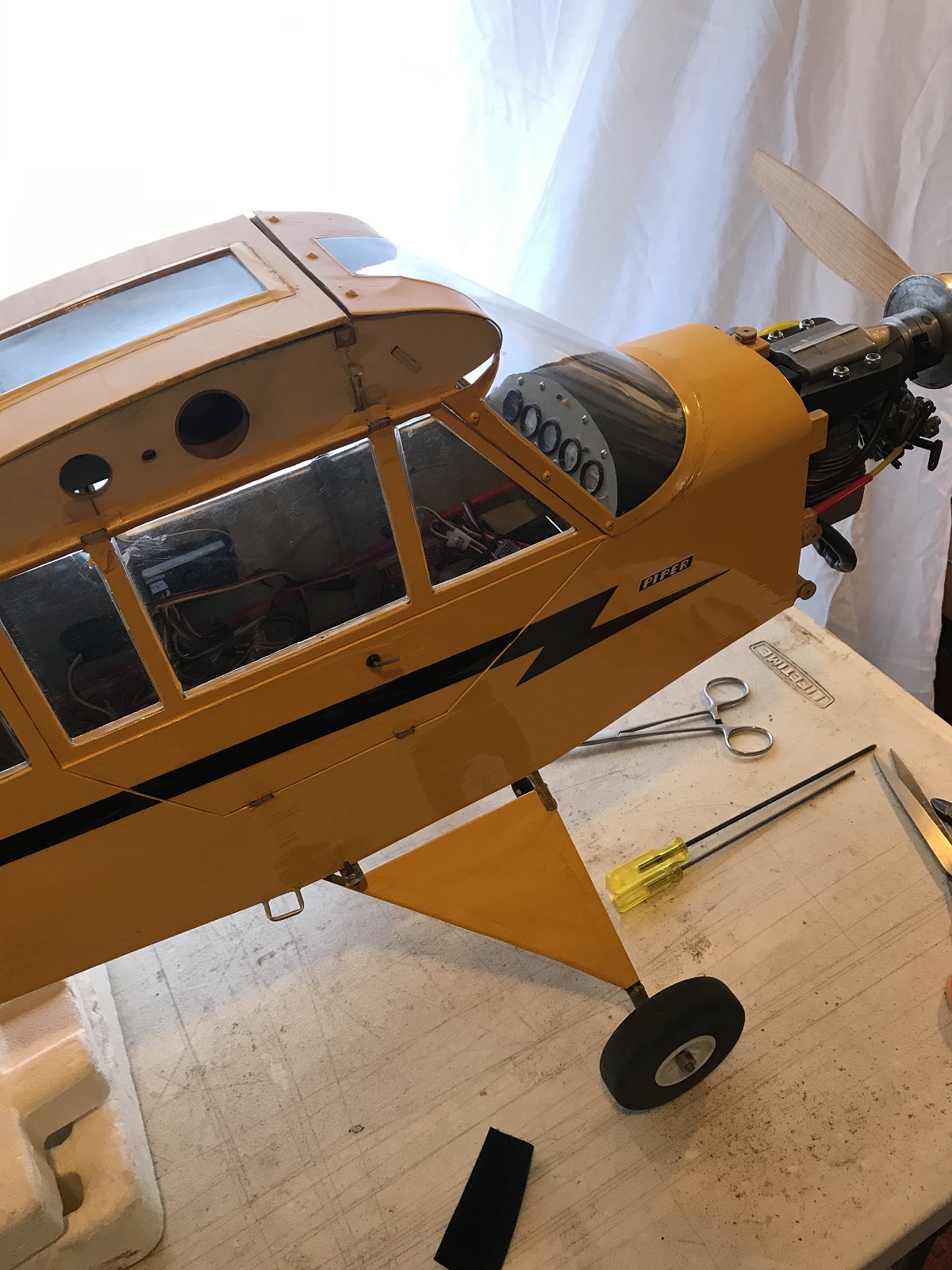 Also starting putting my old Sig 1/5 Piper Cub back together. It's been moth balled for years now. I installed my BME 90 gasser in the nose, new fuel tank, and moved the rudder servo back to a pull pull setup. Took the scale landing gear off and installed the stock gear back on. Shed some weight!!