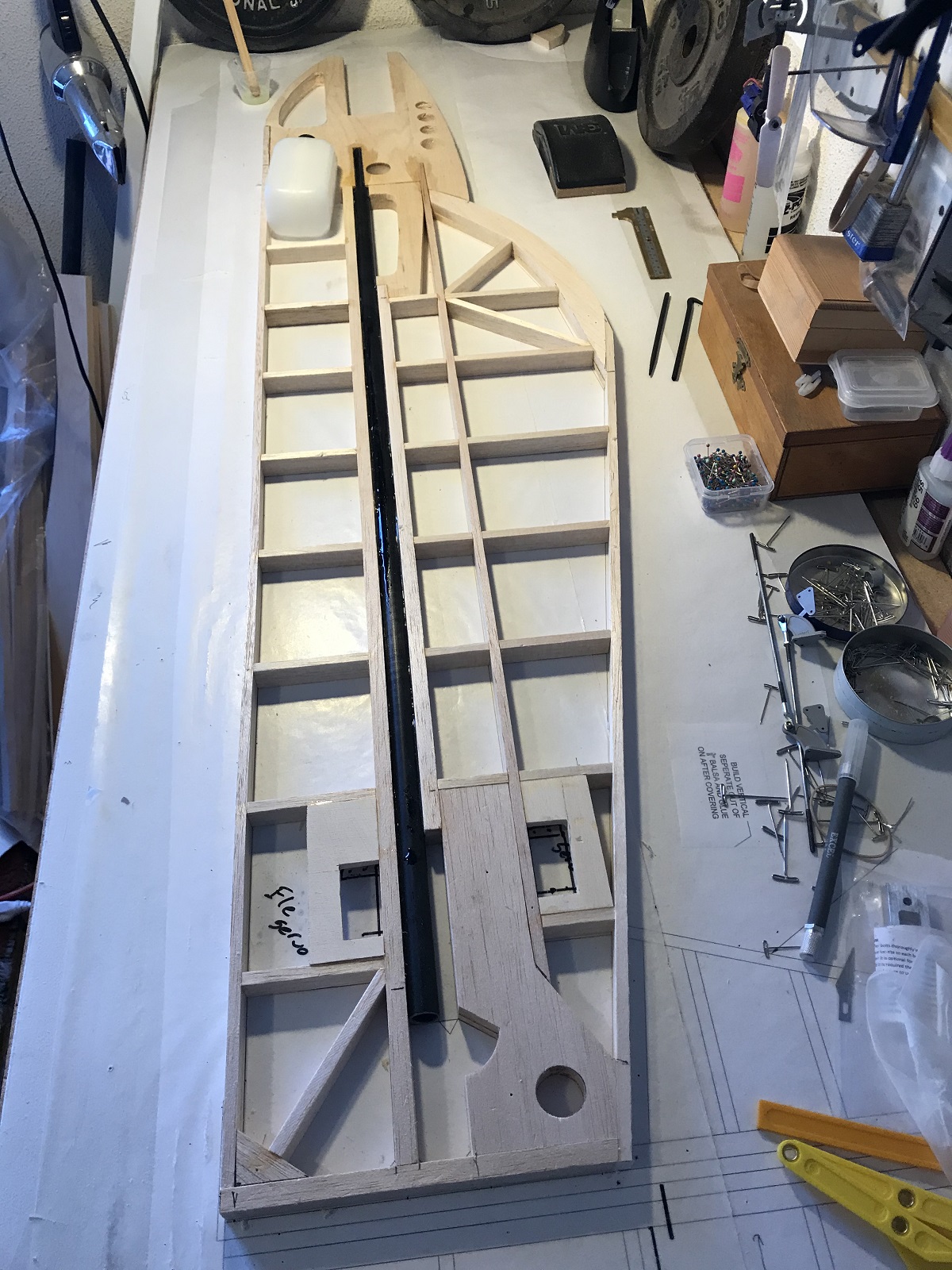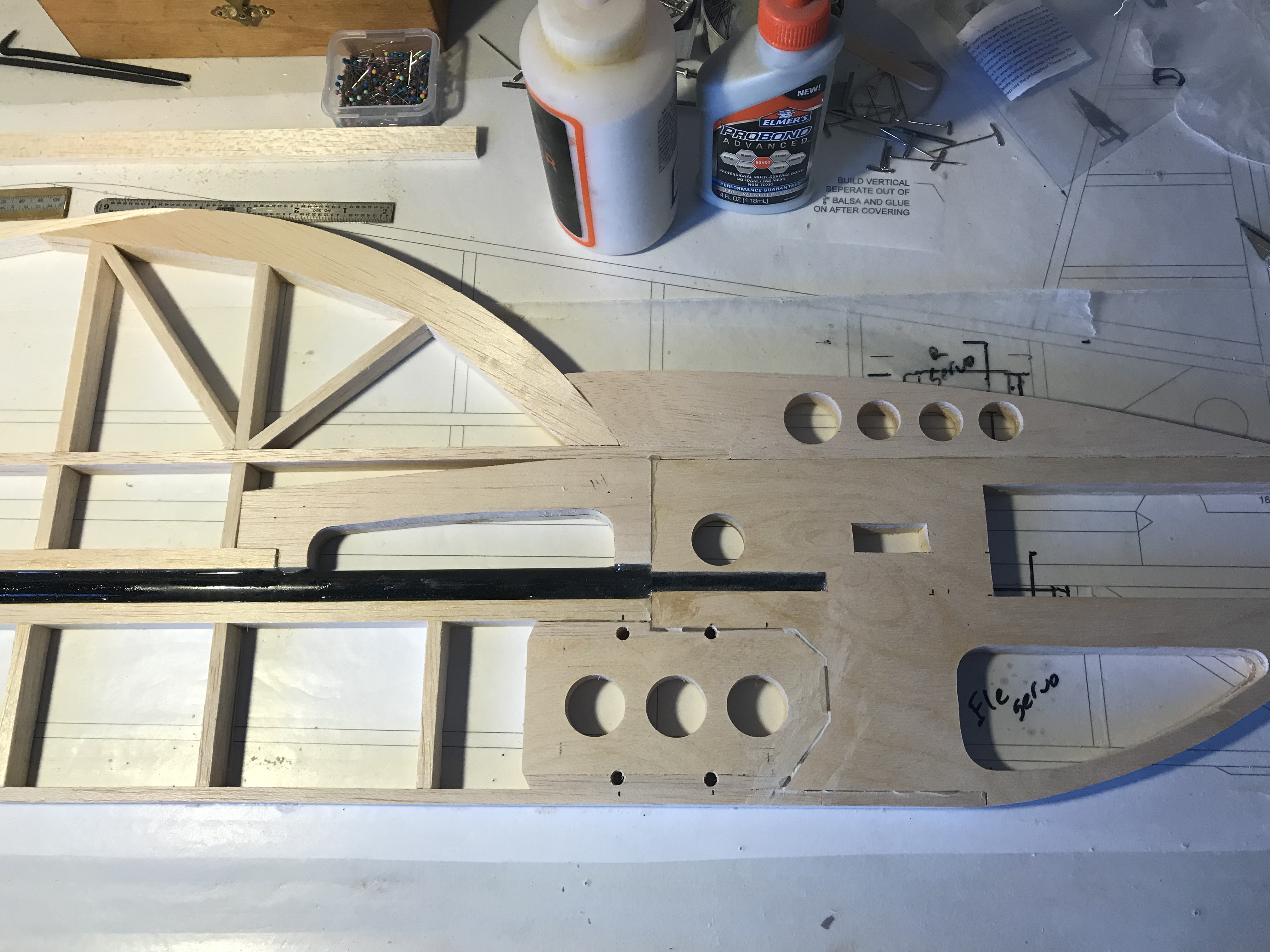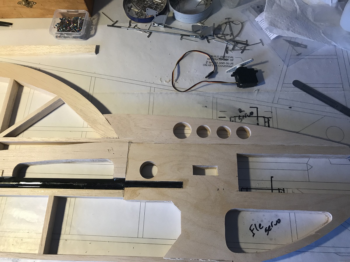Ok, made my first mistake!! I used the ProX as a template for the throttle servo before checking the position of the root wing rib. Cut the hole in exactly the wrong spot. I had to fill in the hole and move the servo down a bit. I also built the tank/ignition mount. I think I've got the fuse all done, except for gluing on the vertical fin. Might do that next.
