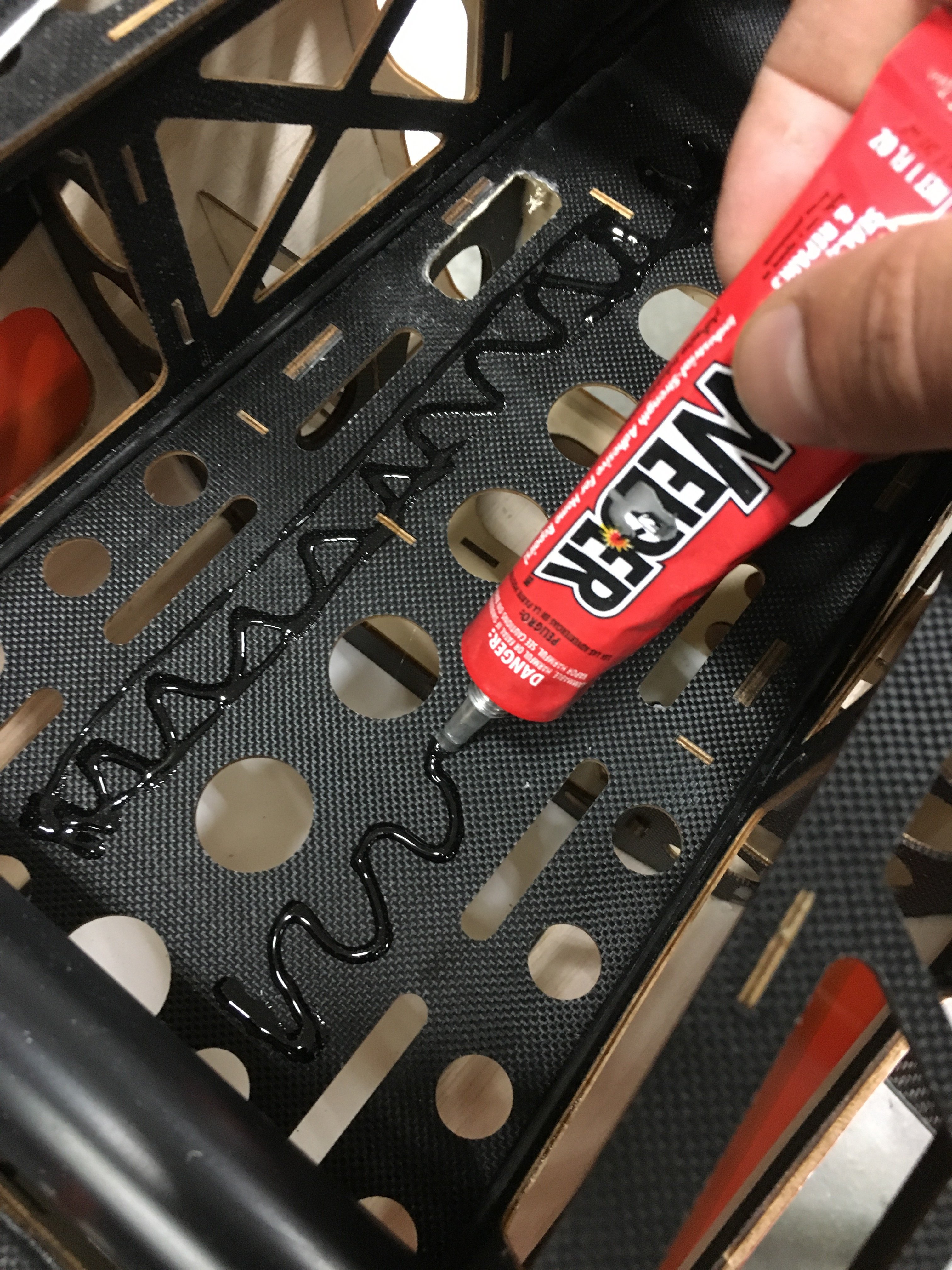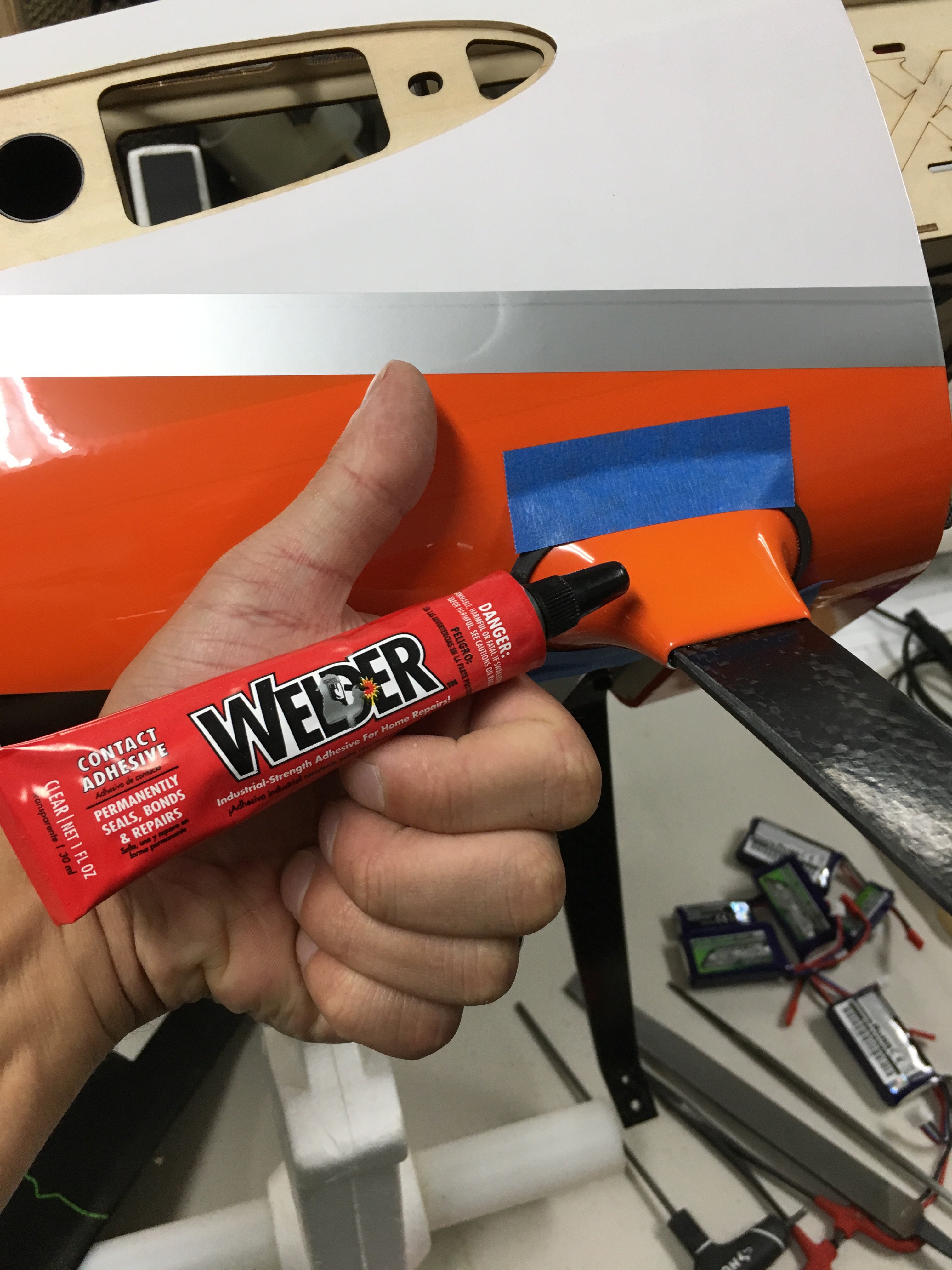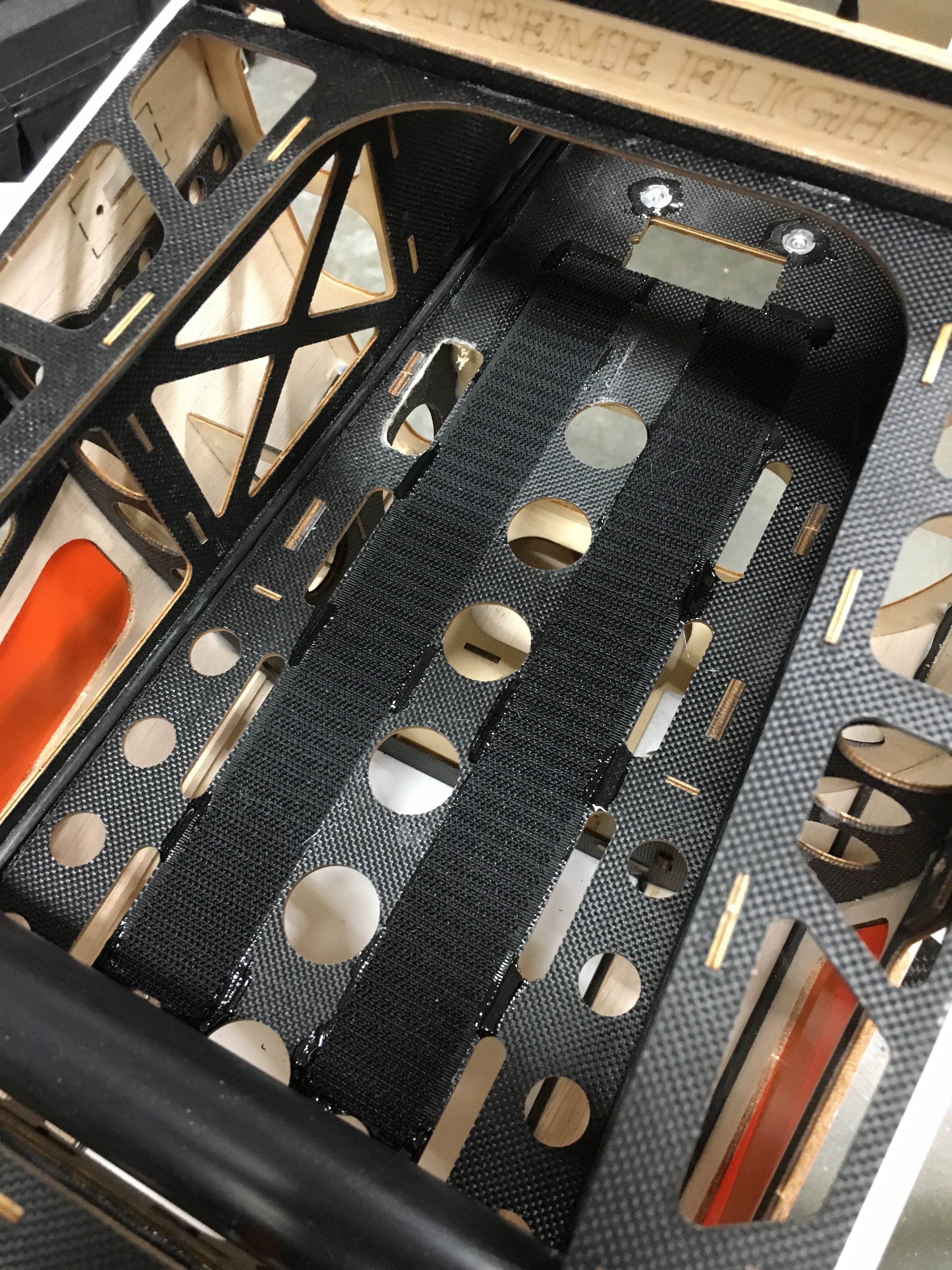 Installed Velcro inside the fuselage for the batteries. I've been tacking a thin layer of welders glue down first. I never trust the sticky 3M velcro by itself. Creates an awesome bond this way. If you dont have the sticky back velcro, just smear some welders glue on the back. I go even one step further and add a little bead on the sides to keep it from lifting.
