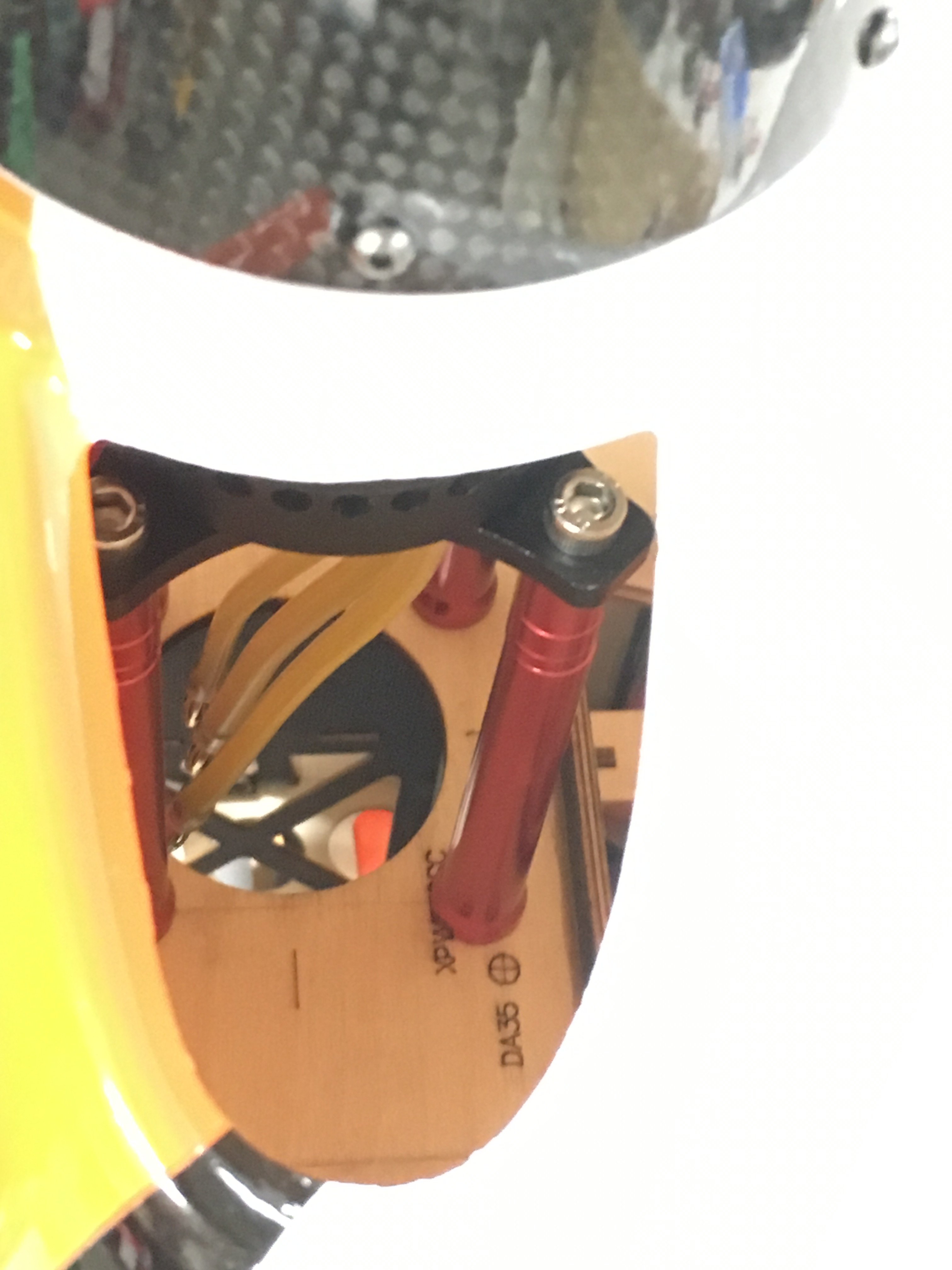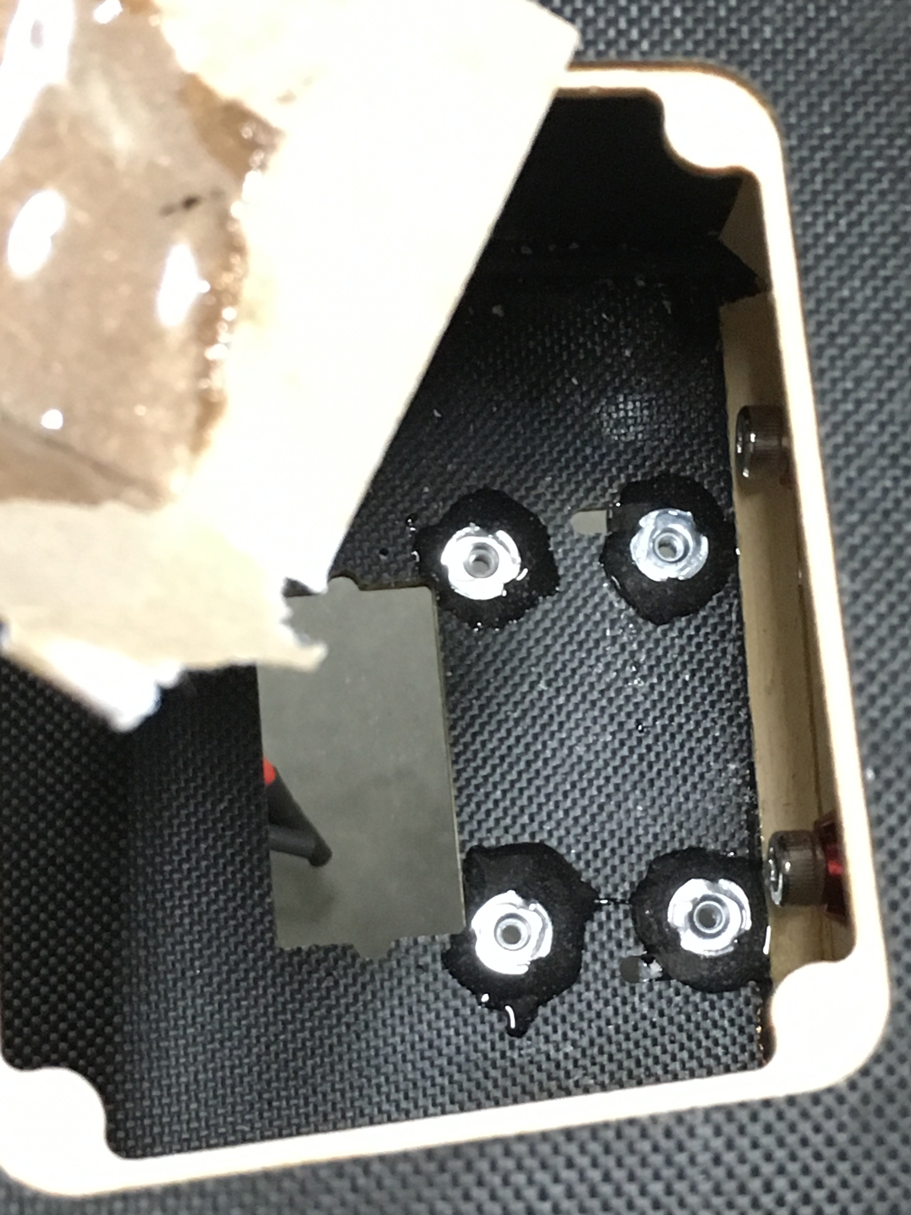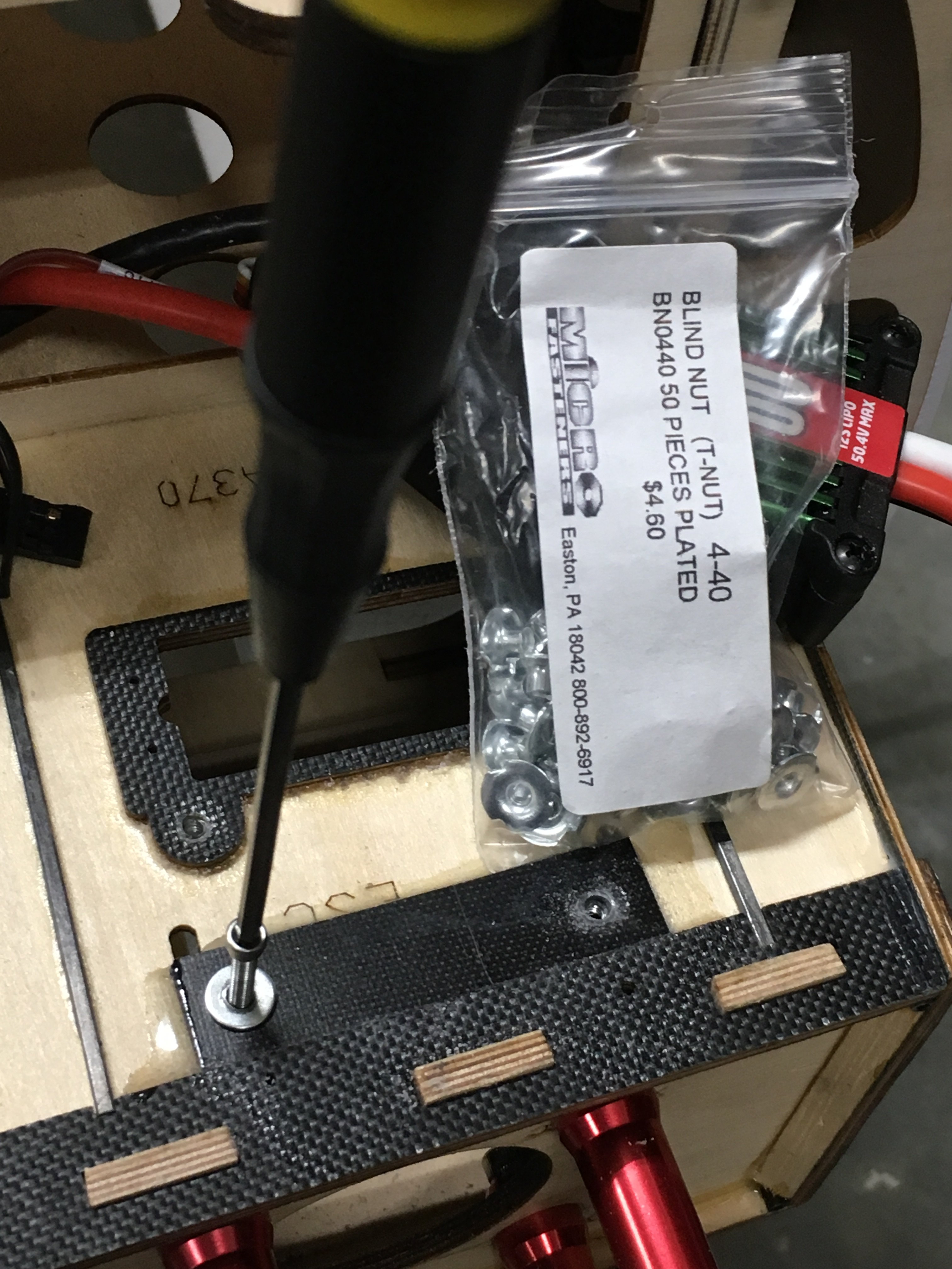 I found a spot on the bottom of the engine box that suited my liking. Got some carbon G10 board, and made a little standoff, epoxied that in place. Drilled four holes, and used some 4-40 bolts trimmed to length with some blind nuts put in place and added some epoxy around them. I cinched them down using a 4-40 bolt with a thick washer on it.