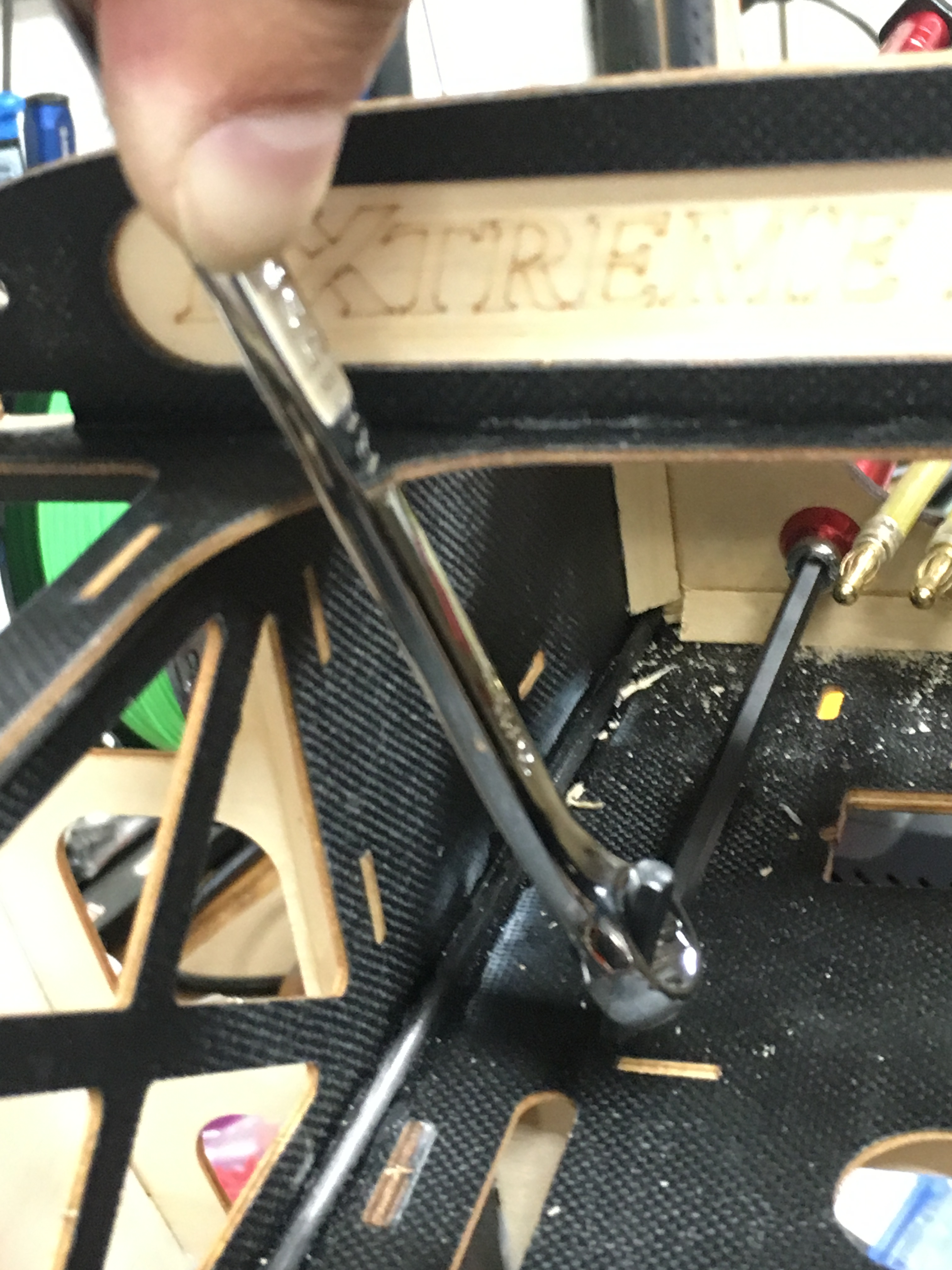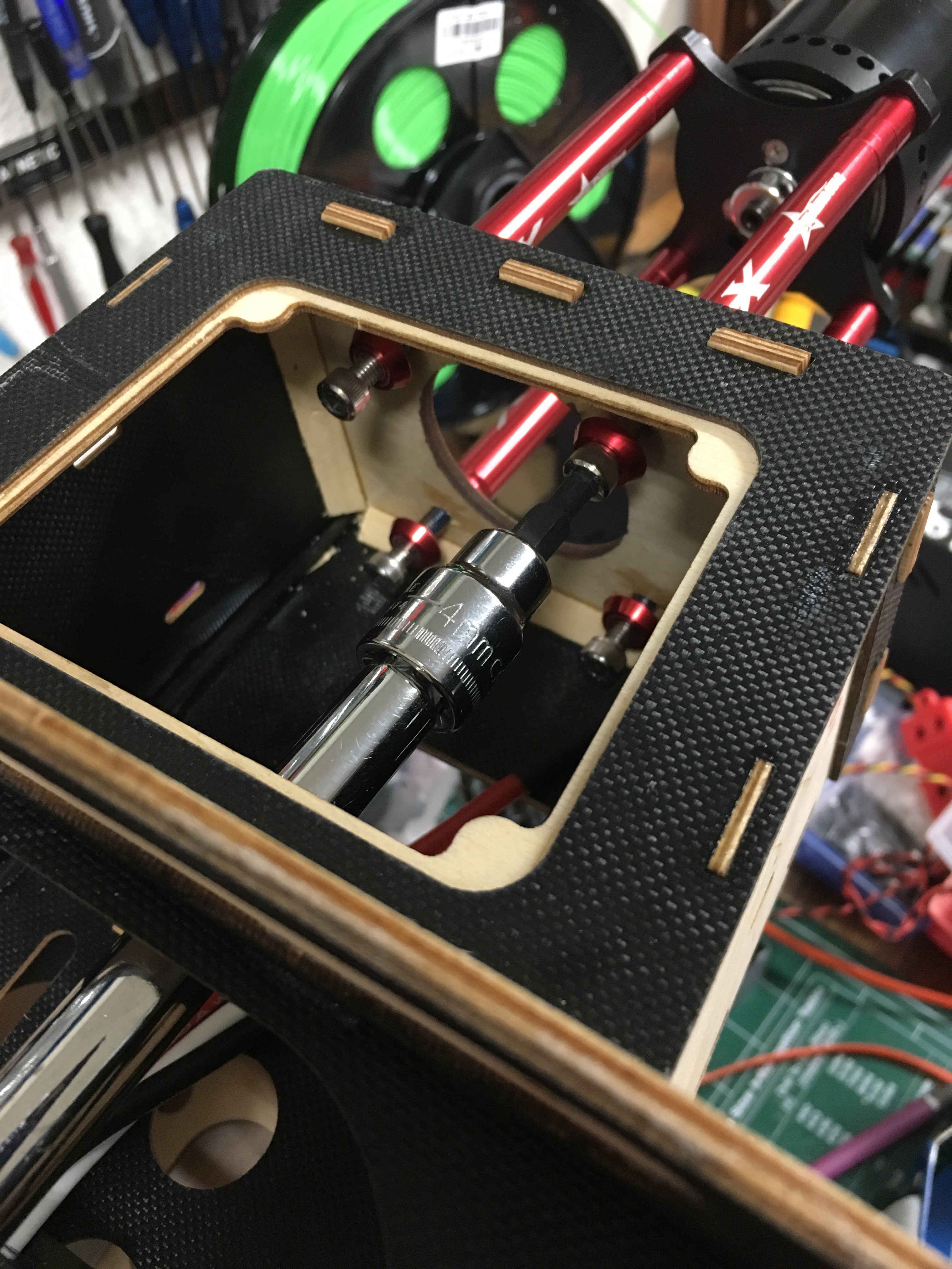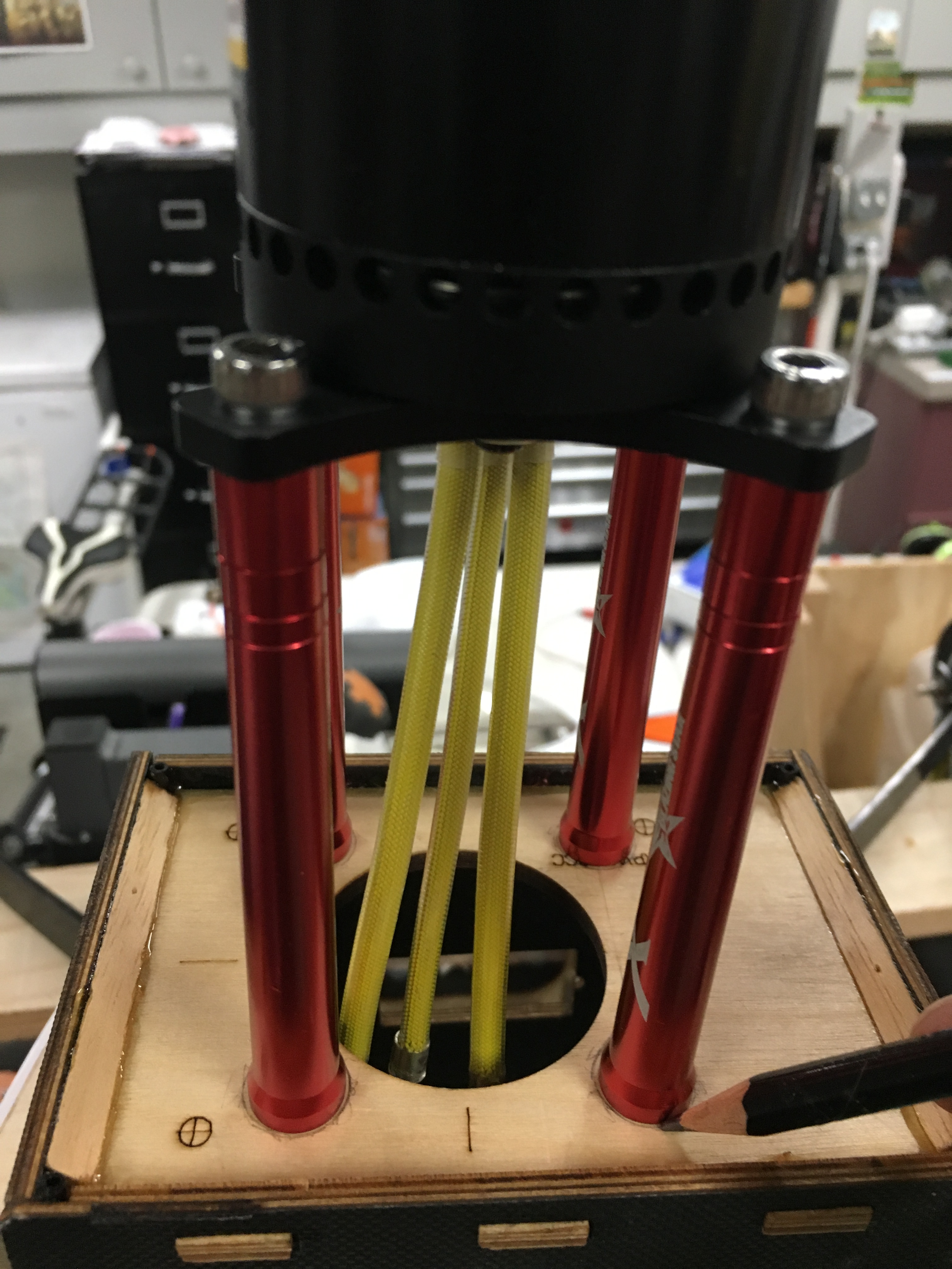 I found a spot on the bottom of the engine box that suited my liking. Got some carbon G10 board, and made a little standoff, epoxied that in place. Drilled four holes, and used some 4-40 bolts trimmed to length with some blind nuts put in place and added some epoxy around them. I cinched them down using a 4-40 bolt with a thick washer on it.