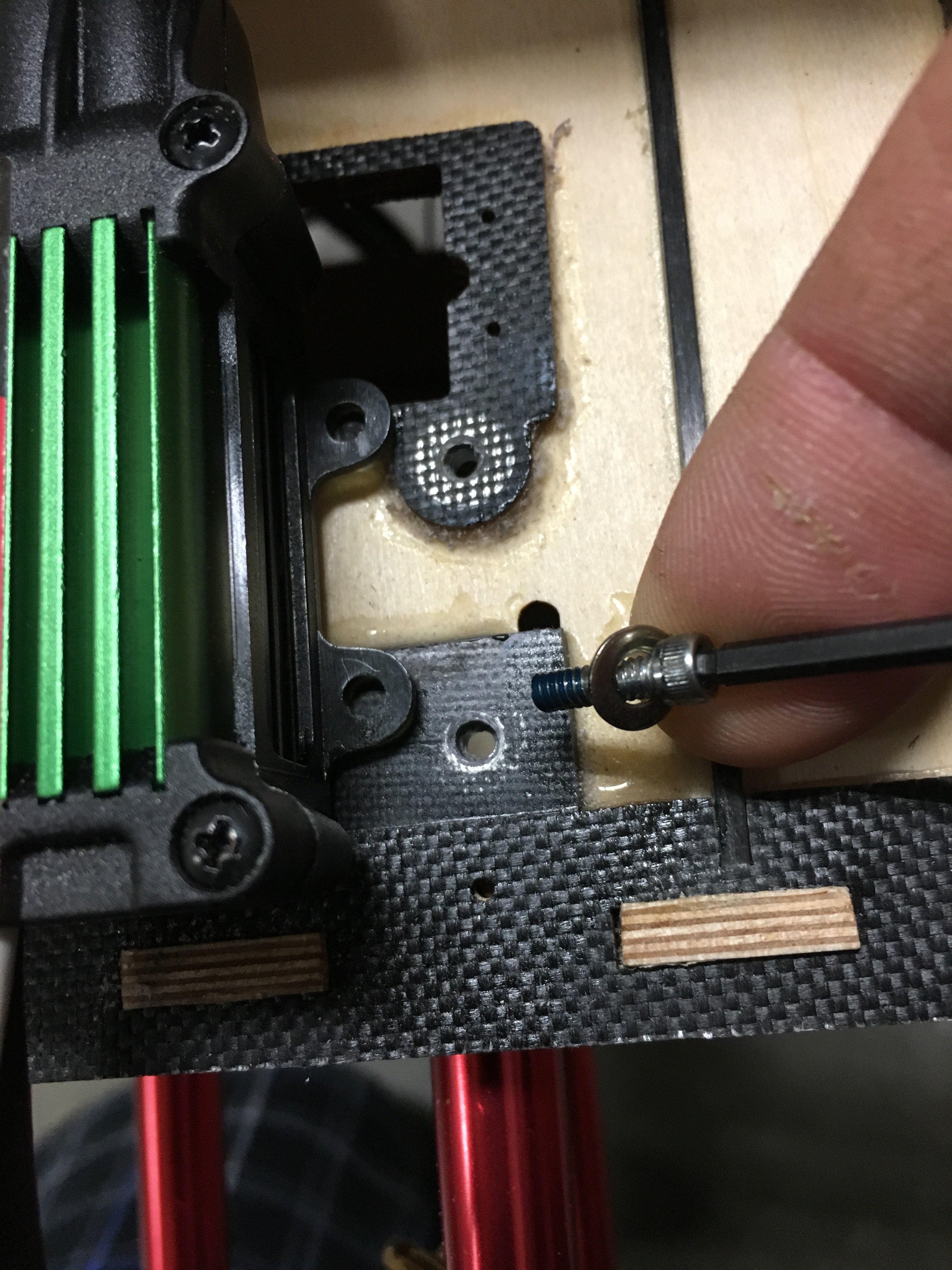 Cleaned up the holes, added some thin CA to harden it up a bit, and bolted everything together with blue locktite.
