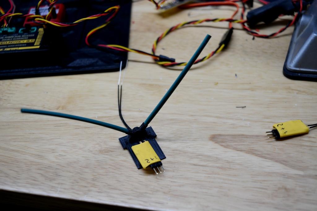 Also you can see the super tiny receivers to be used in the Dalotel, these are full range 16 channels each, one will be used and waiting for the other one , same physical size but also incorporates full telemetry. I made a 90 degree whisker antenna holder , actually made a bunch while at it . These small receivers work with SBUS only into a 16 channel redundancy buss which powers the servos, but also will be using the Spirit pro autostabiliser but to do this with the heavy duty servos , I will use again the Fiber optics with its own power , The power switch from the read instrument panel, will operate all 4 failsafe electronic switches , each with a 65 amp Mosfet , so no over heating. Once all done on the electronics, I will post photos if anyone interested.