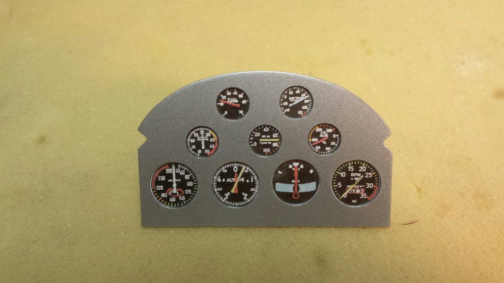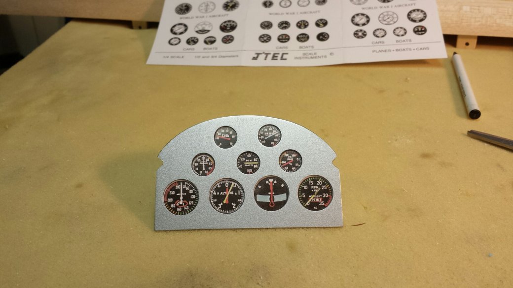 I painted the panel with a spray can then glued the thin clear plastic that comes in the J'Tec kit to the back side with canopy glue. I then glued the paper gauges on the back of that with a glue stick. Before I mount it in the plane it will get a thin piece of ply on the back, probably 1/32"