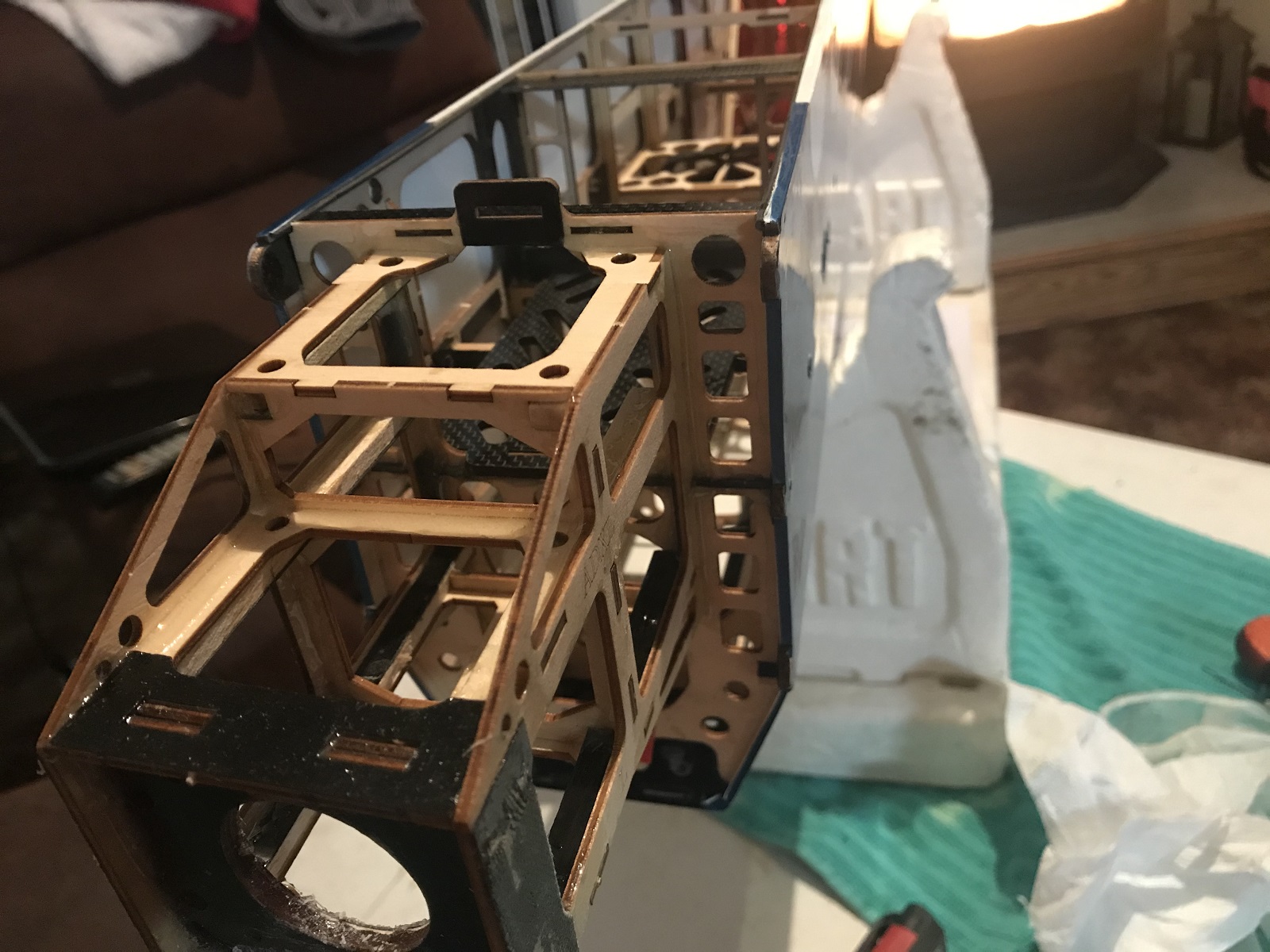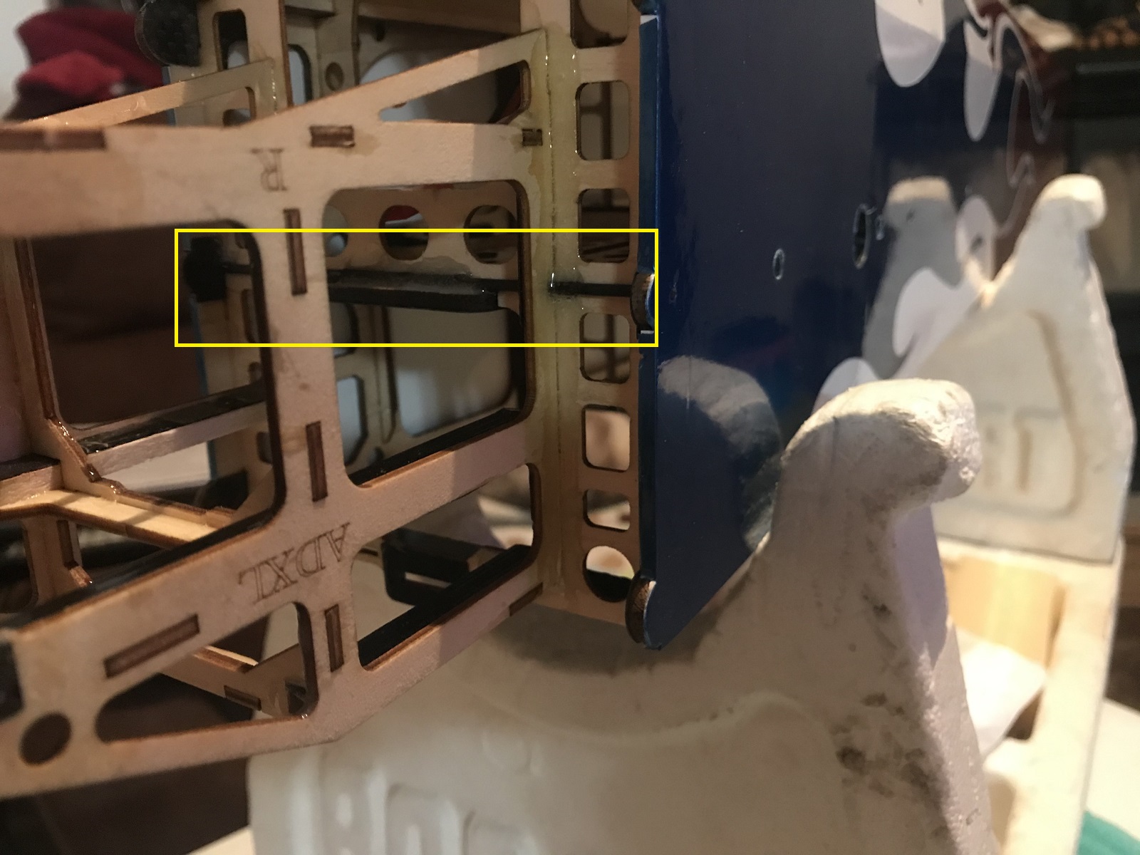 After test fitting the motor box, I found that the carbon rod that goes in front of the former is impeded by some glue holding the battery tray in place. I had to remove the glue before permanently gluing the motor box on.