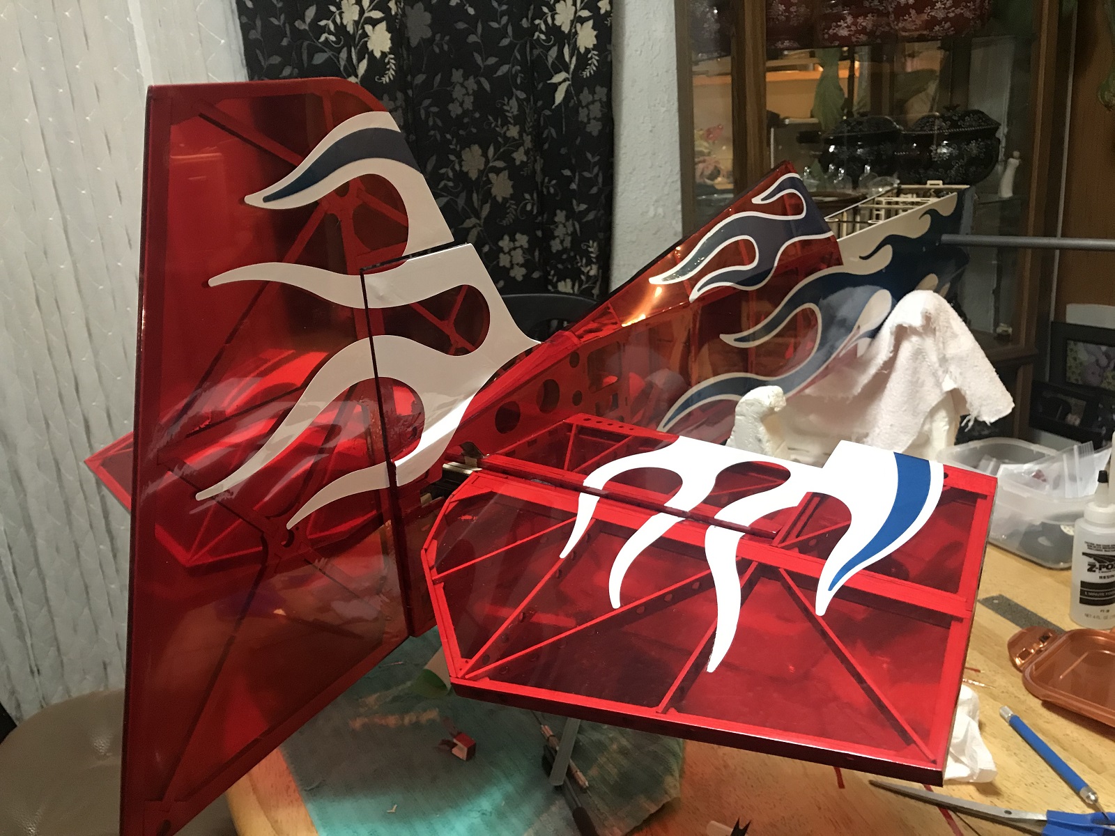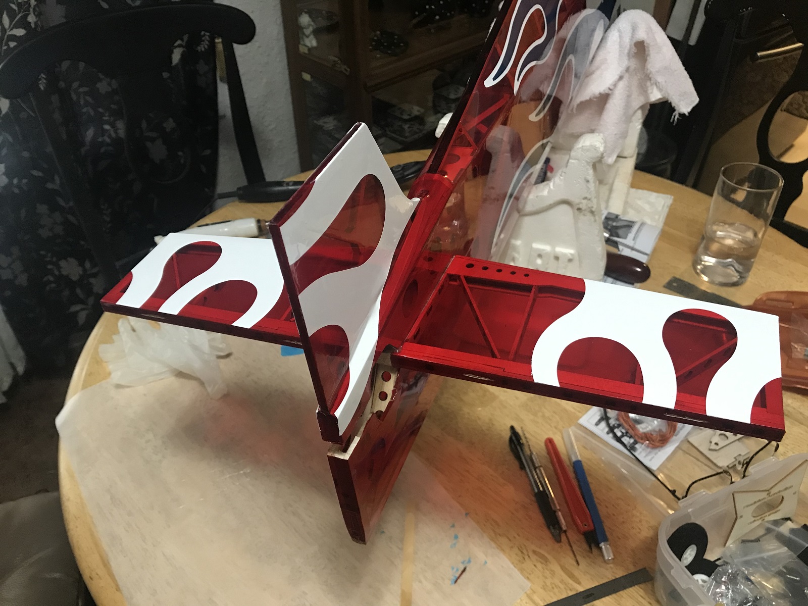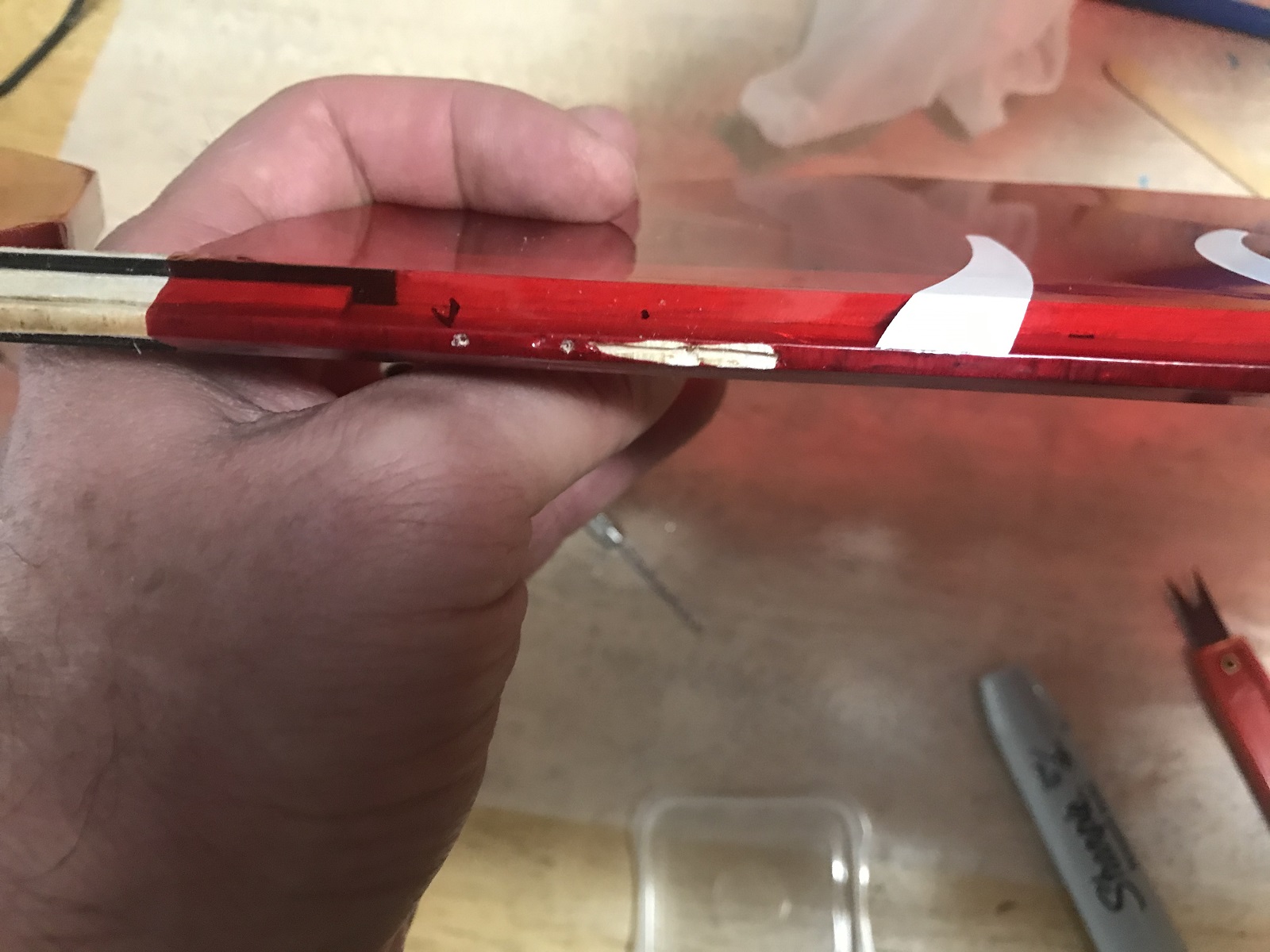Next I got the elevator in. First pic showed how far I had to adjust a couple of hinges from the original slot. The sharpie mark is where I had to move them. Then I sealed the gap with the supplies covering.