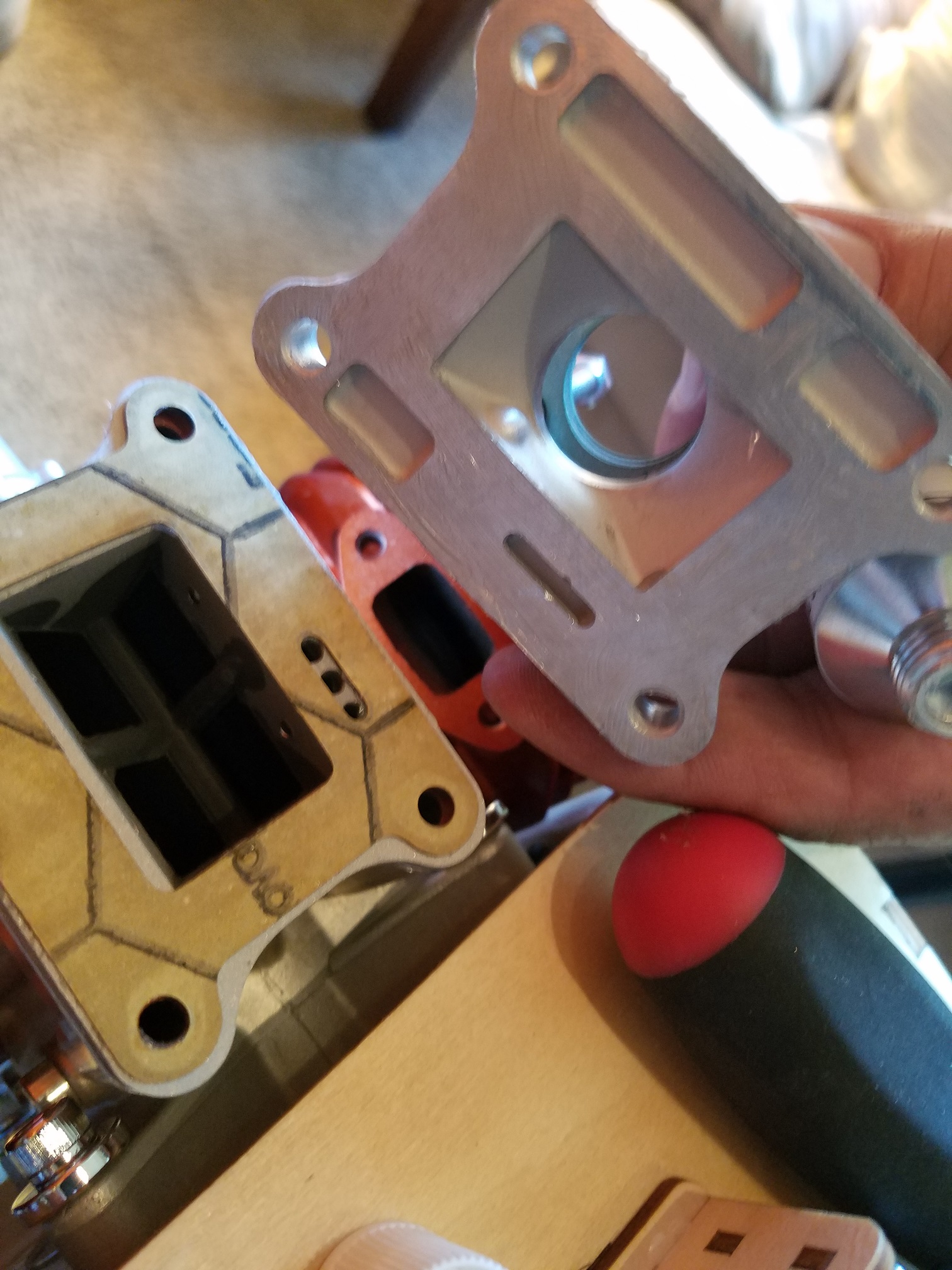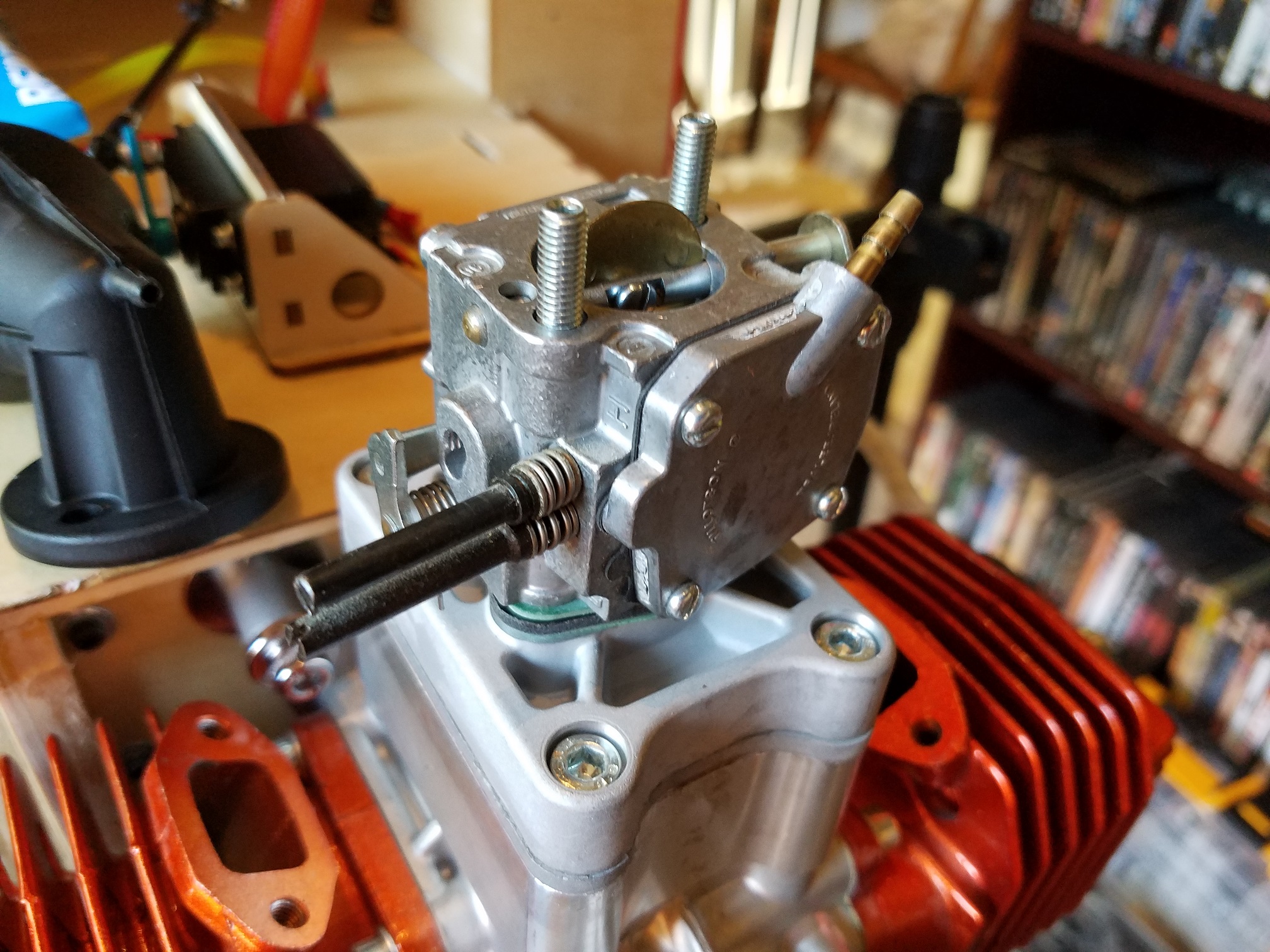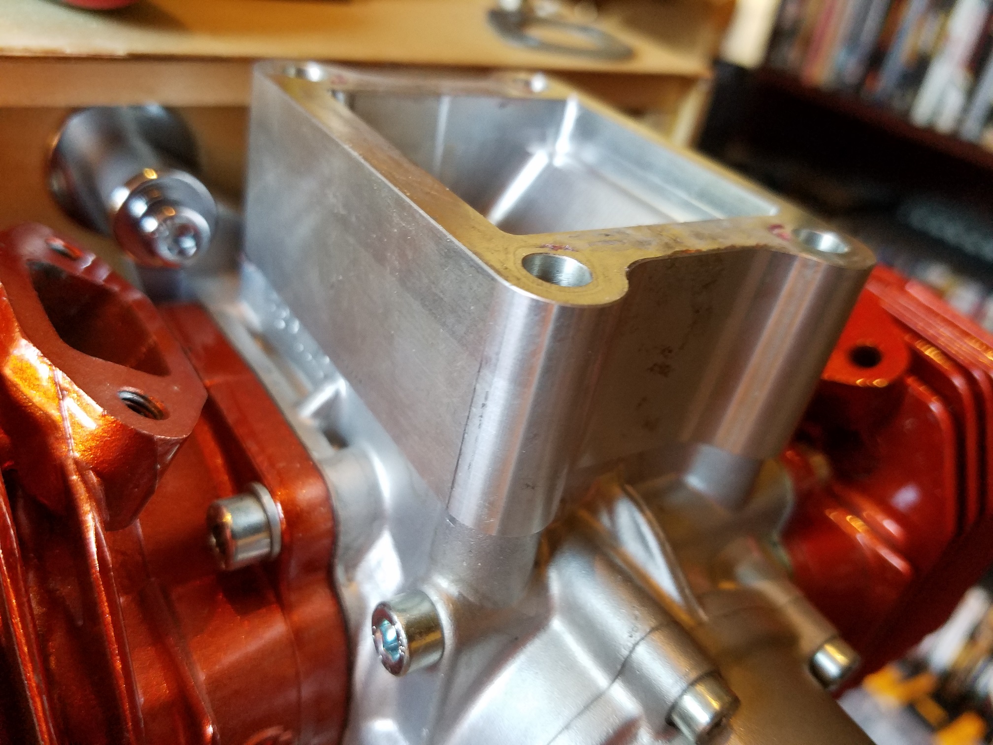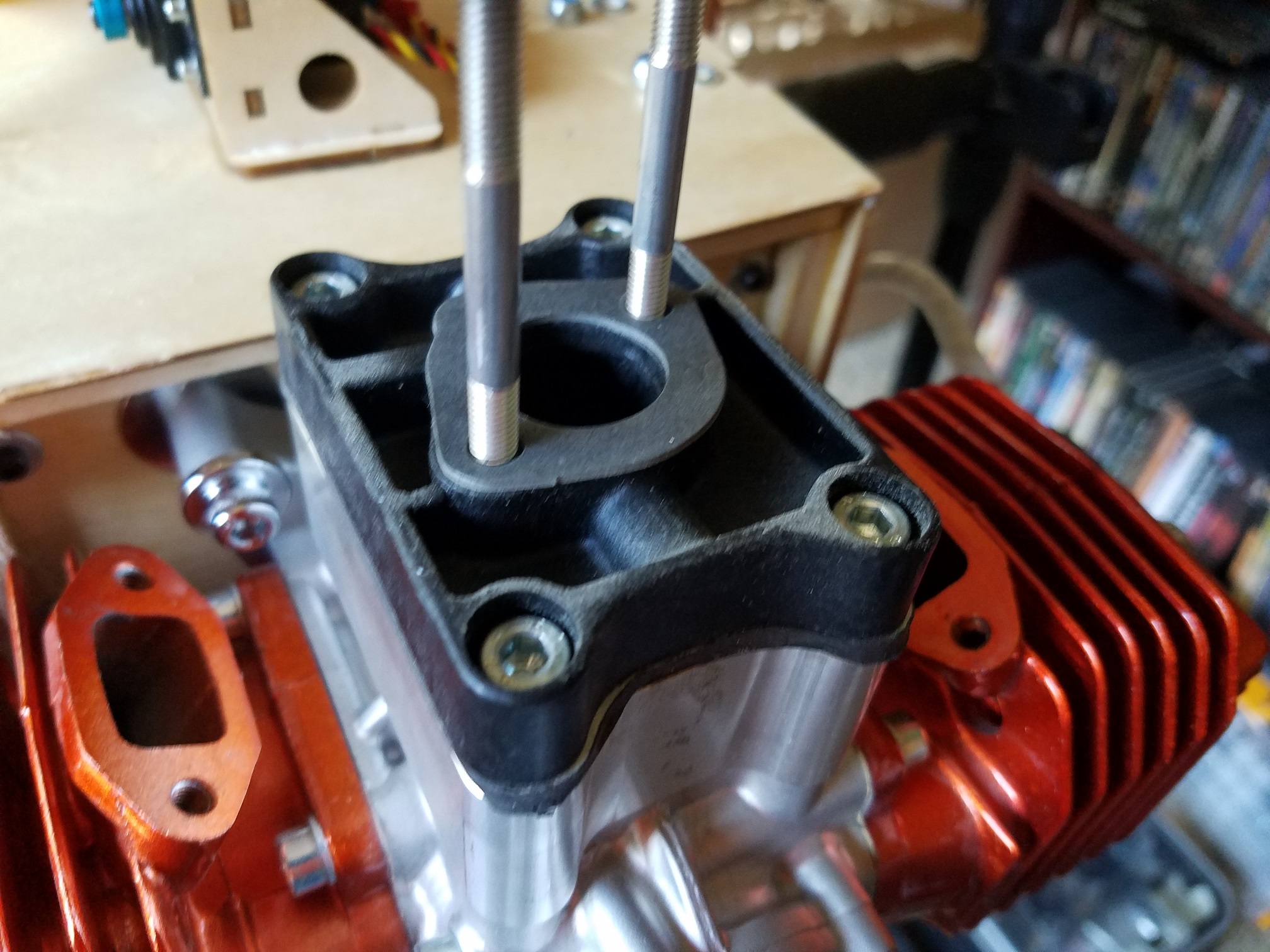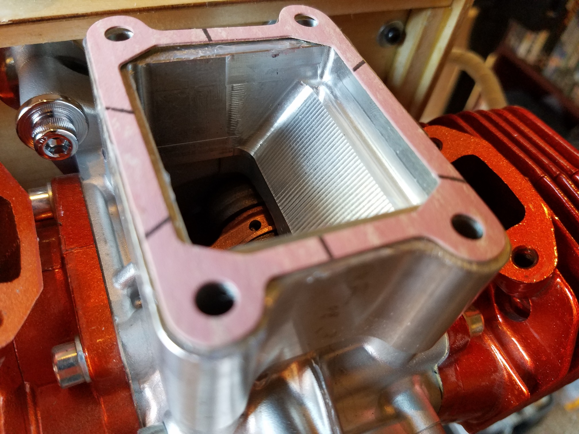 Installation order: Engine case, corresponding gasket. Aluminum reed block, corresponding gasket. Updated aluminum reed cage, corresponding gasket. Aluminum carb base, carb base gasket, carb base insulator, carb base gasket, carb. (Note the arrangement of the pulse ports)