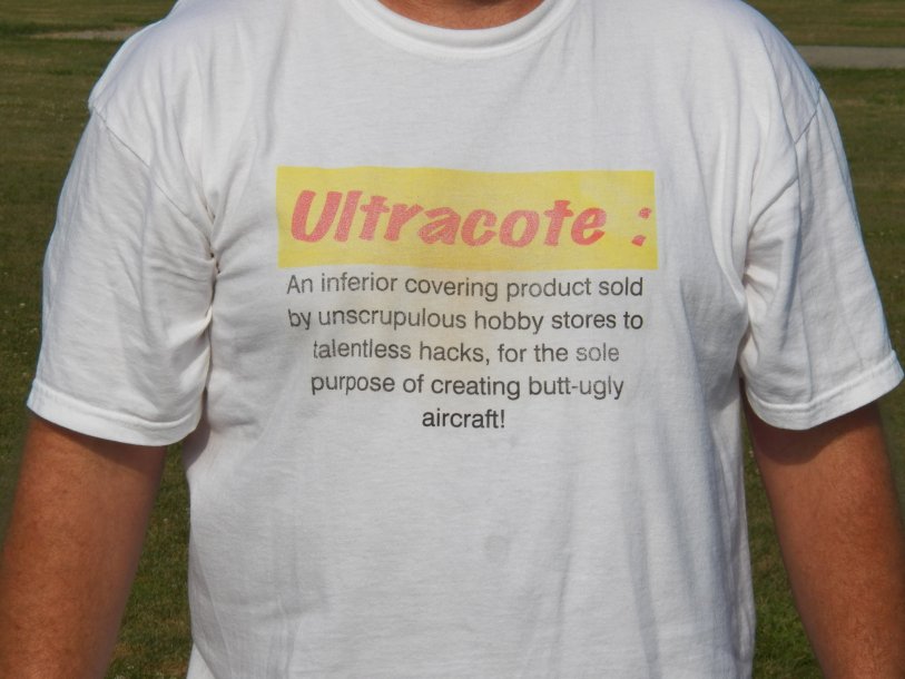 A bit of humor for those who prefer Monokote to Ultracote. My friends opinion of Ultracote so he put it on a shirt.