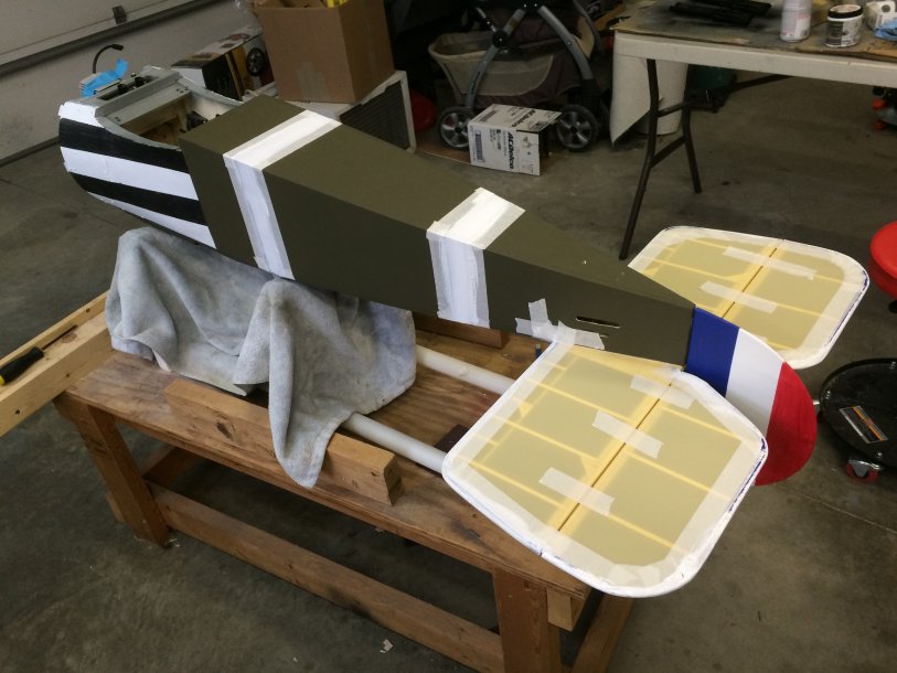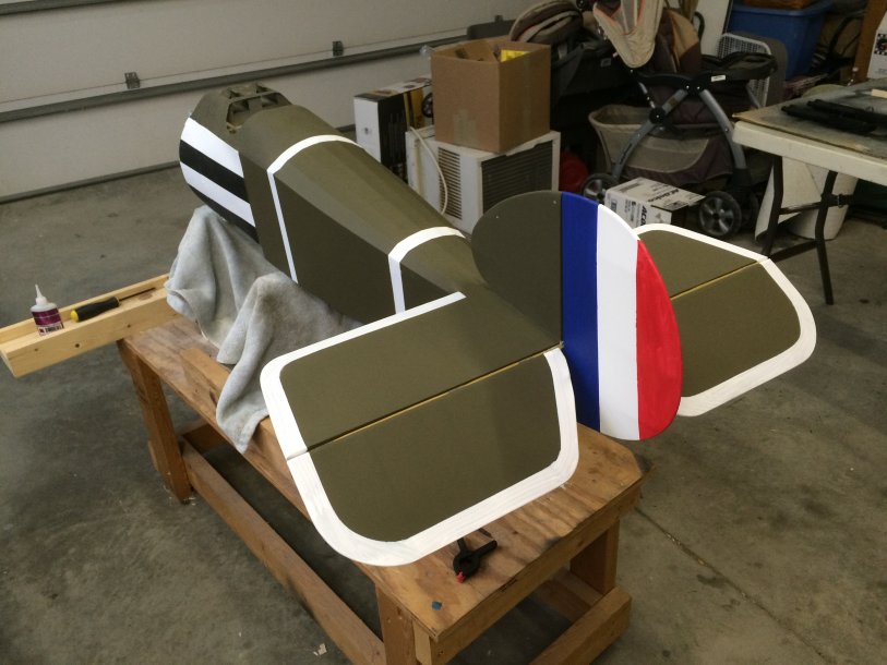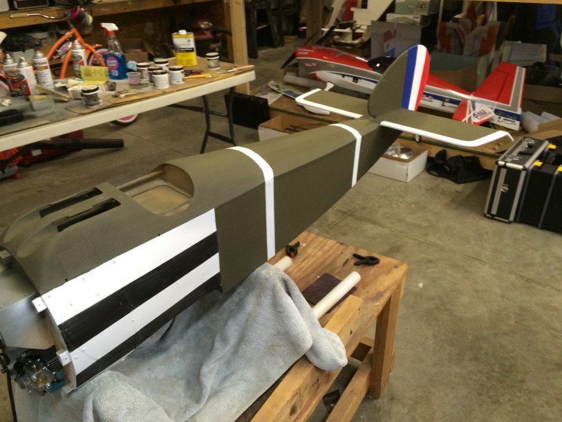 I'm in painting mode but don't have stencils. So I started hooking up the tail servos and installed the bracing wires on the tail. Found 2 problems along the way. The Ruder warped and it's real flexible.I'll have to un cover it and check it out. Hope I don't have to make a new one. The other problem is with clearance for the muffler. THere isn't enough. I'll have to decide what to do with that after I fix the ruder.