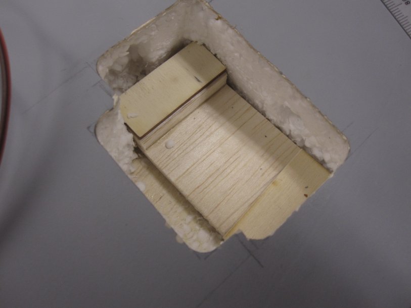 I hate the look of servos hanging out of the wing (and also the geometry of the linkage), so I want to turn my aileron servos on their side and then cover them. I've also never built a foam cor wing before. Take a look at the photos attached...I made some mounts as pictured. There is nothing to mount this to except the balsa sheet which is the top of the wing, and the surrounding foam. Since it is foam, I think the best plan is to glue this into the wing with Gorilla Glue since it is similar to the foam and I think that it will make a better bond than Hysol. I could also build sides to make it more like a typical servo box which would add more glue surface area.