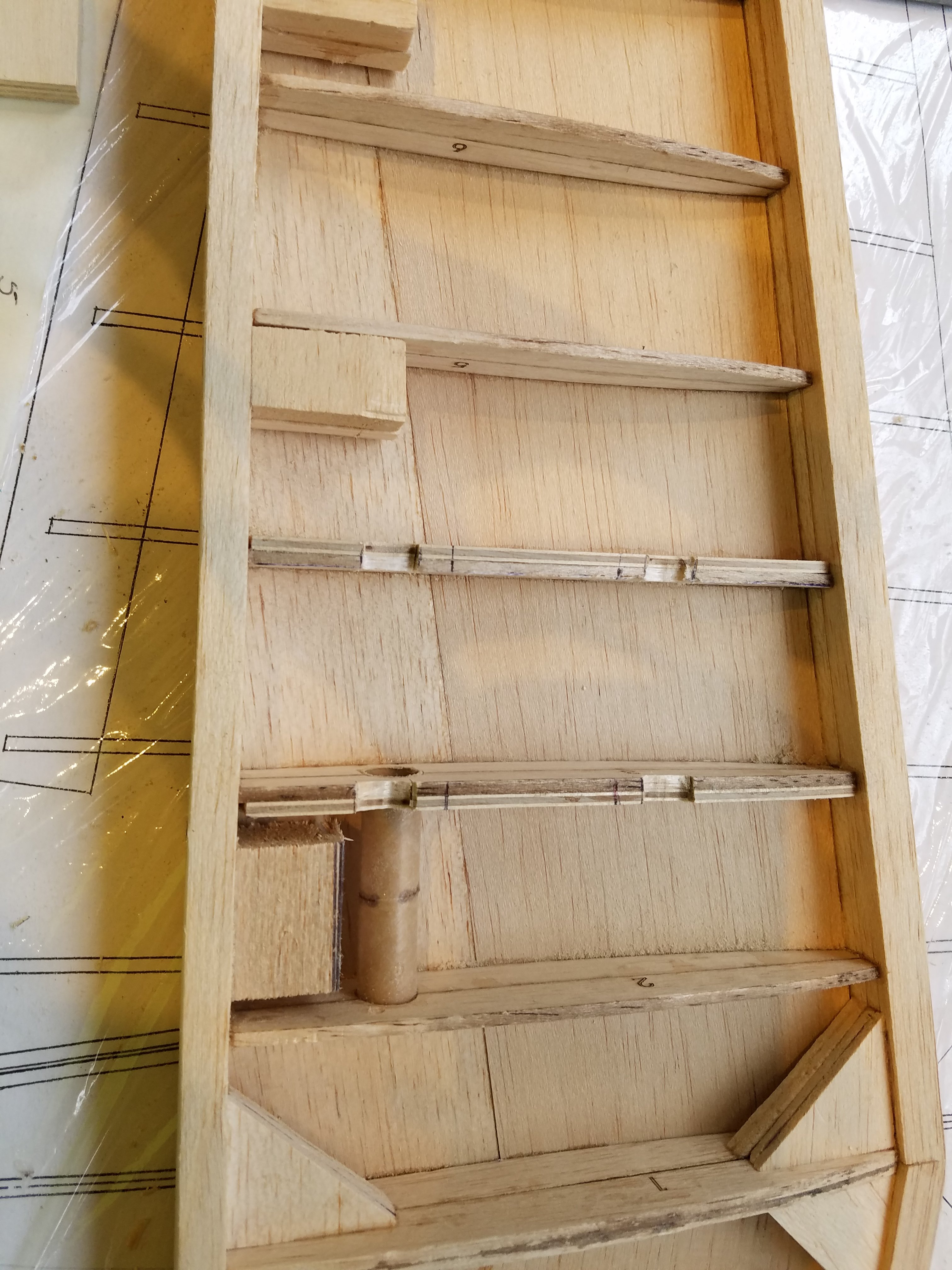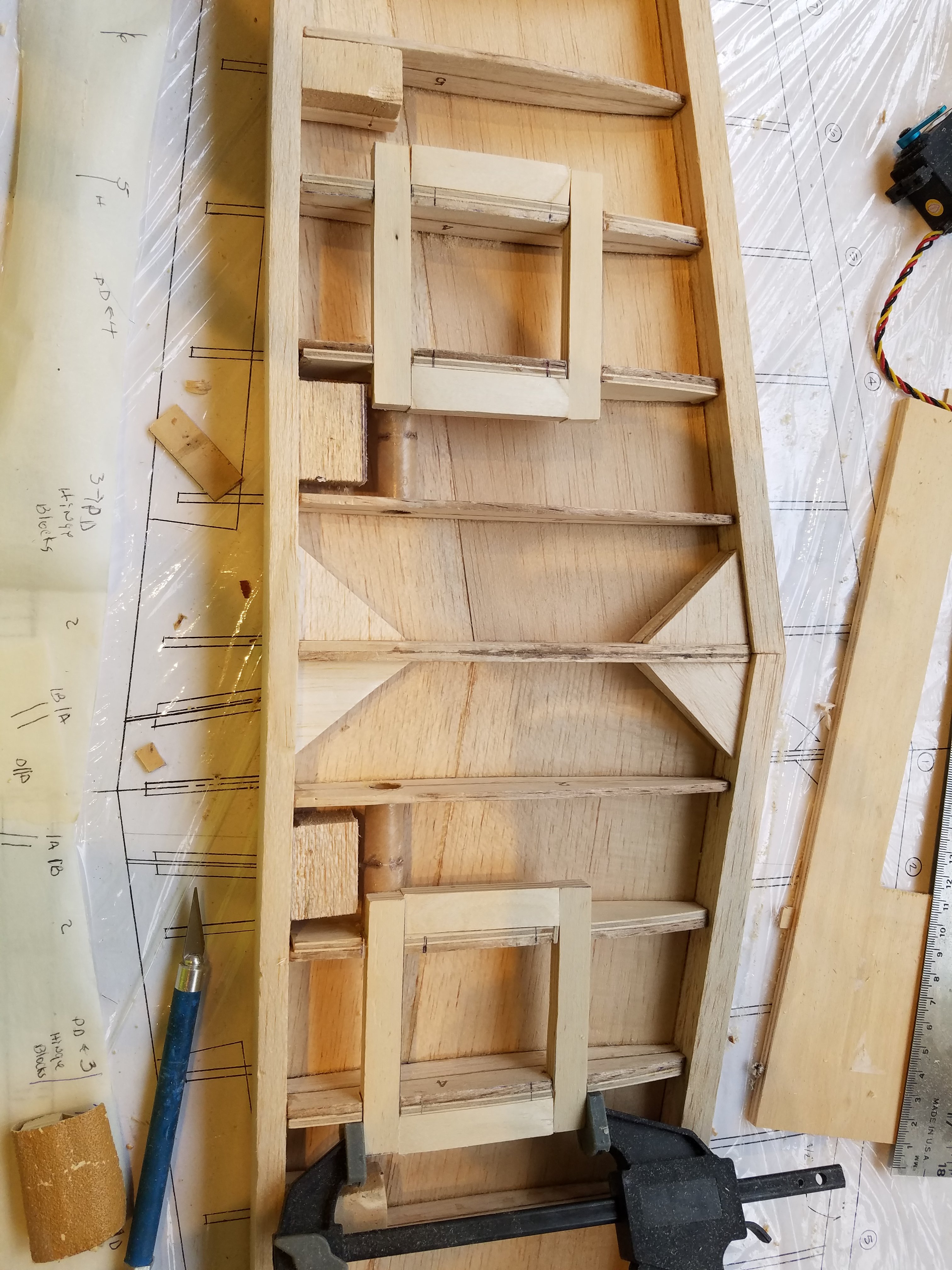 I have the two doors now laminated and under the press. This gives me some time to do the border sheeting and start sheeting the bottom of the stab/elevators.