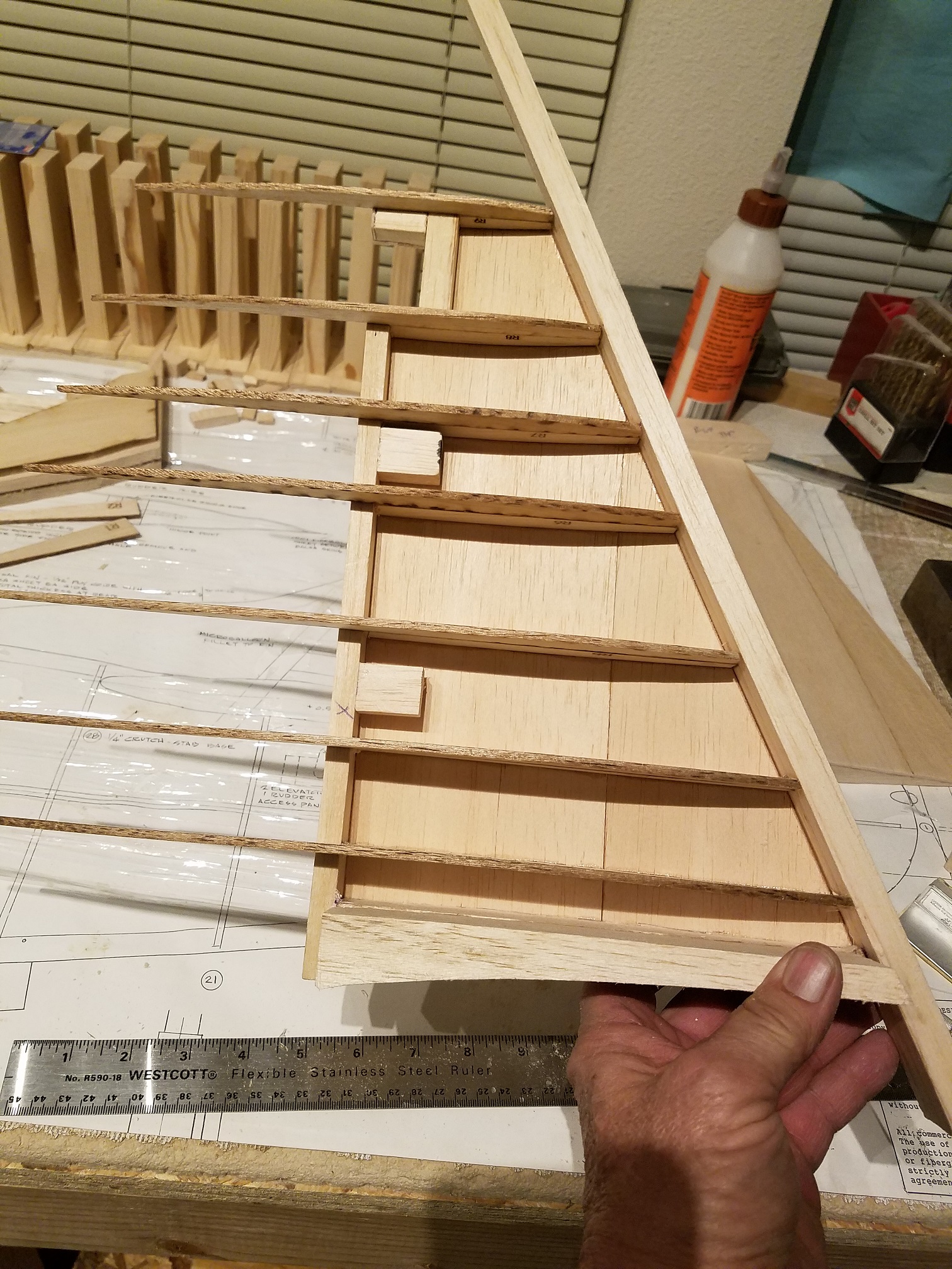 There have been a lot of things about this build I just do not understand why they were designed to be built the way they were. Namely for example, the hinge point blocks. According to the plans, a half of a hinge block is glued in to each side of the assemblies. When the other half of the two components are glued together or, for the lack of a better term...assembled on top of one another, everything is supposed to come together. I think it would have made more sense to put full blocks in place. Yes, I already know what some of you may be thinking. So, why didn't I do it that way? Simple, I am trying to go "exactly" from the plans. I know me well enough to know that when I start altering construction methods, too much weight gets inadvertently added. Suffice it to say, everything aligned up perfectly. I gave the structures a little "twist" once all the sheeting was in place. Talk about strong. I could not put any form of twist on either the fin or the rudder. I suppose if I really tried, they would both break quite easily. But that would not be normal "torsional" stress the airframe will endure under normal flight conditions.