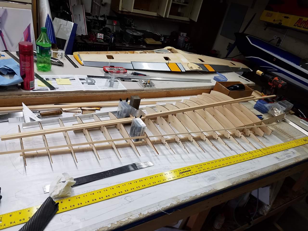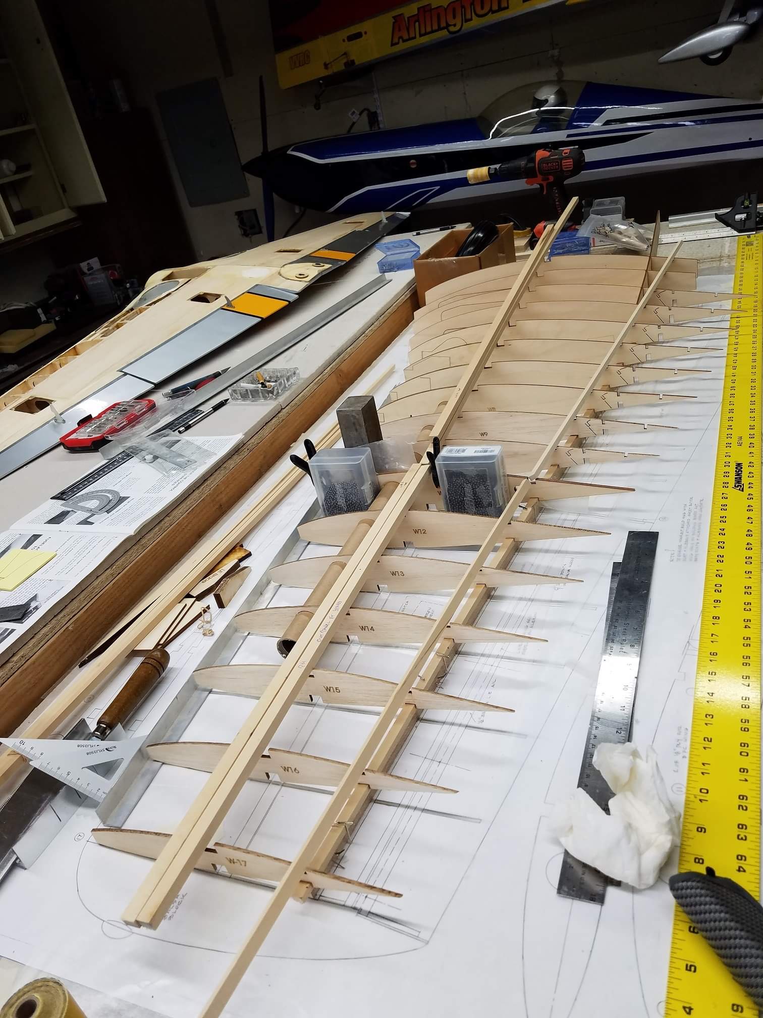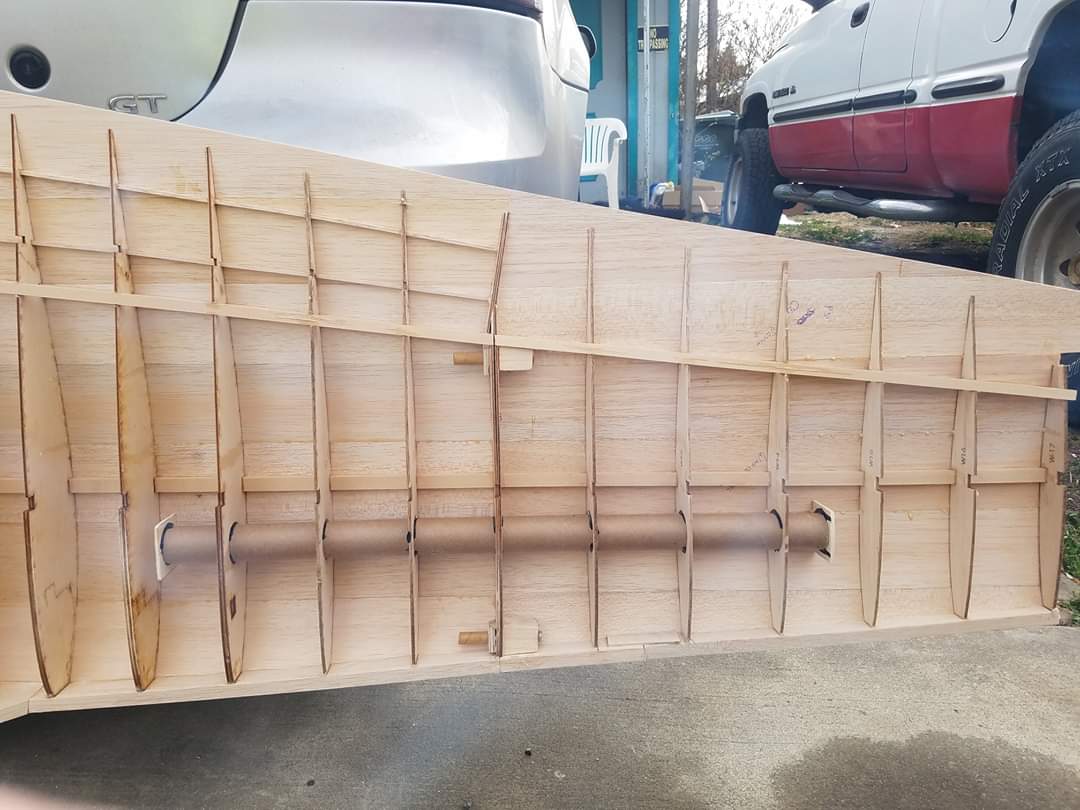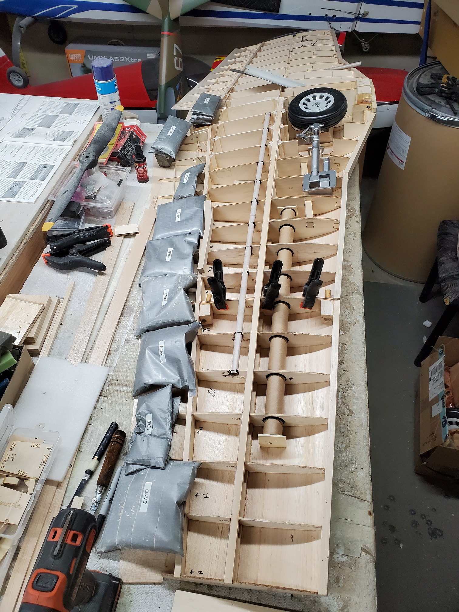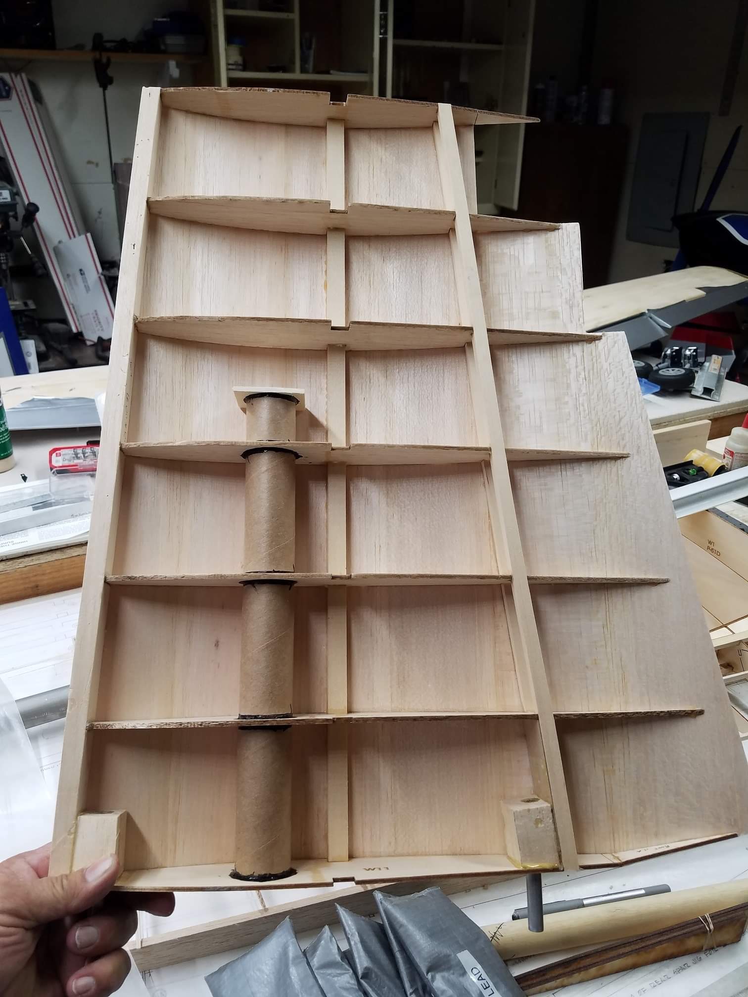 Sometimes life just gets in the way. Hey everyone... I took a little time off to get some fresh air. That didn't work. I ended up spending more time at work than doing anything else. And of course the Big Don Smith Mustang has sat in the corner...(many corners actually) for the last...what's it been? Almost a year? Geez... How harsh can I be? The Giant Scale Top Flite P-40 got glassed and painted and the Roto 85FSI installed. Runs like a finely jeweled watch. I just haven't had the time to take her out for a maiden flight. Hopefully in the spring. In the meantime, I found a minute to look at the Behemoth Stang. Funny how things happen for a reason. In the course of sitting around collecting dust...(literally sanding dust) I noticed the wings had been bumped a couple of times and in as much, a couple of the ribs were cracked. I decided I better get them fixed before they got broke completely off and got lost. Well, that is all it took. I got back on the big P-51 a few weeks ago. And actually have made a little progress. Wiring tubes installed in the left wing, gear rails installed and gear basically set in place. Servo (aileron and flap) attachment build is next. Then to duplicate everything on the right wing and sheet the bottom of the wing. After that? Sanding....lots and lots and lots..... of sanding. Shaping, sanding...filling, sanding...blocking, shaping, sanding....UGH! LOL. I am hoping to get to the glassing sometime next month. But until then.....here's a little catch up for all of you.