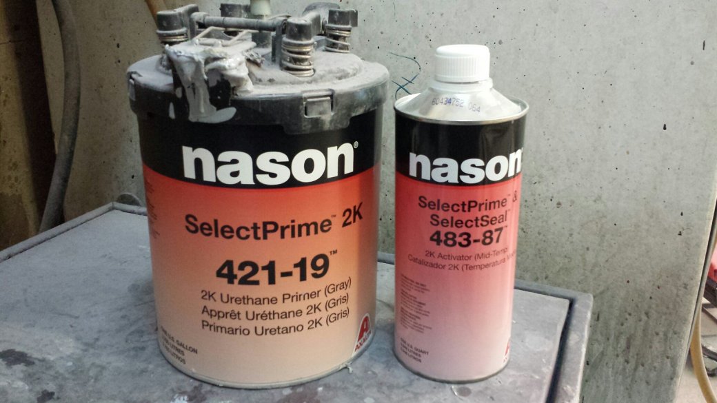 I primed 3 of the panels with Nason 421-19 2K Urethane primer mixed 4:1 with 483-87 activator and reduced 10% with 441-21 reducer. I primed the other three of them with Nason 491-16 Epoxy primer mixed 1:1 with 483-19 catalyst. After letting them cure overnight I sanded the primer with 320 dry then 400 dry then 600 wet.