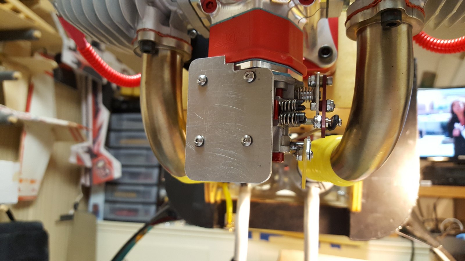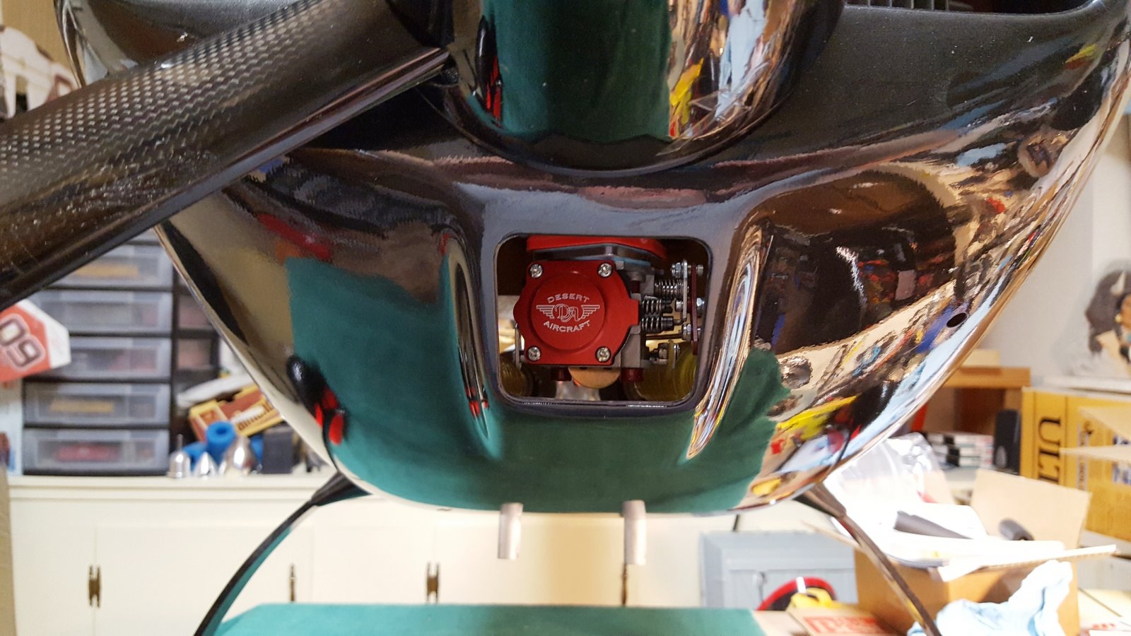 Last night I squeezed the airplane back into my workshop and got it on the bench. I pulled the cowl off to make sure everything survived maiden day, and other than one Teflon coupler leaking just a bit it all looks great.