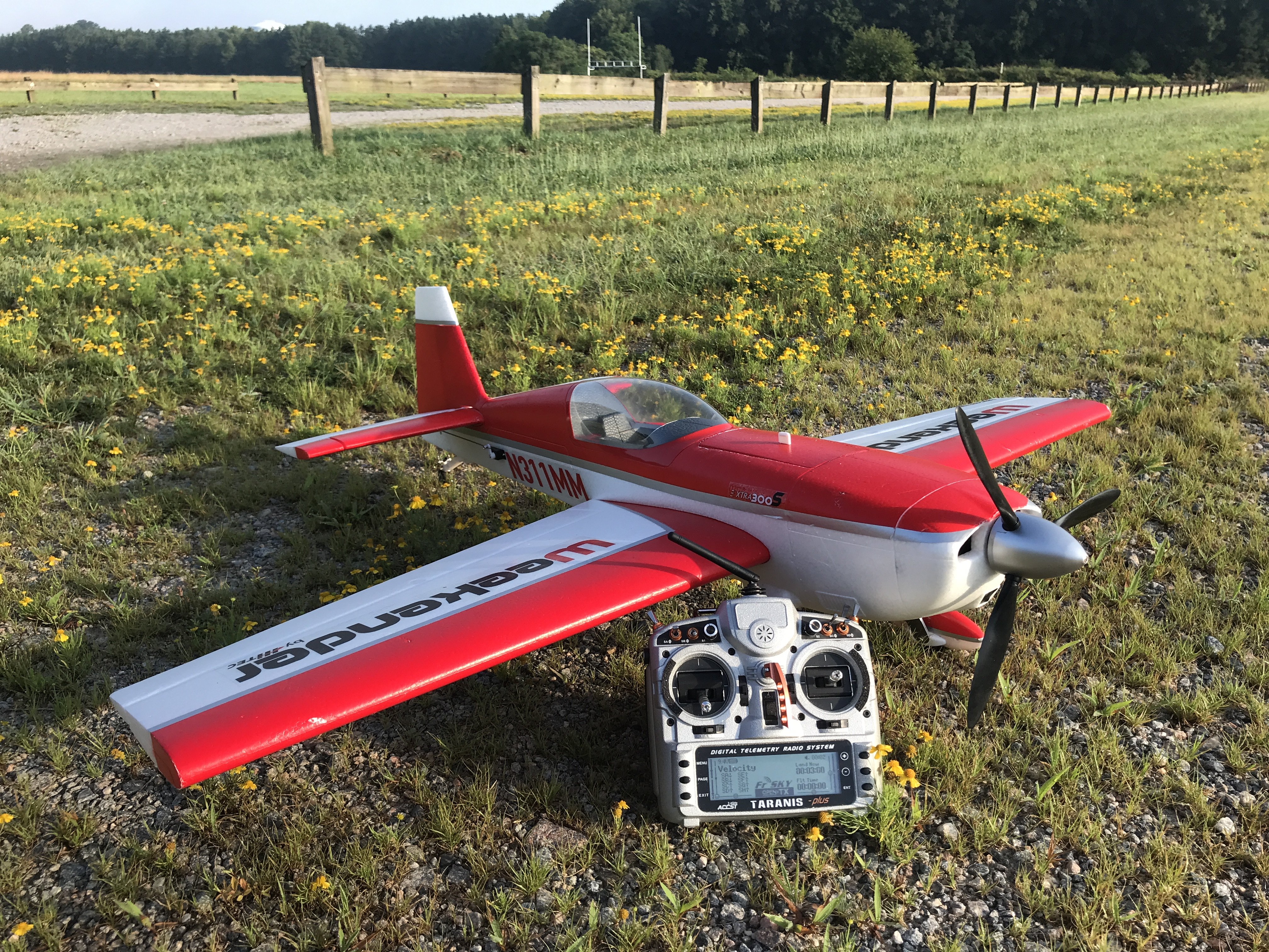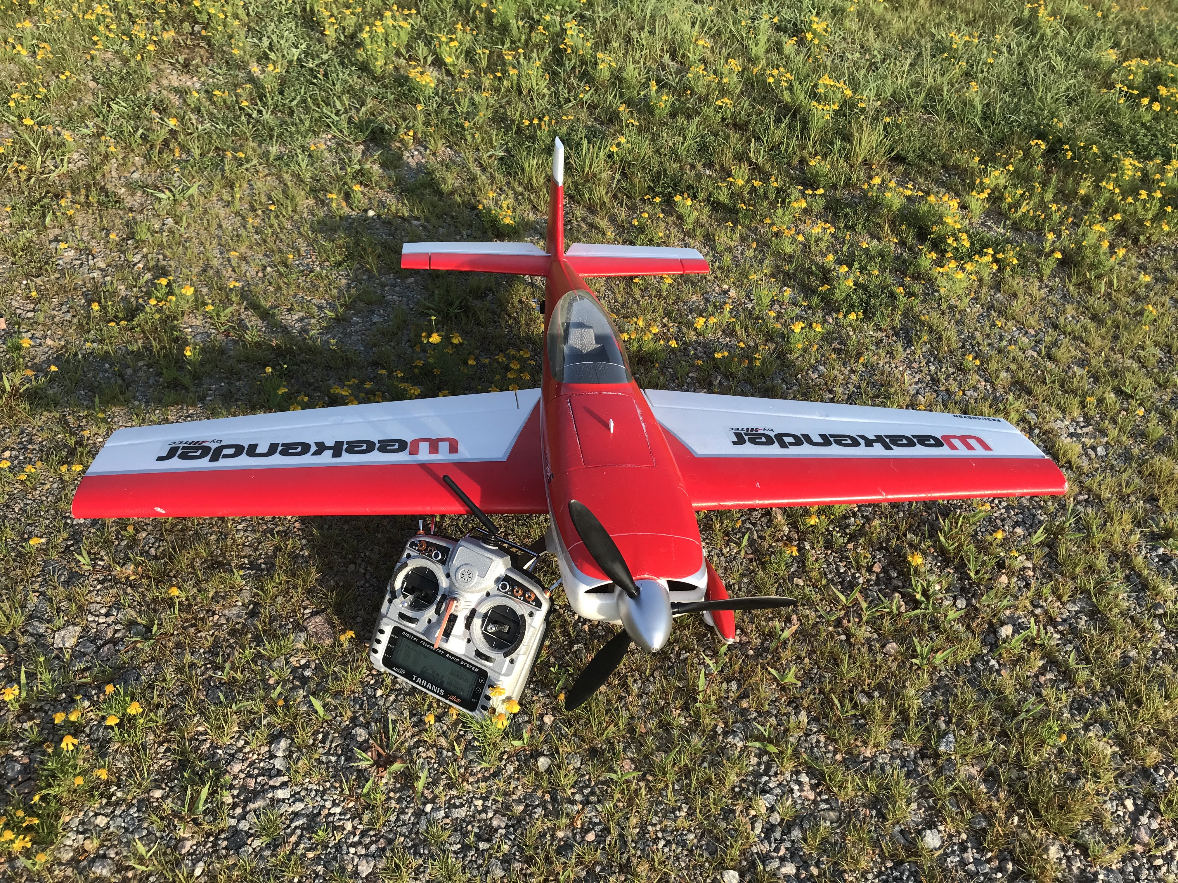 Now to the rough part. Bringing it in to land did a couple approaches to feel out the plane and it does need a little speed. Make a nice smooth touchdown but did not see the bigger rock in my path. Rock caught the right gear and basically caused the plane to do a high speed ground loop that when the gear leg bent and folded up the plane then cartwheeled causing the other damage. Will repair the gear at work today and so long as the prop adapter isn't bent then it will fly again soon. I'm thinking though the wheel pants may have to come off in favor of some slightly bigger wheels for when flying off of the grass runway at my club field.