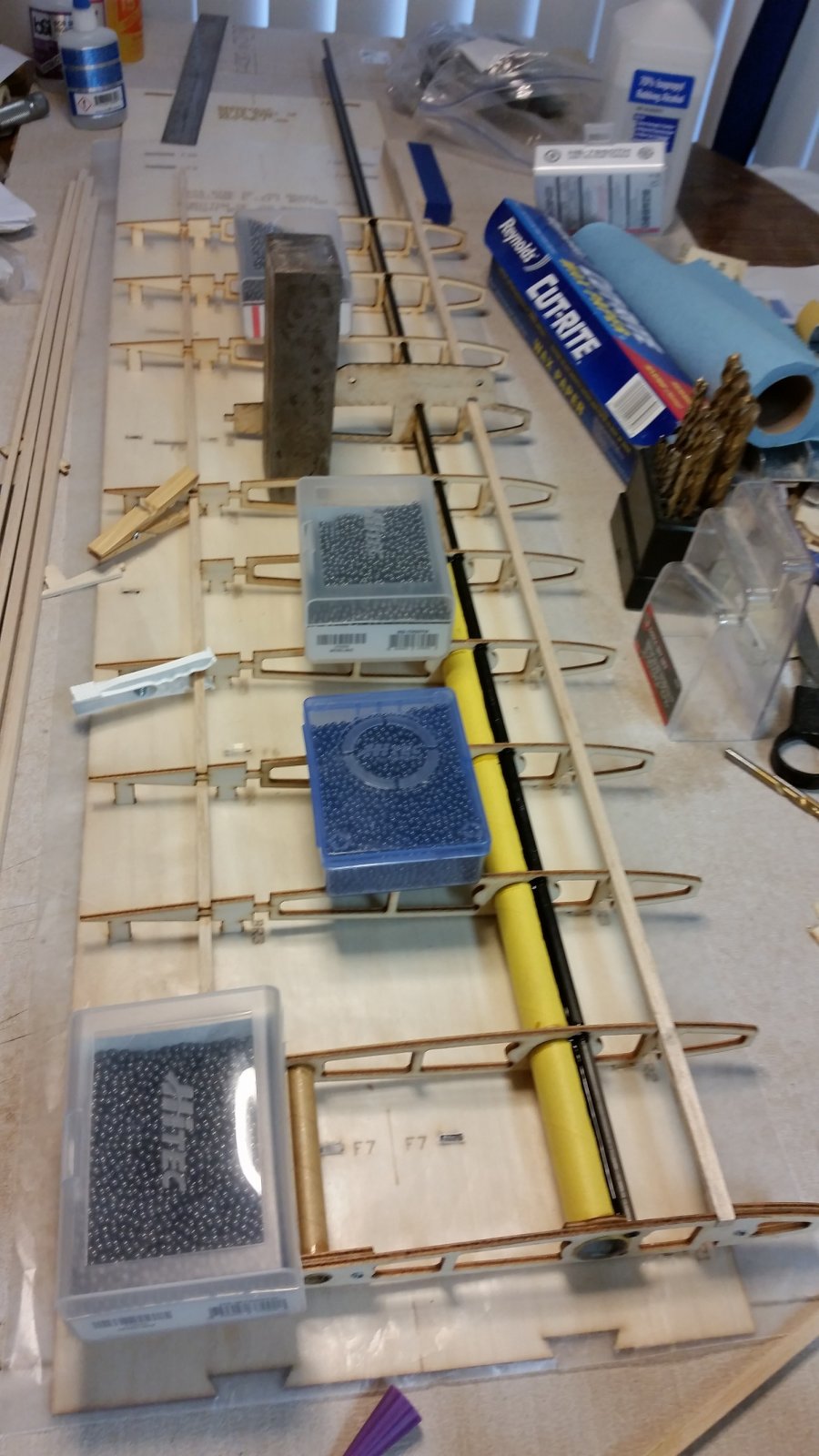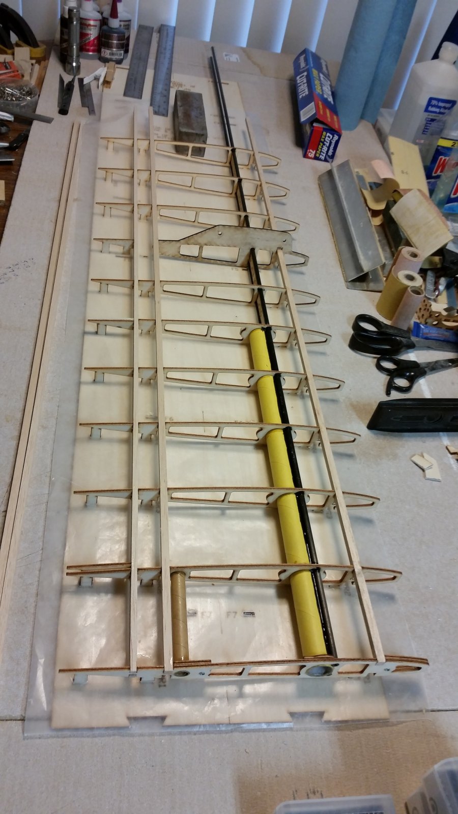 I have the basic structure of the wing framed up. Minus two of the "top" 1/4" x 1/4" stringers. I will put those in later and then begin the sheeting process. Now that I have an idea of how this thing goes together, the remaining left bottom wing and the two top wings should go rather quickly. Sheesh, maybe it have it completely framed by Sunday? What an awesome thought. LOL.