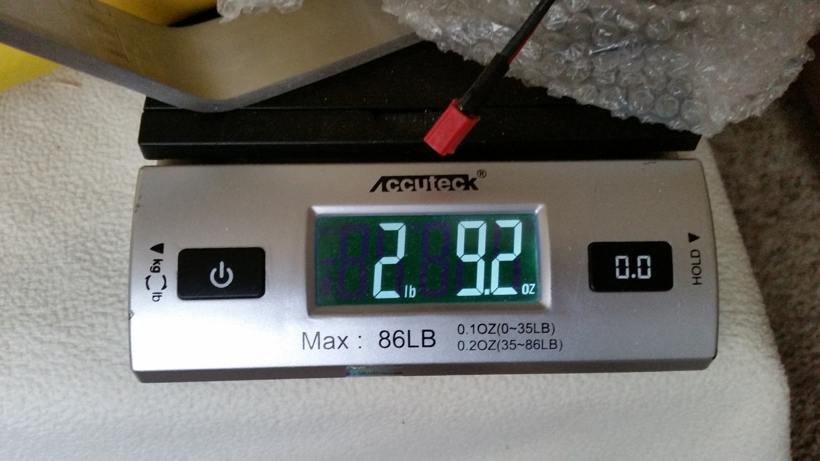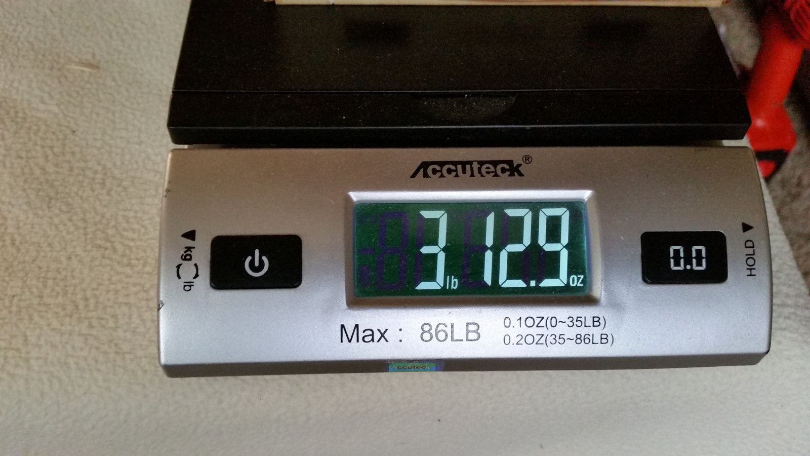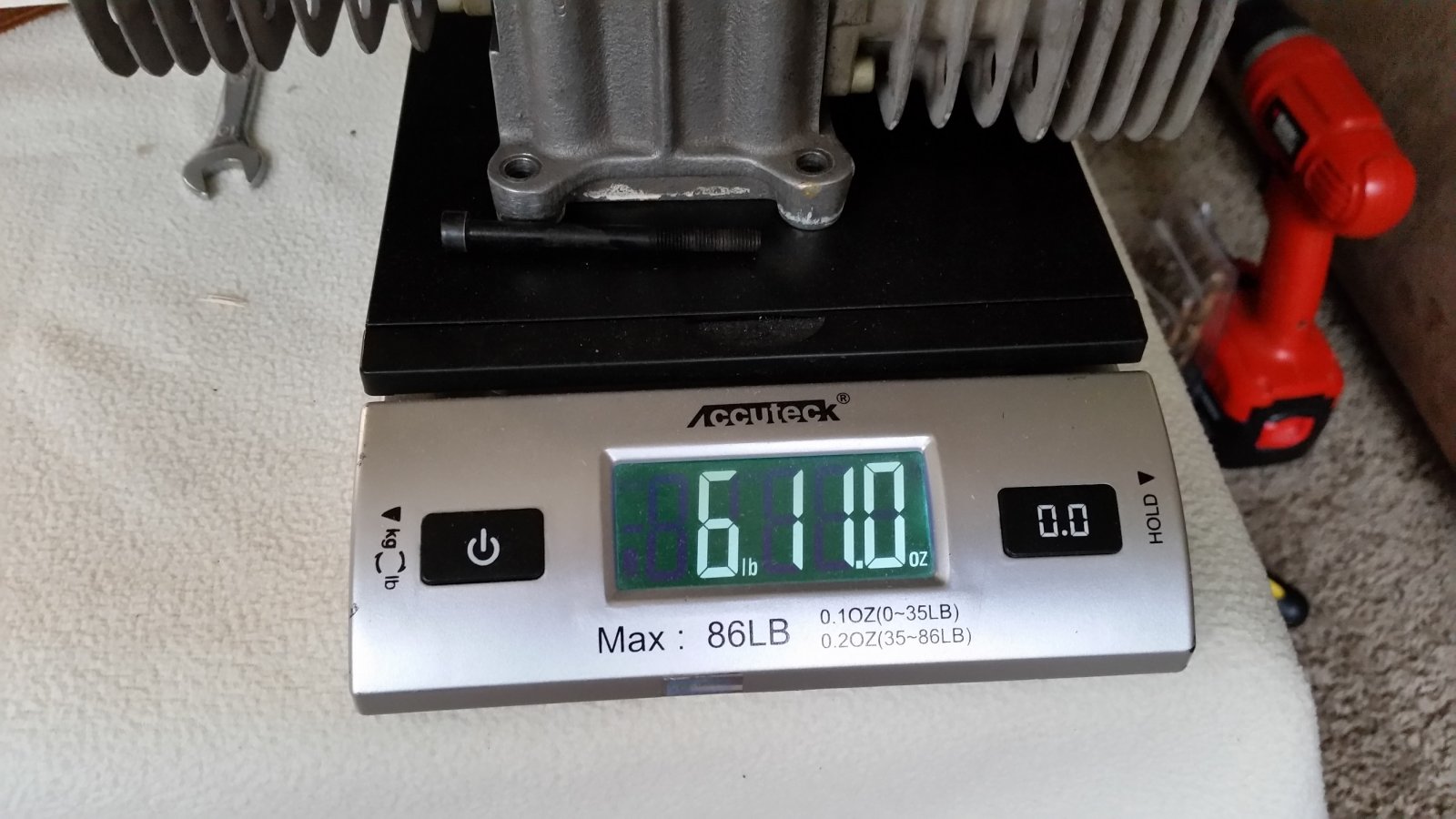 13 pounds, 11.1 ounces. I am guessing the wings are going to be a total of 4 pounds. Add to that servos and radio equipment including wiring harnesses of approximately 2.5 pounds. Then you have covering and other misc. items. i.,e., wheels, tailgear, linkages and what not....It's going to be pretty tough to keep this under 20 pounds. But still hopefully less than 25. Oh well, no worries. I be havin' a 3dub up front. LOL
