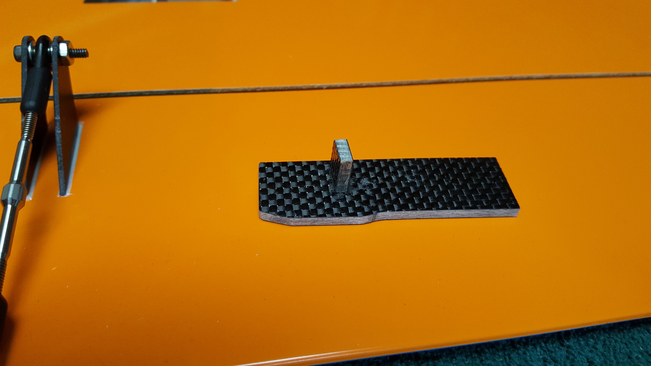 After making all the aileron servos work I didn't like the way the wing skin that the mounts are glued to flexed at full throw, so I made reinforcements to go between the upper and lower skins, and butts against the closest rib. Not an easy task to fit or glue in with the room available, but it worked out fine. I made them out of some balsa carbon fiber sandwich material that is light, strong, and easy to work with. I had to add a small square on the side to use as a handle to get them in position. I did the lower wings last night, and hope to do the top tonight.