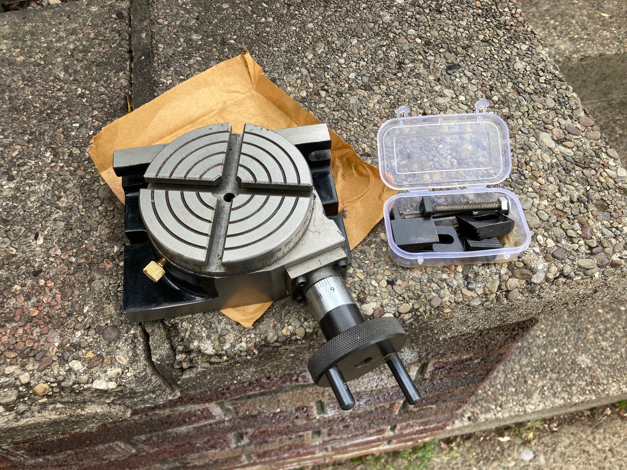 The rotary table arrived yesterday, it is a deal for $39, I might be disappointed if I paid full retail of $209 however. All in all I'm quite happy with it, heck it is only 4"! I plan to make a ring that will bolt to the table with four jack screws that will act as a four jaw chuck.