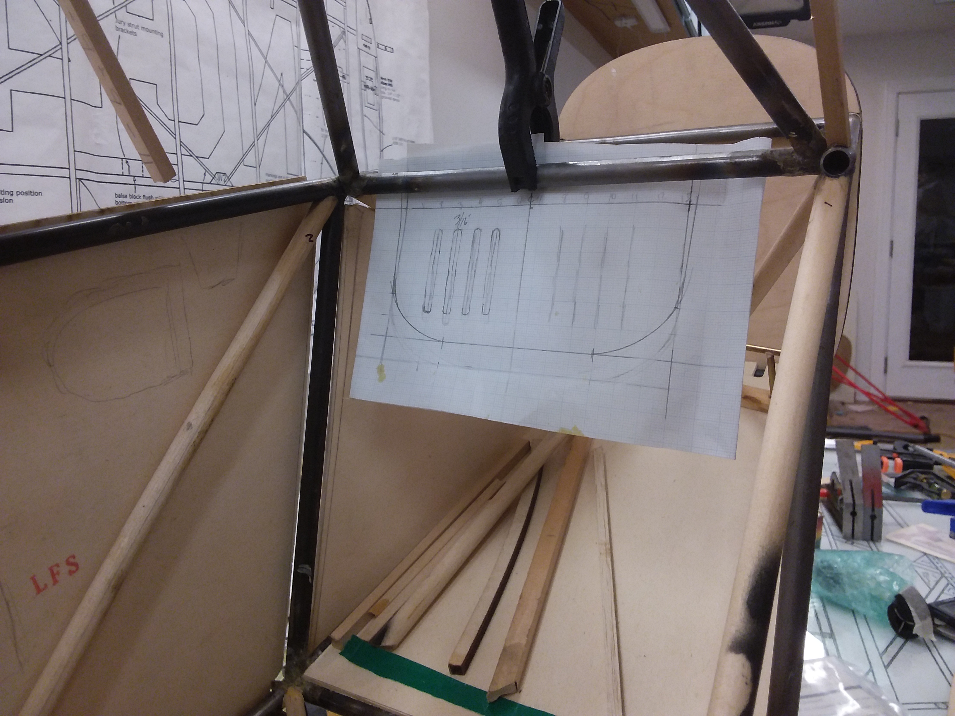 Lazy rainy father's day, thinking things through in the Cub cockpit area. Finished surfaces are one thing on my mind. Possibly a light canvas covering on all wood except for floor (stained). Either spray paint the steel and wooden dowels or maybe gun bluing on the steel.