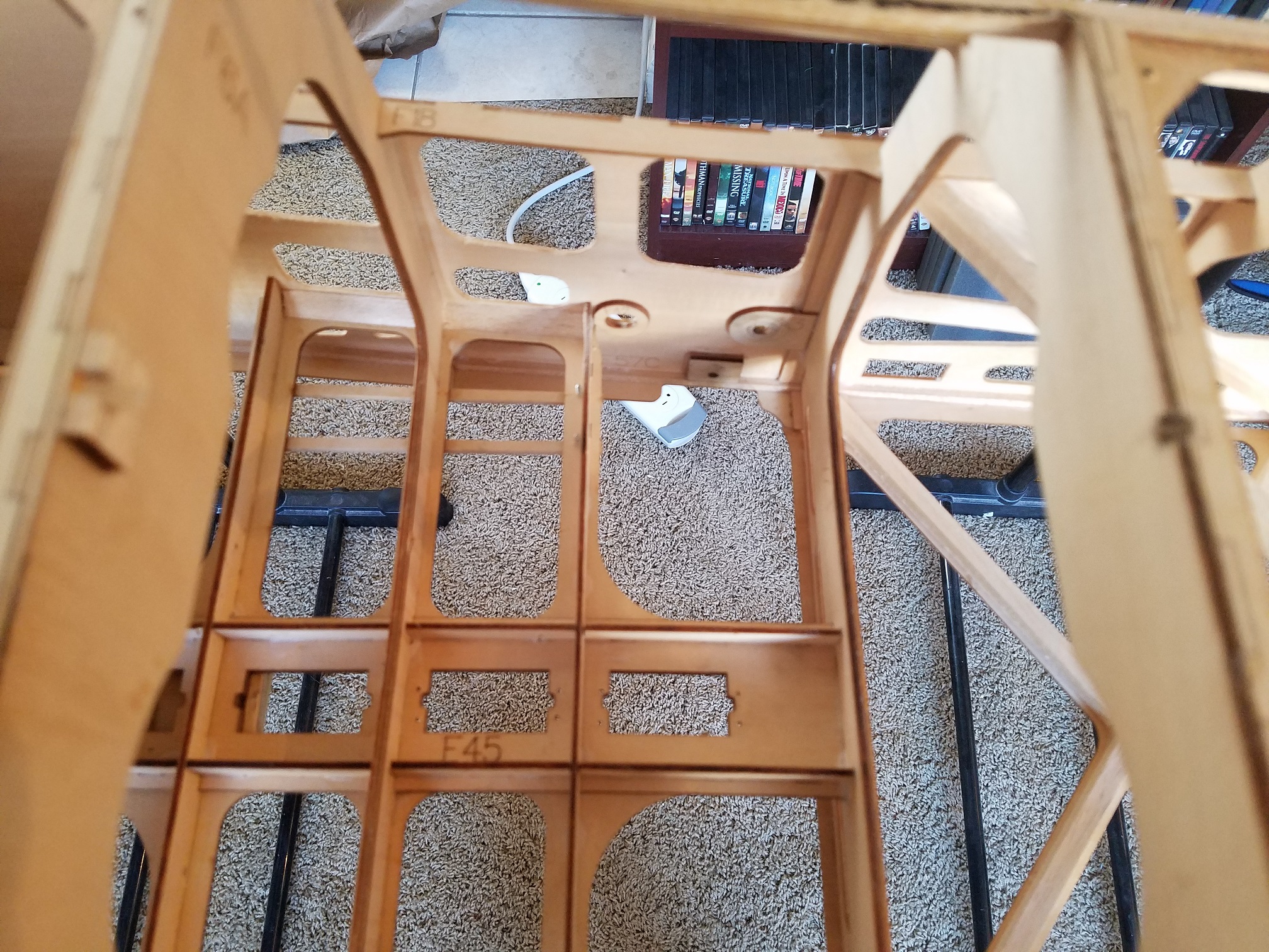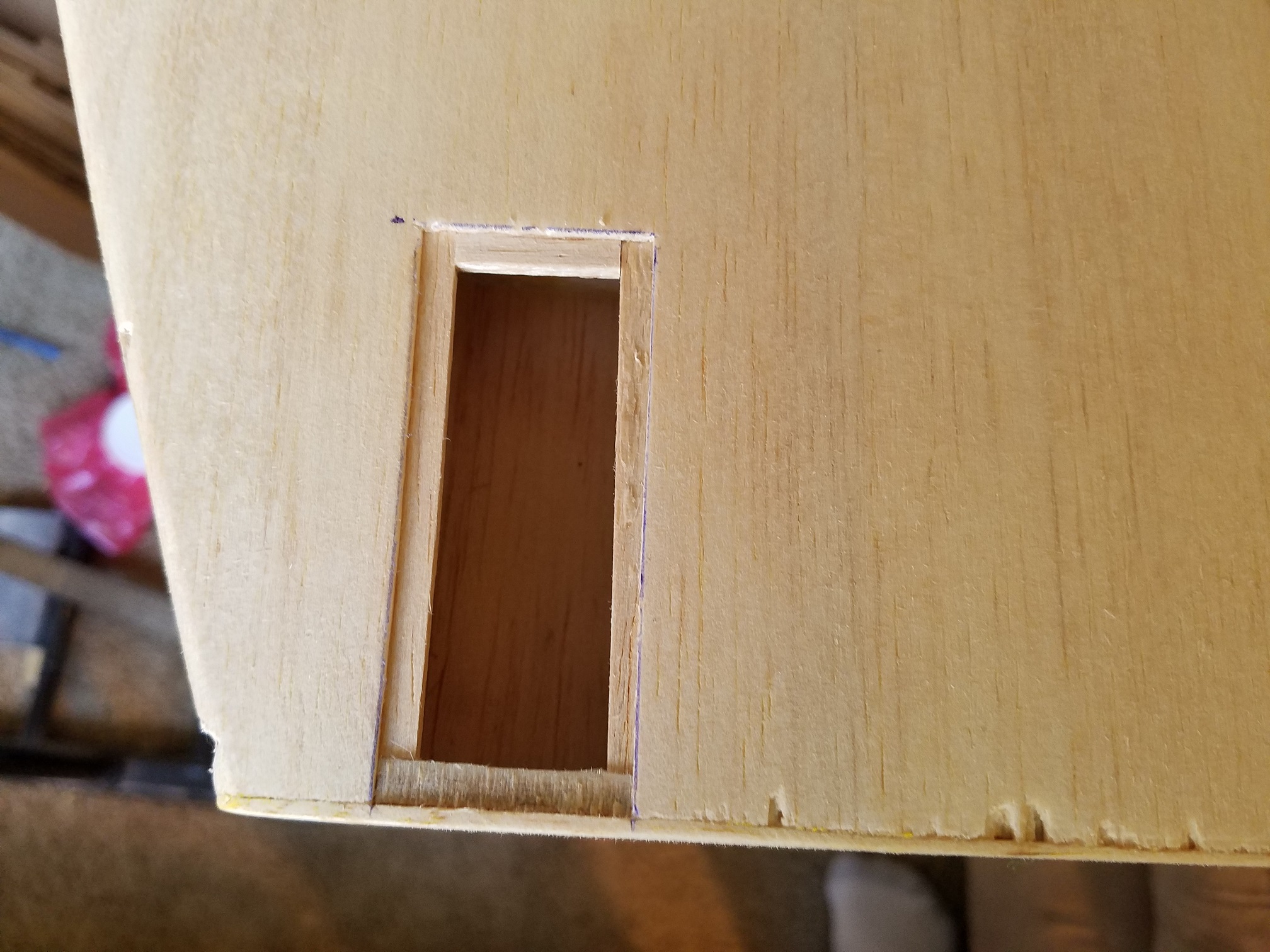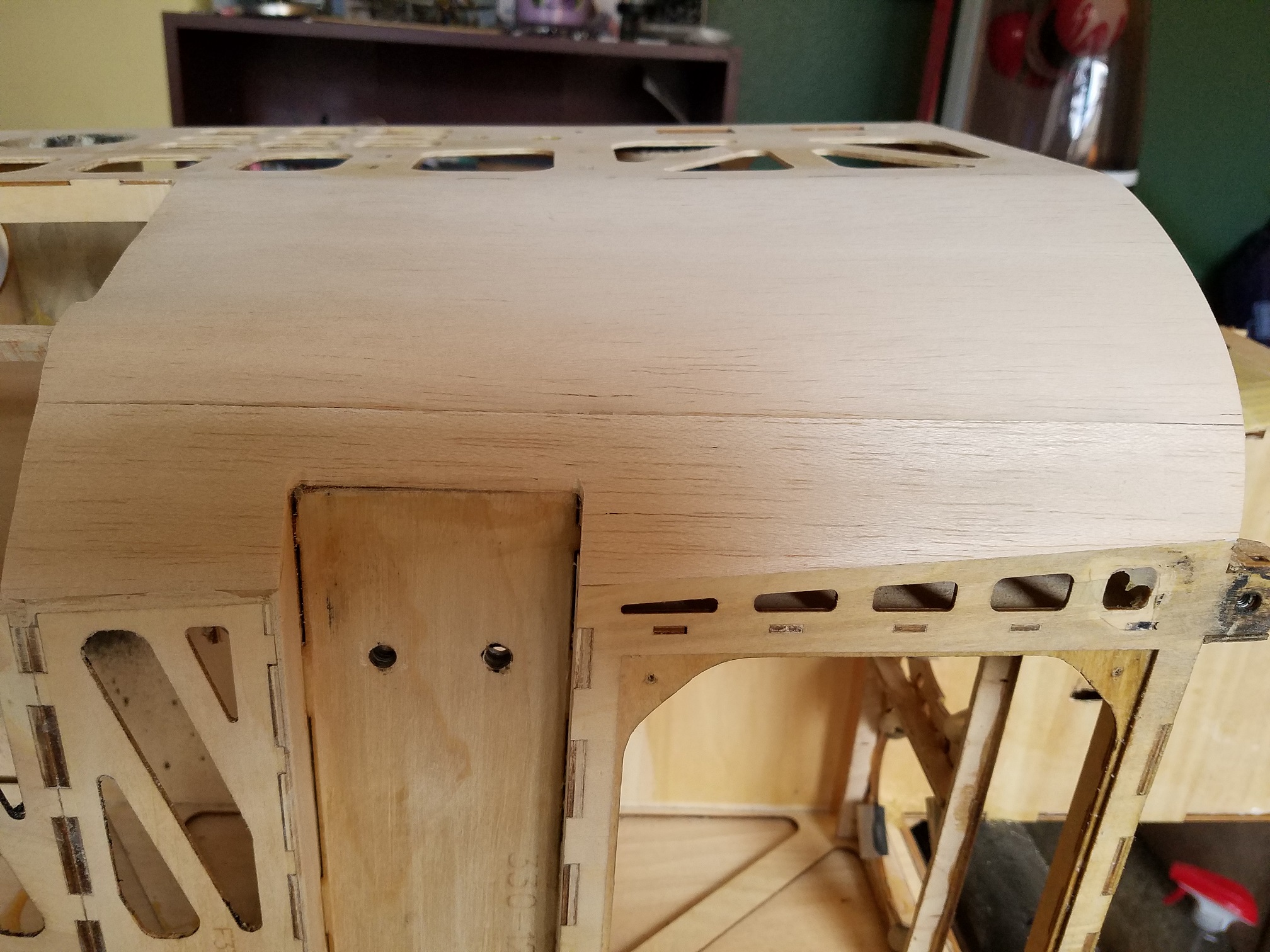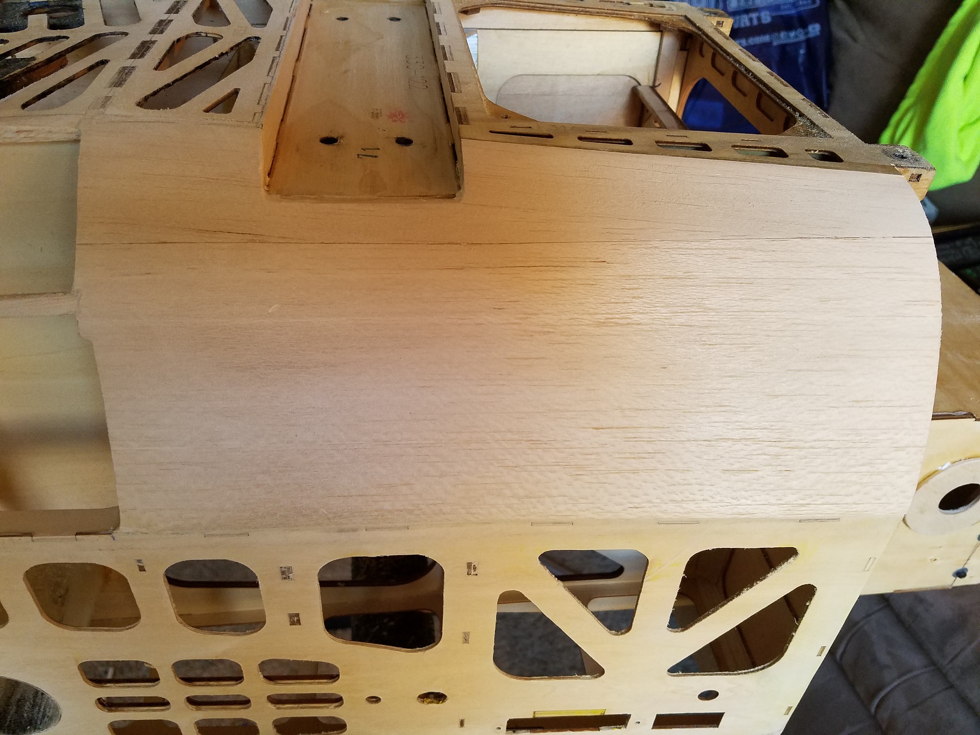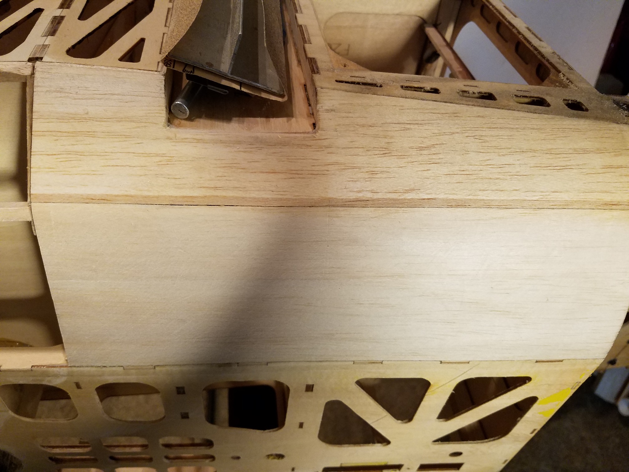 I am pleased with how nice the bottom of the fuse looks now. A little light sanding to knock off the previous covering adhesive and she will be ready for covering. I did however notice there is a couple of bad spots on the forward fuse sheeting. So I will remove the complete sections on both sides and replace it with new balsa sheeting. I still have to fix that one little bad area on the fin, but really not that big of a deal.