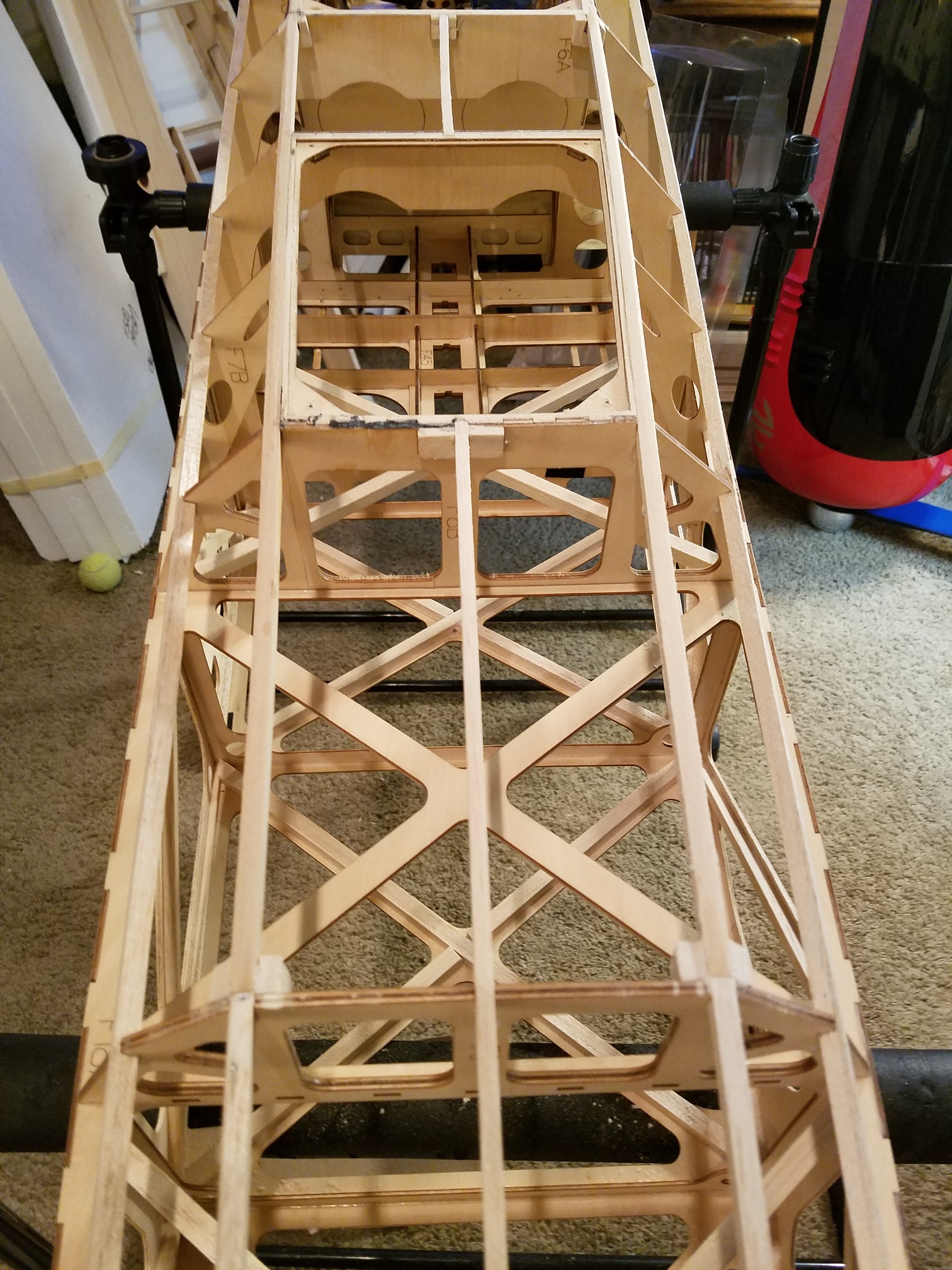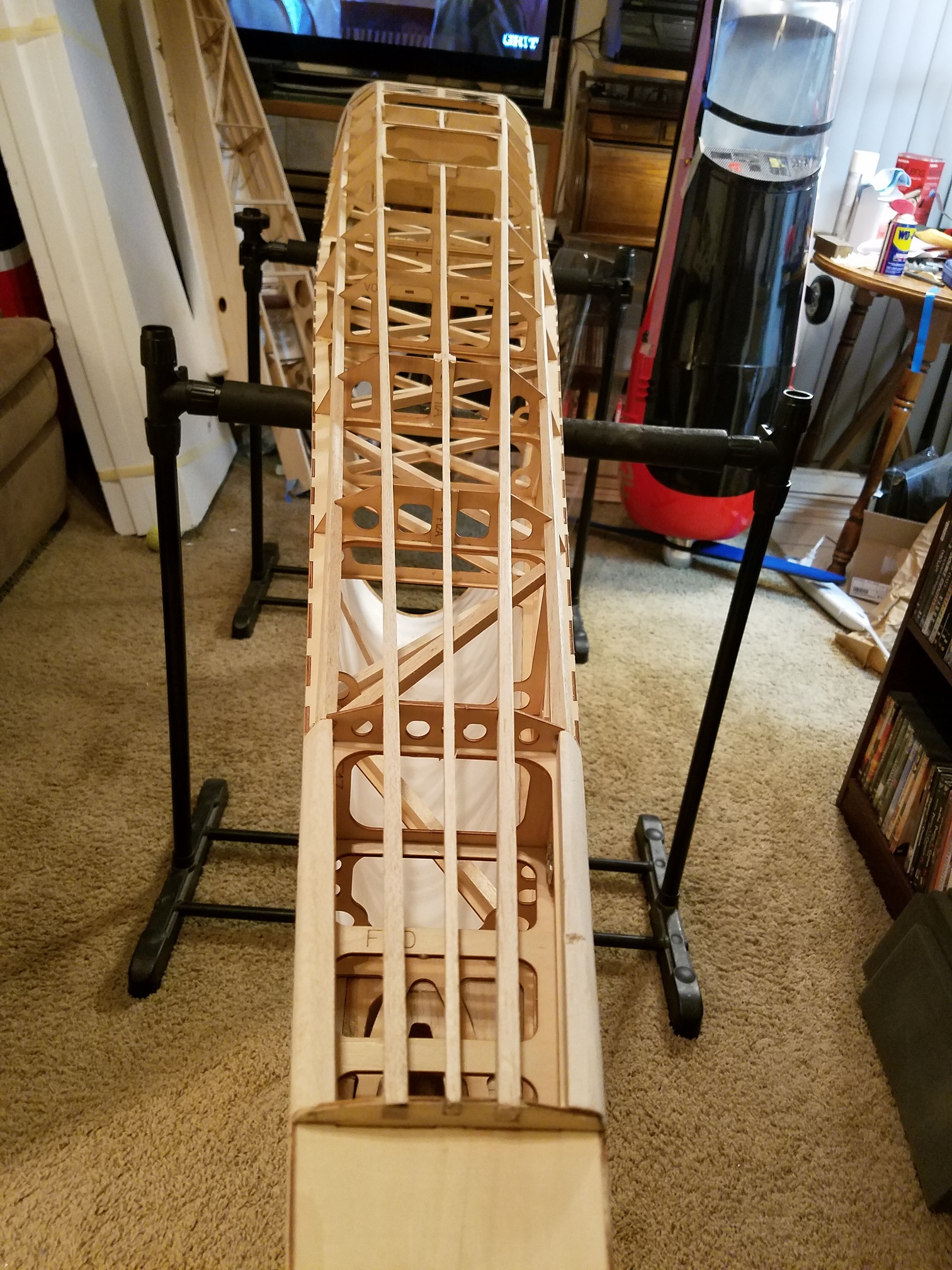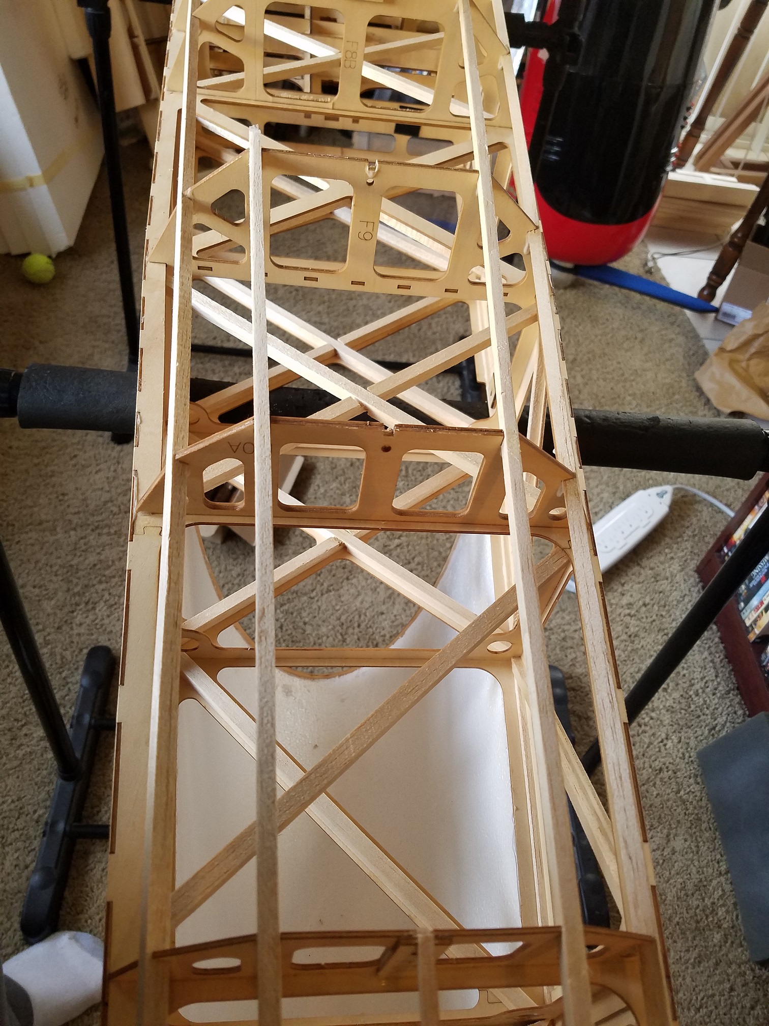 Evening gents. Been pre-occupied with so many other projects however I did manage to find a few hours to work on the 330 today. Between errands and other things that is. I wanted to get the broken/cracked stringers on the bottom of the fuse taken care of first. As is usually the case, the 330 had been picked up from the bottom and we all know what that does to those balsa stringers along the bottom. I am constantly catching myself before I even reach for one of my planes to remember, "Not from the bottom Moron". LOL. I have learned with each airframe there is different ways to move them around without grabbing on to the bottom. As with each picture you all will see the three stringers I intended to replace. I decided to extend the repair/replacement a little further so that I could be sure I could get a good joint. Instead of replacing the broken stringers with balsa, I decided to "beef" up the bottom a bit. And since I had some left over 1/4" Spruce stringers, that is what I used. I drilled the "receiving" end of the stringers and also the replacement stringers as well. Then "pinned" them with "pull/pull" cable sections. Normally I would "angle" cut the stringers then section the new ones in. But really I didn't want to add a bunch of supports to keep the structural integrity the same. So I chose to "butt" join them with the cable pins to tie them together. Then simple little "saddles" for the replaced stringers. Once I had the cable pins glued in place along with the spruce stringers, I tested the strength of the joints and I was pretty impressed of how solid "and" strong the joints are. I'm sure the bottom stringers are responsible for very little structural strength, but more over for fuse shape when covered.