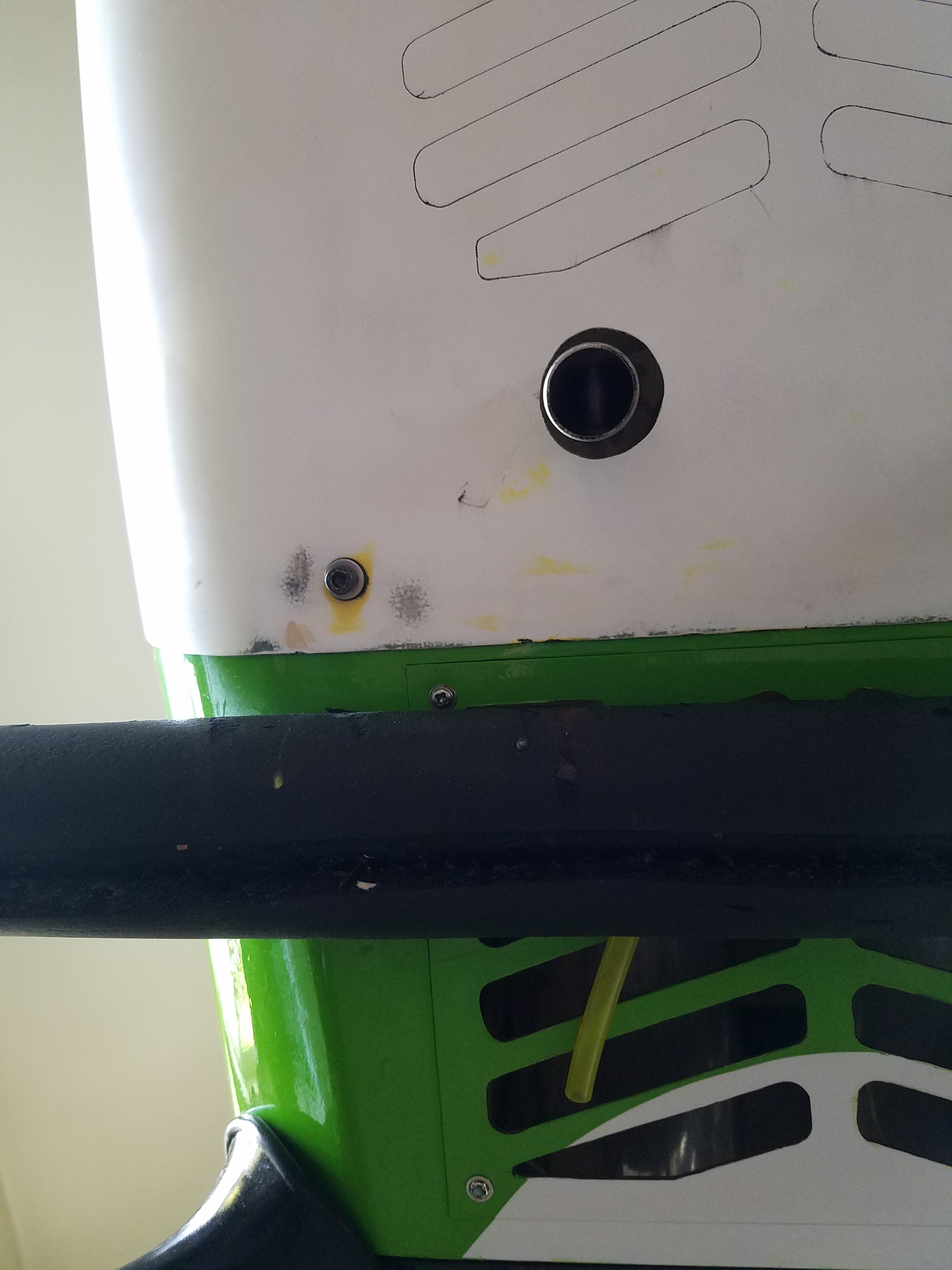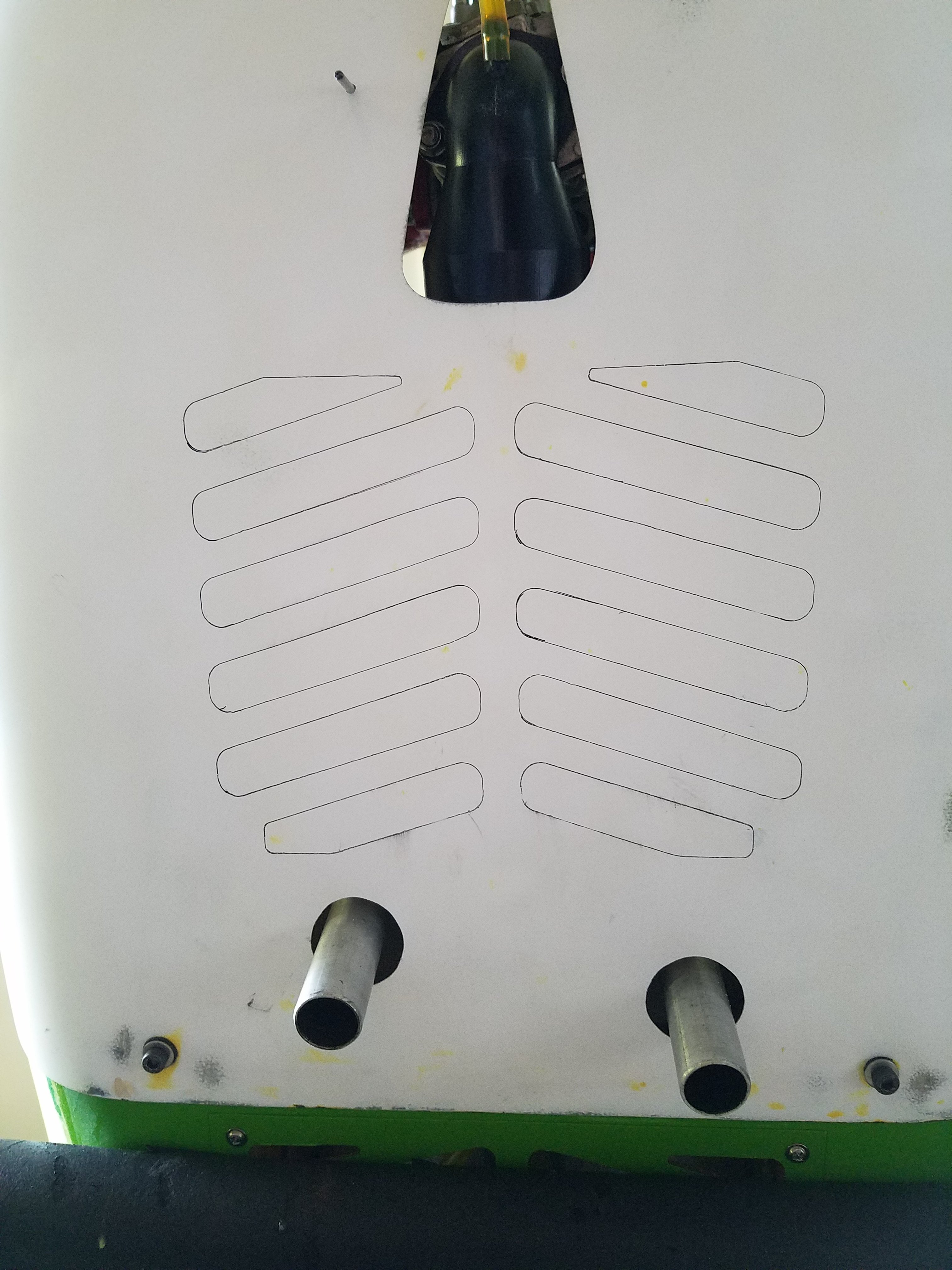 First test fit of my newly custom cut by Shay-mess 330 cowl. It's perfect and fits like a pair of painted on blue jeans on a hard bodied red head. Yeah, dang sexy too. I even got the exhaust outlets roughed in, choke rod hole drilled aaaaannnnd, intended vent holes penned onto the bottom shell. My son didn't get around to opening up the air inlets on the front of the cowl so I thought I might do that. But after test fitting the cowl I see the beast 157 cylinders are perfectly positioned 50% above bottom lip of cowl inlet. Once baffled, there should be no reason to cut larger inlet holes. I'm off to D&B for retaining bolts. When I return, we'll get to opening the bottom cowl vent and start prepping for primer.