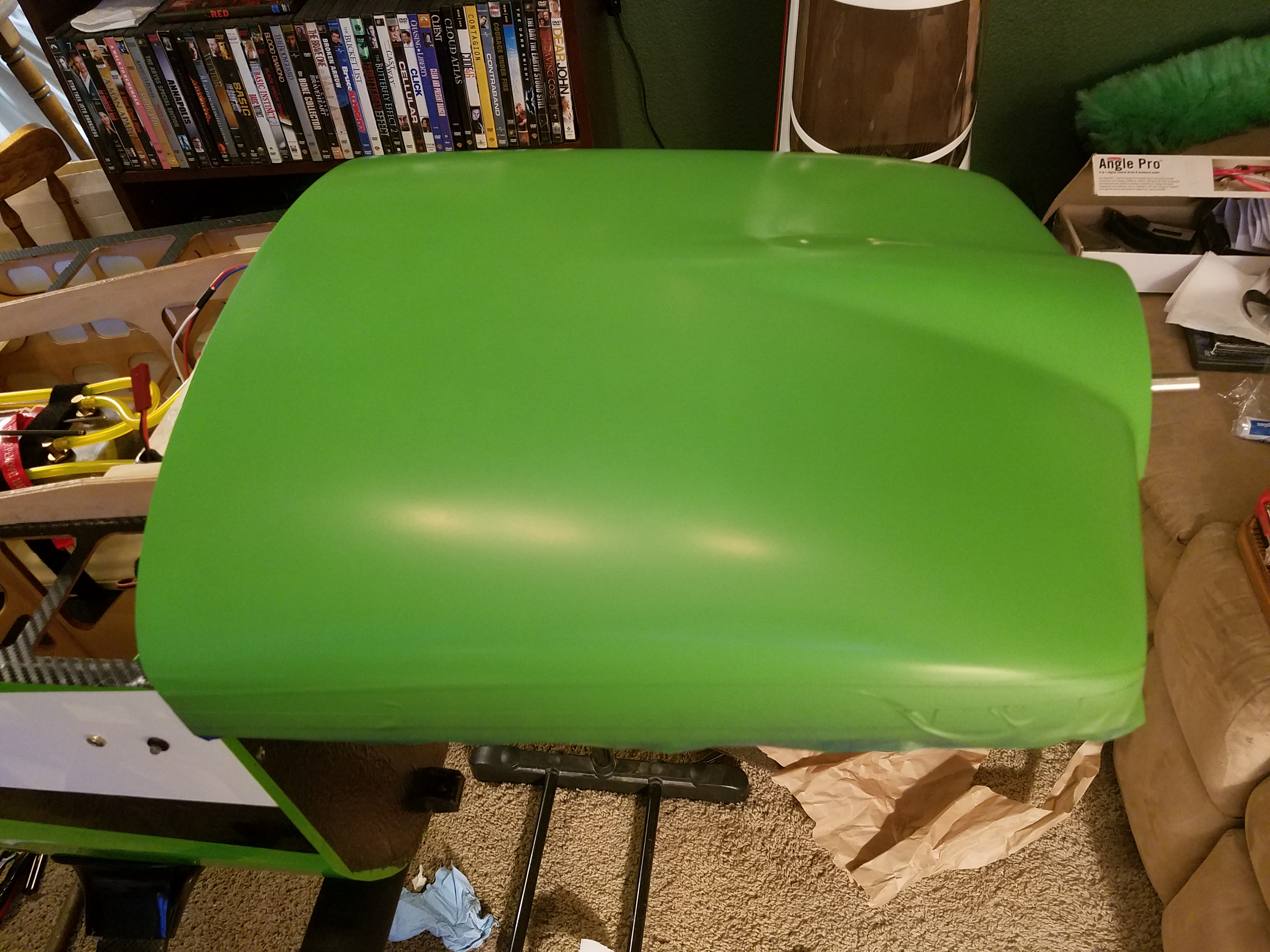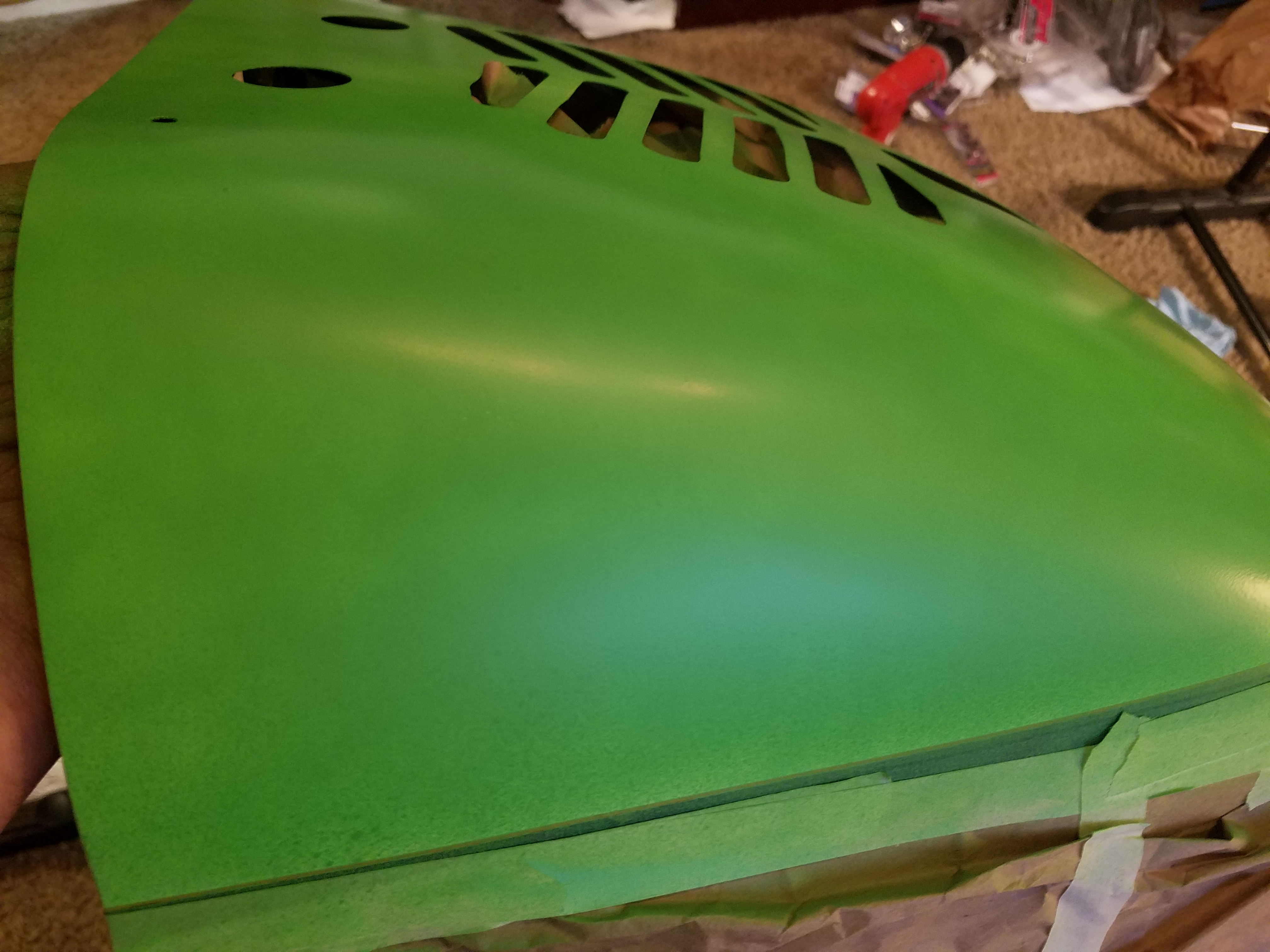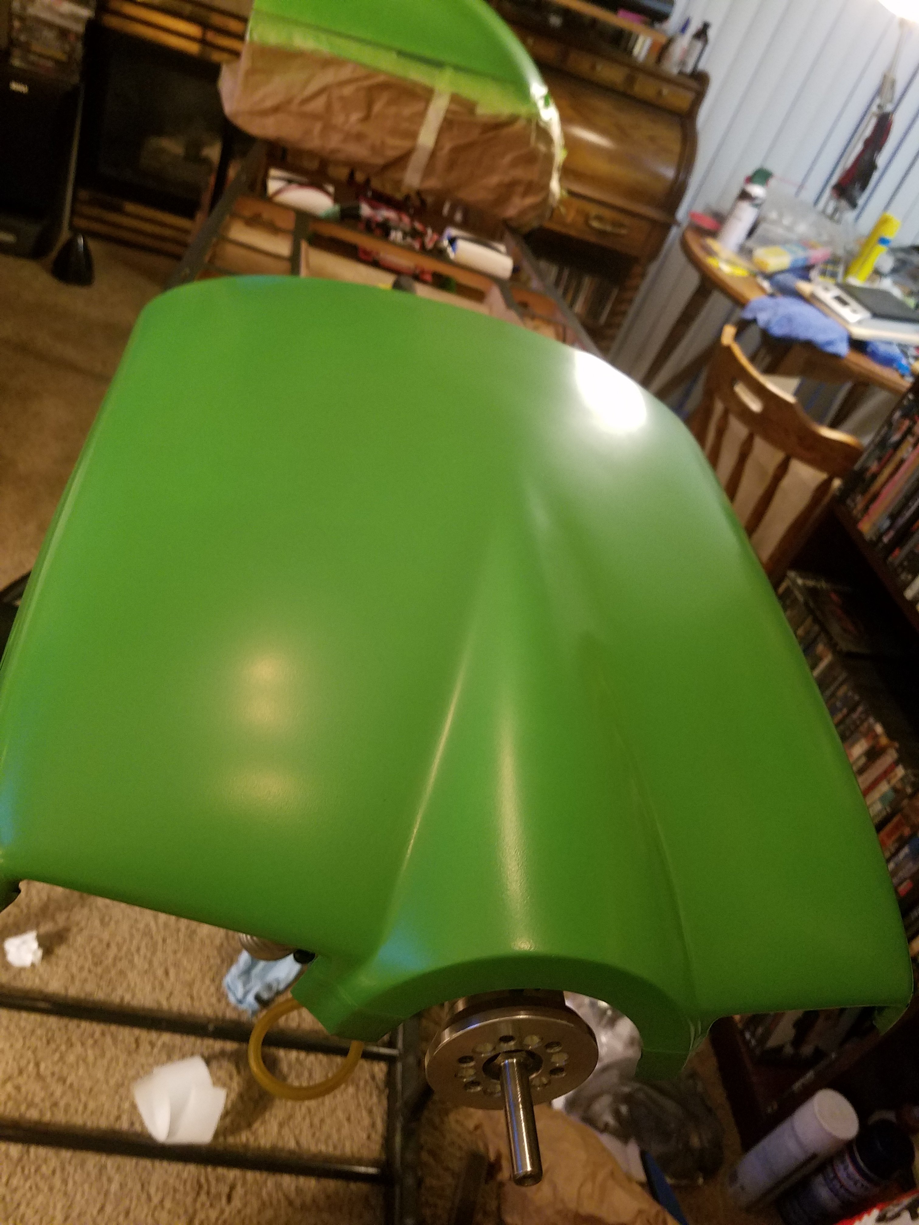 Not a real happy camper tonight. I worked feverishly to get the cowl halves prepped and masked off and ready for paint. Unfortunately I do not have a paint booth so all my painting is done out doors. I was up against the clock and time was running out before darkness fell. Not to mention the wind has been atrocious this year. 22 mph today. But finally it calmed just after 8. Anyway, cowl masked and taped off and ready for paint. I was afraid one can would not be enough so i ordered an extra just in case. Nevertheless, i am short one coat on the top half and two on the bottom. WWRC says I should be ok until Tuesday when the extra can arrives. So far it's looking pretty good.