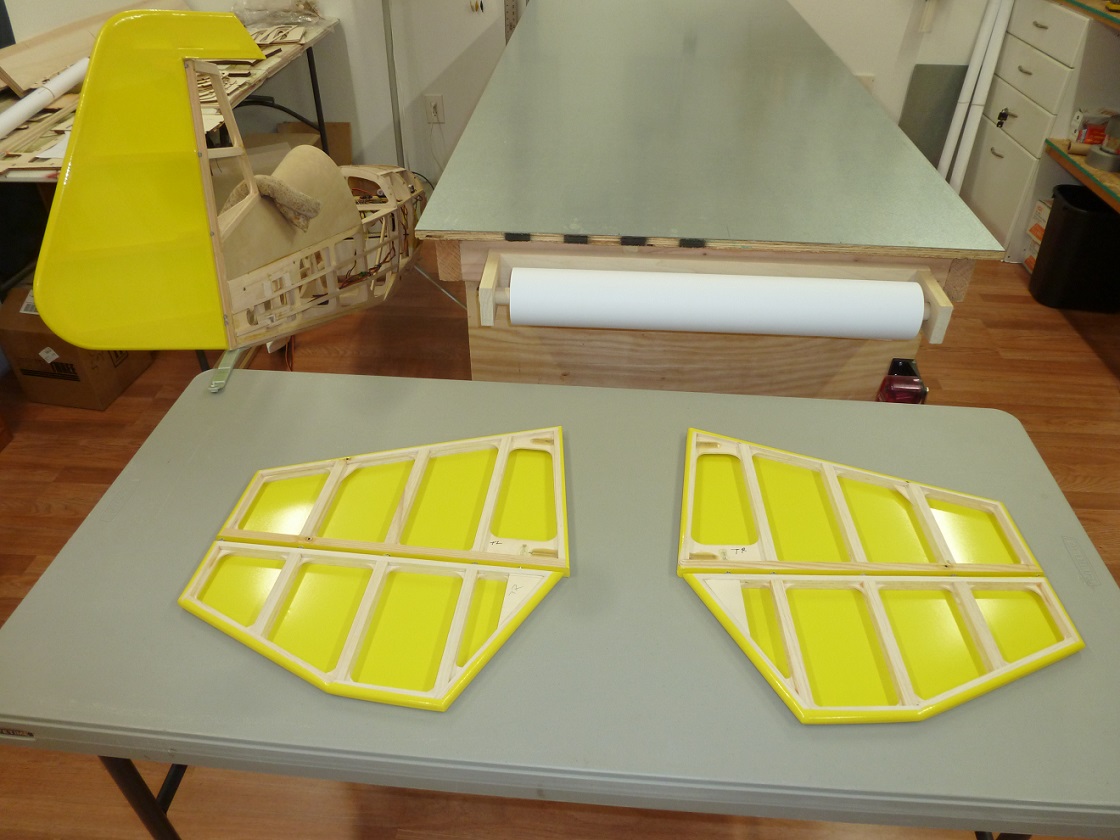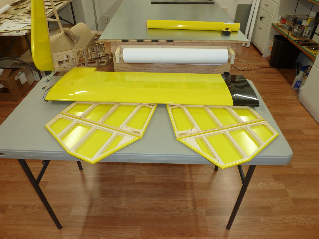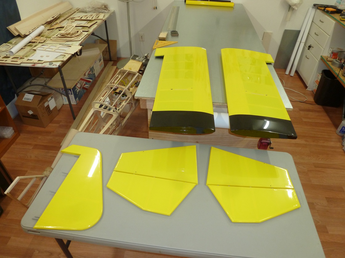 The bottom wing stabs, ele's, and rudder are done, for now, the silver stripe with black trim will come when everything is ready for it at one time.