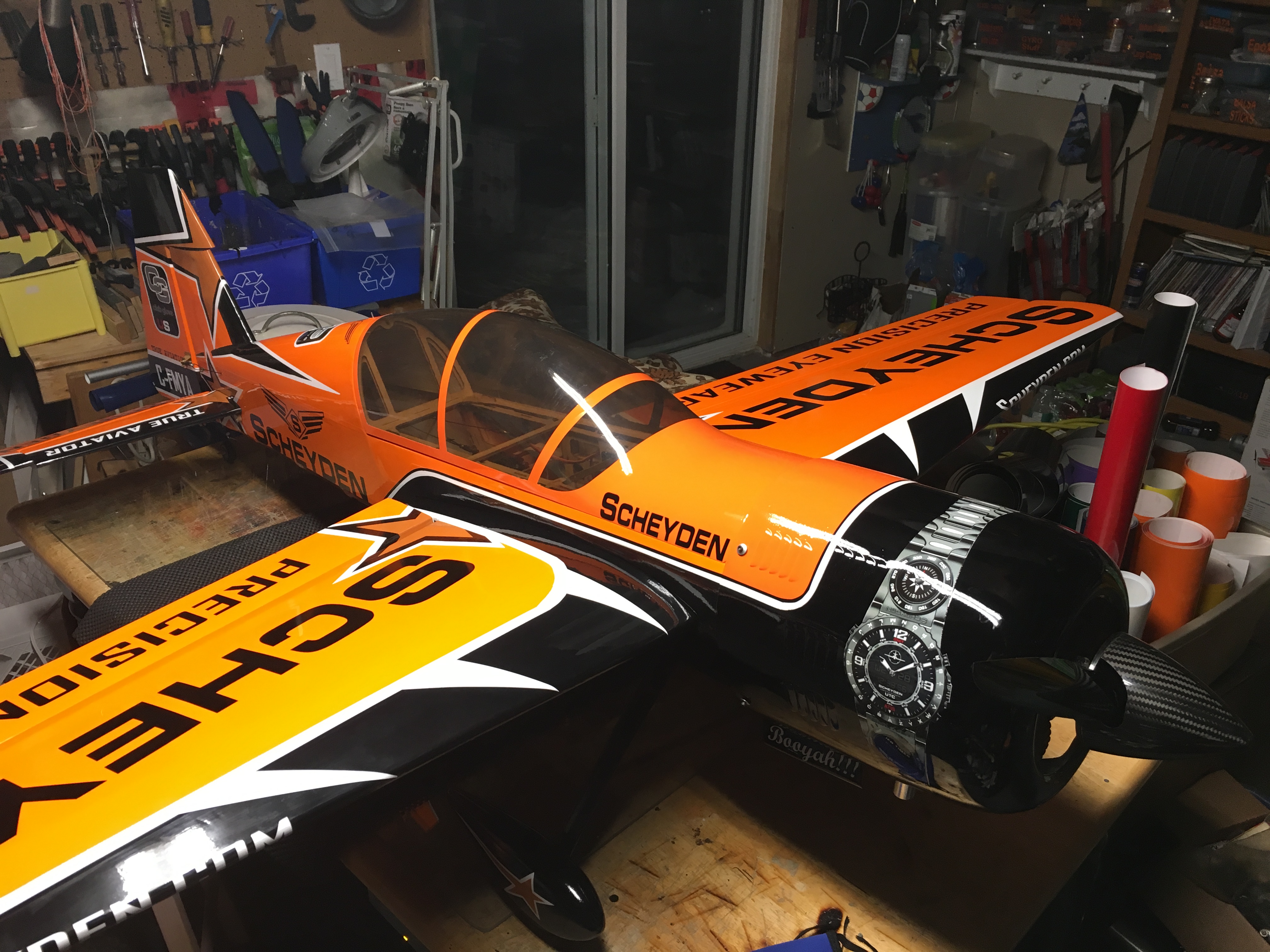 It took several hundred hours to paint this aircraft. 12 colors then cleared, sanded with 600 wet and applied drop shadow then cleared again. Also keep in mind, that all of the aluminum panels are painted inside and out which means that the plane has to go together and get taken apart many times. Not to mention the control surfaces, coves, canopy, cowling, etc that have to go on and off through the entire process. So in the end I think it took about four months to complete the entire aircraft.