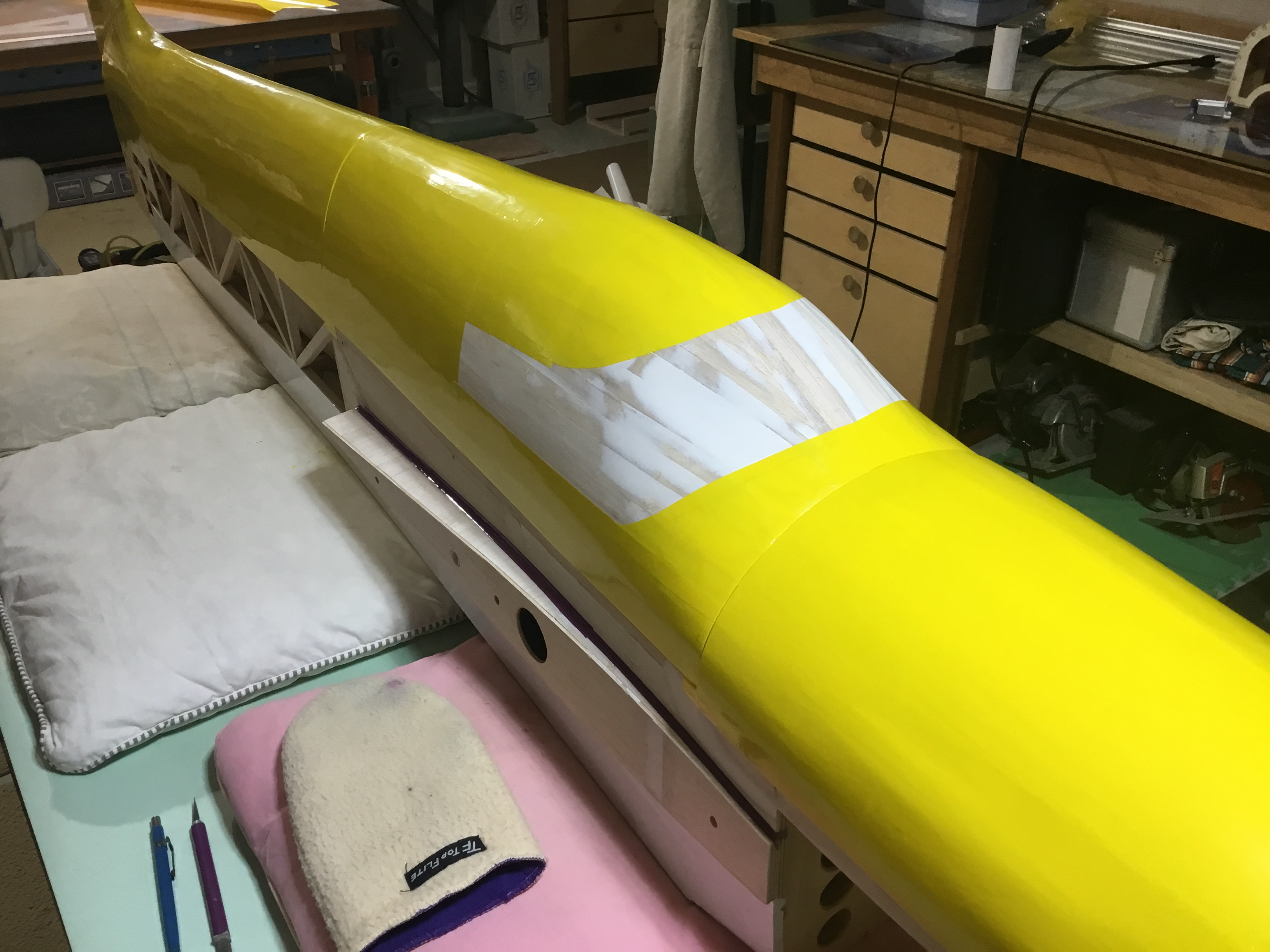 After a full day of trying to cover the canopy it is almost done, just have to add the windshield part and I have decided to make it black. I may regret this but I think it will look the best. Just never had good luck with black it always wrinkles on me in the sun.. Messed up some covering trying to do it with one or 2 pieces just could not get down with out major wrinkles. So it ended up with 4 pieces.