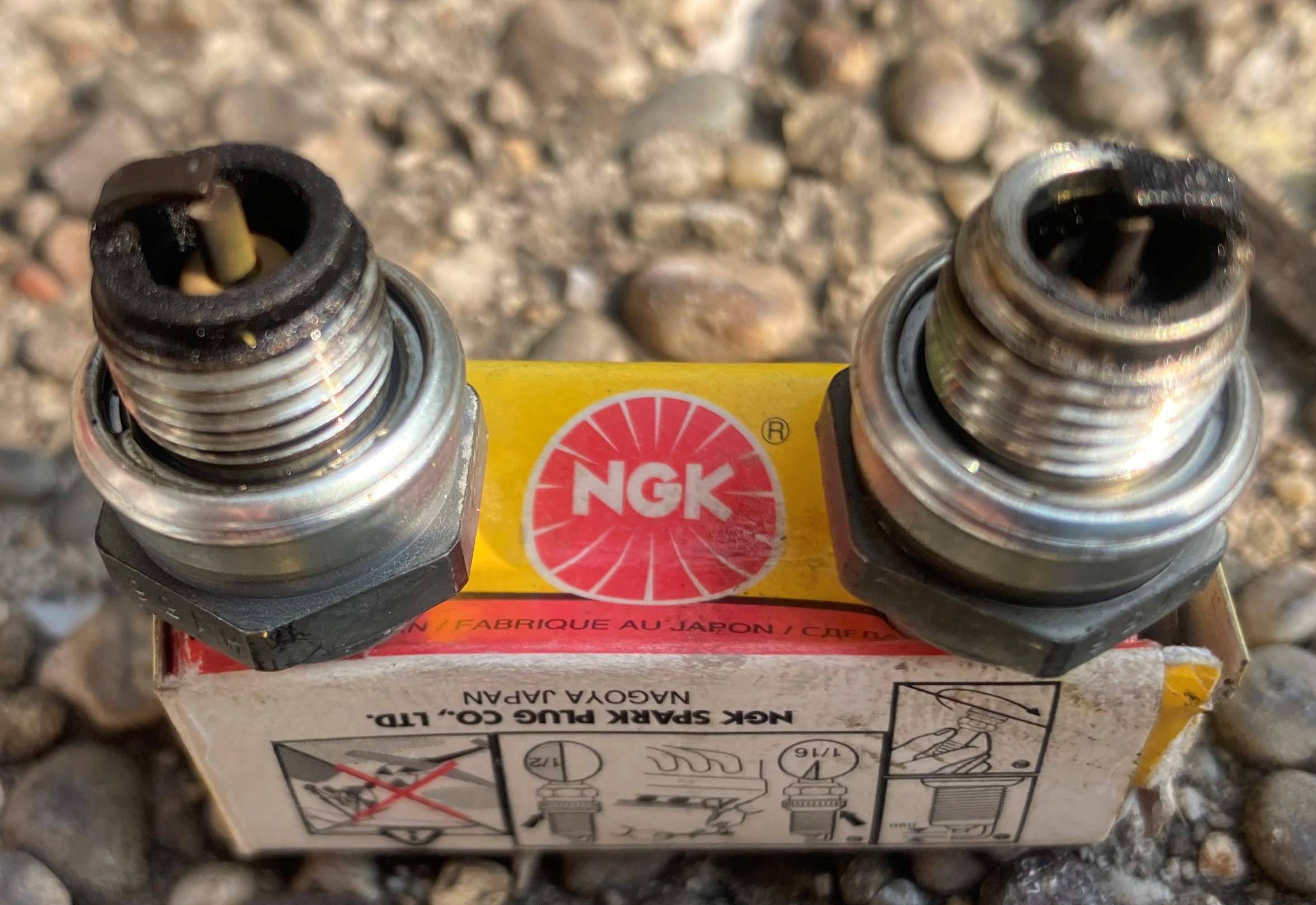 This is what the plugs looked like. The right side plug looks good while the left side is oil fouling. The engine idles and ran good at full throttle but would miss at cruising speed. At any rate put two new CM6 plugs in this morning and I'll see what happens later today. May need a slight carb adjustment as well but it sounds good at idle and full throttle