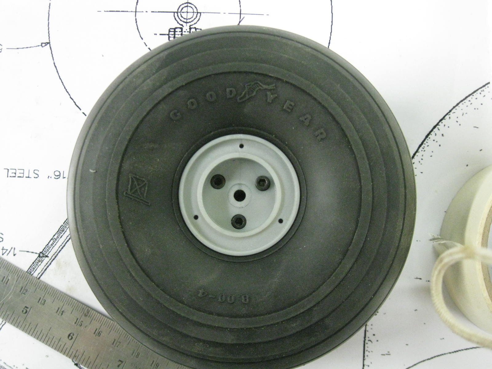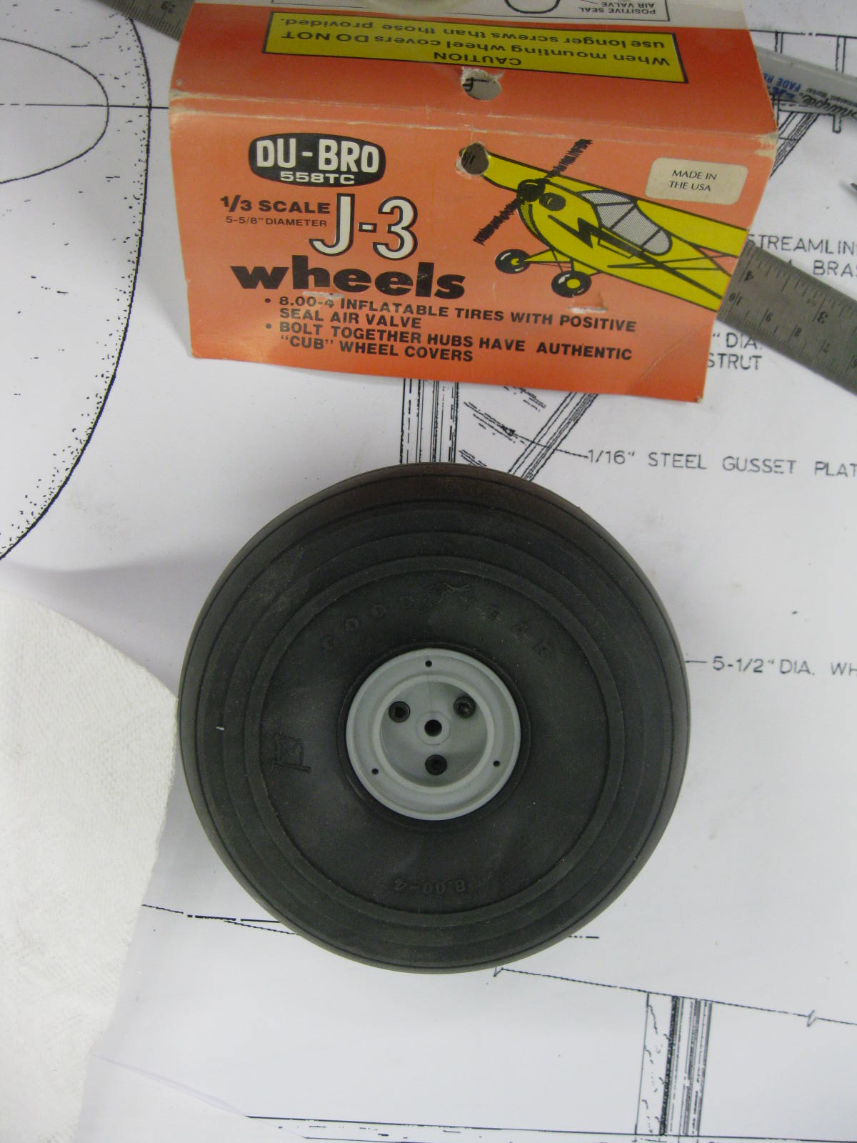 These NOS Dubro J3 Cub wheels are going on the Champ. They are the correct diameter however the scale size is off, the Cub wheels are 8.00 x 4 while the Champ are 6.00 x 6. They still will look great. They are the old pneumatic style no longer in production.