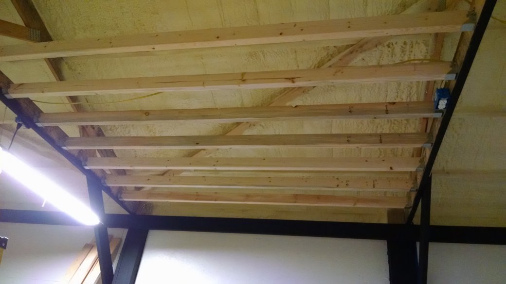 Well I never really did alot of planning on the ceiling other than looking at it from the ground. Well while I was painting I took a piece of scrap and put it up there to test fit my plan............that didn't go well. Quickly realized that 3 of my trusses are going to show based on how I'm doing things. The center section of ceiling I thought was just under 8ft is actually just over 8ft so I'll have a seam showing there.