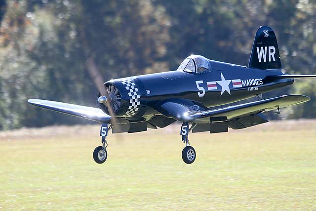 A Super Great friend of mine here in NC , Rick Cawley ,built this bird . It started out as a Maritoki kit,110" span ( or close ) and that was about as far as it went. He redesigned it as a later F4U-5 which was one of the last Corsairs built, engineered /designed a scale full fowler flap system ,new properly profiled glass cowl/canopy,etc.. It has a set of Robart Heavy Duty air gear with 50+ lb capacity that function flawlessly. The BME 110 is a powerhouse,smooth as silk ! It comes off the ground and climbs like a homesick angel at 50% throttle . As you can tell,I just love it ! It's "MY KEEPER ". WP