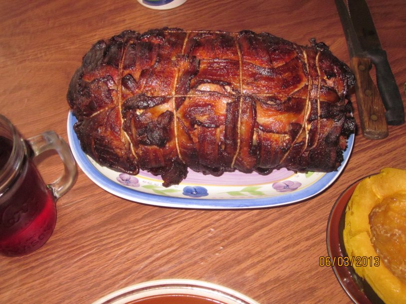 IMG_2614.JPG IMG_2615.JPG IMG_2621.JPG A nice slice of this 8lb. Smoked bacon wrapped Buffalo meatloaf makes a great giant scale cheeseburger after a great day of flying. takes a good six hrs. The guys at the field love it when I show up with my two barrel smokers for our cook outs LOL!!!