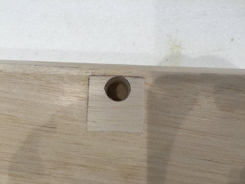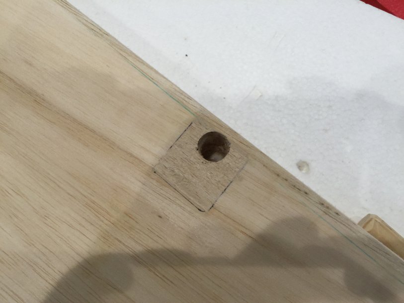 Now, I have glued in the hardwood dowel, and once this cures, it will be sanded flush, then drilled for the 10-32 Dubro control horns.