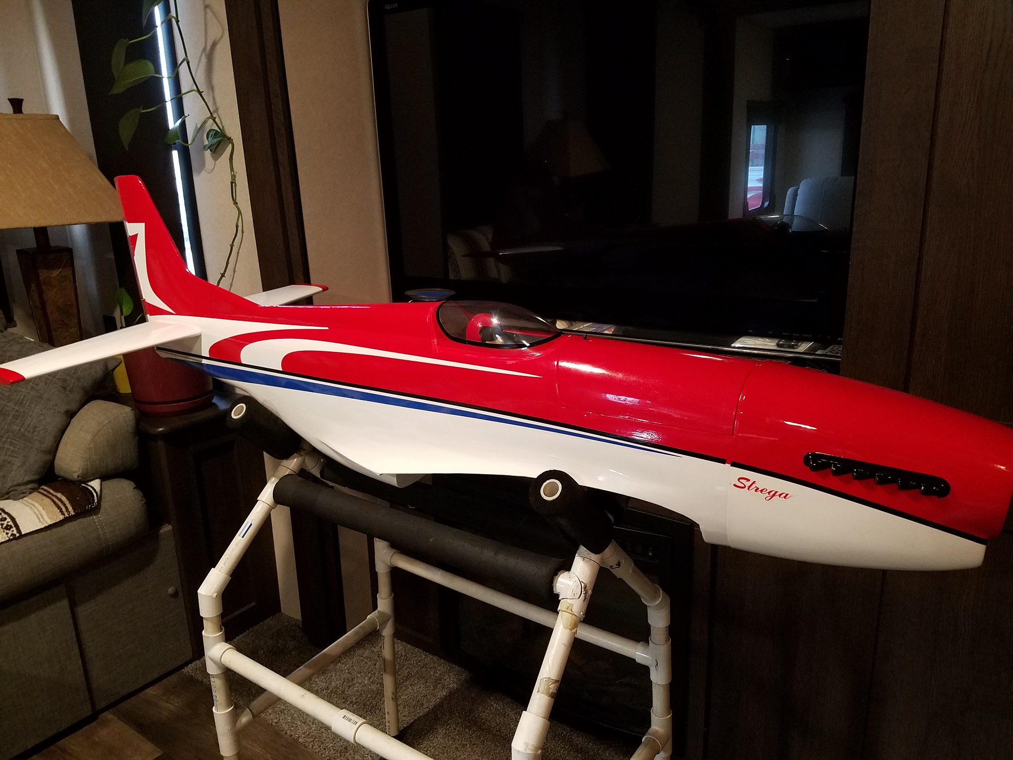 I used to have the smaller orange pheonix Strega (V1), no retracts, OS .46AX - It had a fast stall speed (no flaps) and was very fun to fly in the air. It could do a lomcovak at high speeds that was really fun to do. Almost topple end over end! It was flying fast all the time, I remember changing the prop pitch to crank the rpms and forgot to land sooner. I chopped a couple minutes off the flight time. Sucked the fuel down FAST. I had fun with that plane. Changed ownerships five times, no one else ever flew it - too scared of the high stall speed. No idea what ever happened to it.
