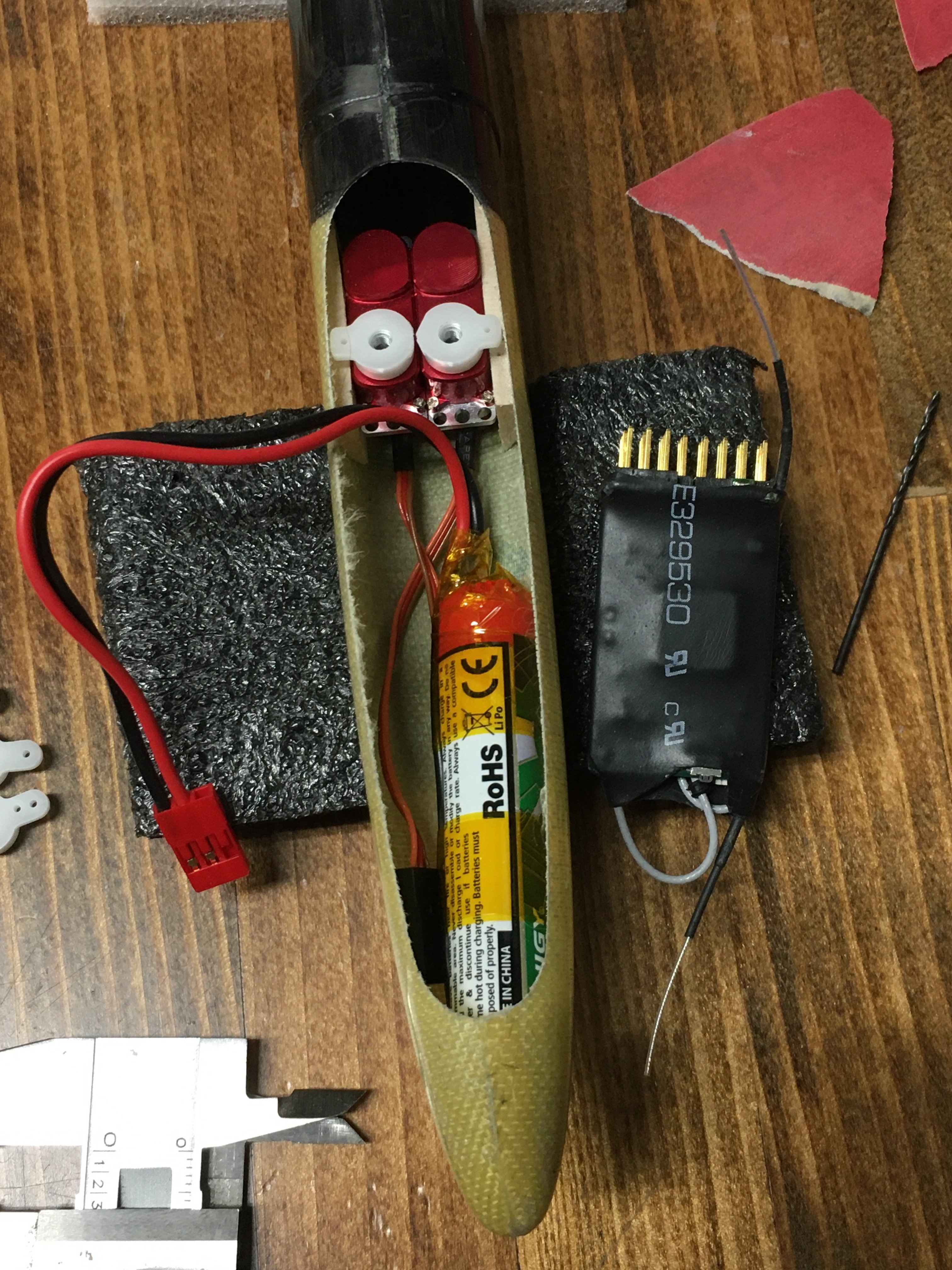 I don't remember exactly what they where. I know the Rudder I had maxed as much as I could get. Elevator I went with max up without it hitting the boom and then as much down as it can get as you want it to rotate quickly at the top of your launch. Here are some pictures of my buddy I fly with Flitz 2 where he modded his MKS servos to fit fit by side. You can see one has been ground and the other hasn't. Its pretty common to have your RX behind the servos and thats where mine will remain in this rebuild. I currently have a 700mah like pictured in mine. Its rather large so it keeps me from being able to put my RX in the nose. If I switch to a gum stick style pack I might be able to though.