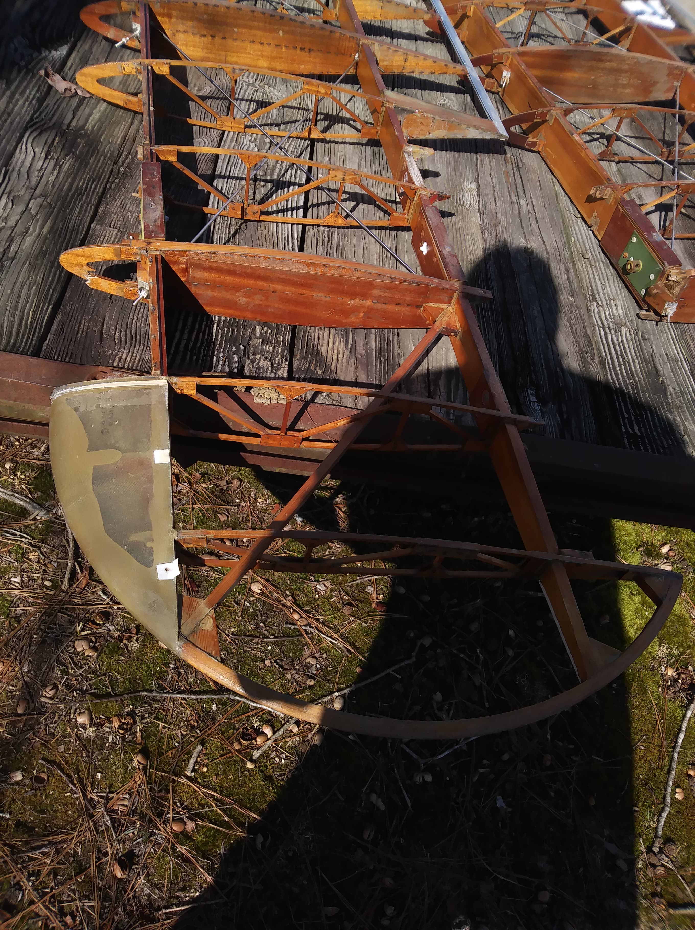 The bottom wing that appears to be in the best shape will be hung up on the wall as art. If I have room to do that with the top wing I will do the same thing. Otherwise I was thinking to cut the ribs out of it for others to use. There is also this partial piece of another plane. They where unsure of what it was off of though.Cut the wings up and sell pieces. I'll buy a piece.