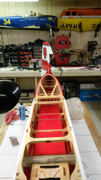 I replaced some wood in the fuse and built a new radio platform. Then I covered it all with some Missile Red vinyl.