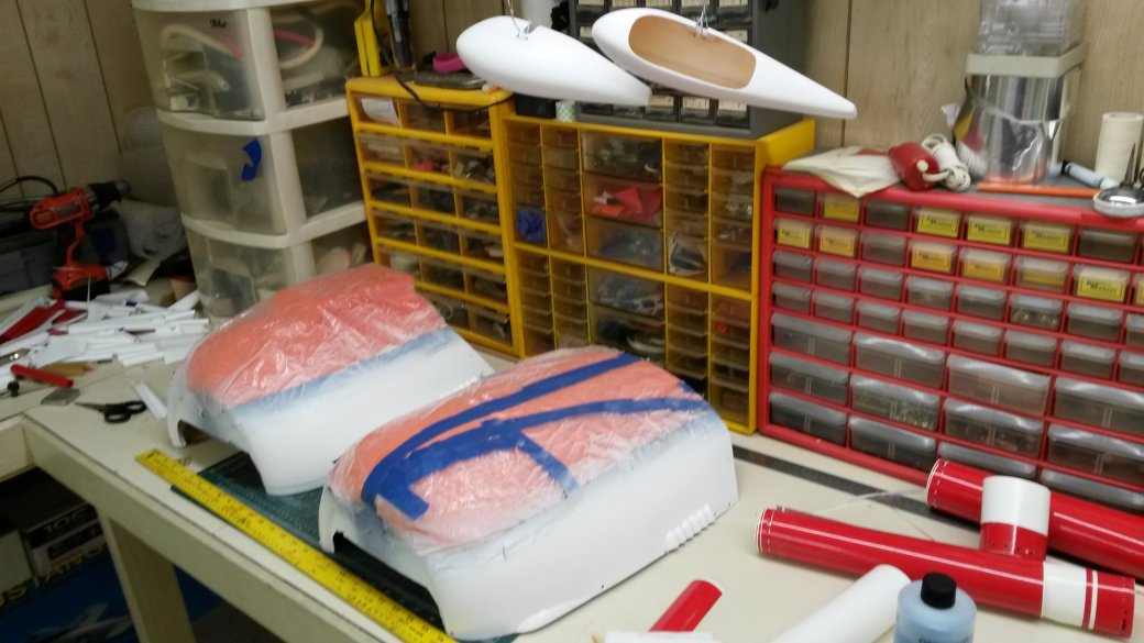 I added a black pin stripe between the white and holographic chrome stripe on the fuse, wings and stabs. masked off the cowl and started the white paint. Also the pilot and wheel pants. I was having a lot of trouble getting paint to spray right and as it turns out a math error (doh) was the cause. I was instructed to mix paint and catalyst 1:1 then mix with reducer 1:1. I was mixing 2 Oz. of paint with 2 Oz. of catalyst. Then 2 Oz. of reducer. I should have been adding 4 Oz of reducer. I managed to get a couple of coats on and have sanded and prepped for a third when it warms up a little.