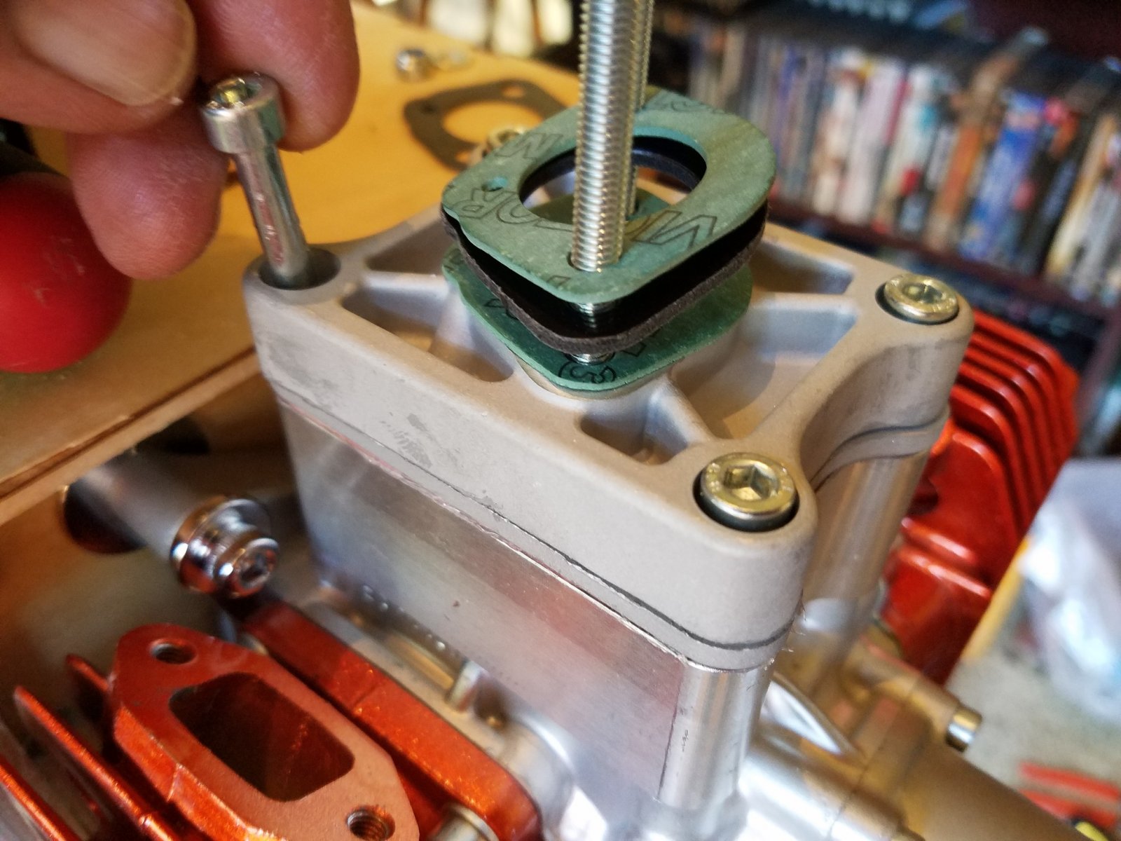 First remove the original phenolic carb base and "rubberized" coated reed cage assembly. Sorry everyone. For those that do not know, 3W originally manufactured their engines with phenolic or plastic post carb components. That being the carb base, reed cage assembly and reed block assembly. Though they worked fine for some and for a good number of years, there have been many cases where after a period of time, the parts will start distorting and warping due to heat and cool down cycles. And age too. Causing air leaks and poor tuneability of the carburation system. The rubberized reed cages would "peel" after a period of time and also causing some issues. The reed blocks would split down the sides where the bolts go through. To stay on top of the game and maintain the highest degree of quality, 3w revised all the components. Now made of high quality aluminum components separated with gaskets, the "dub" engines continue to produce amazing power and dependability. And no more worries with worn out or faulty carb parts.