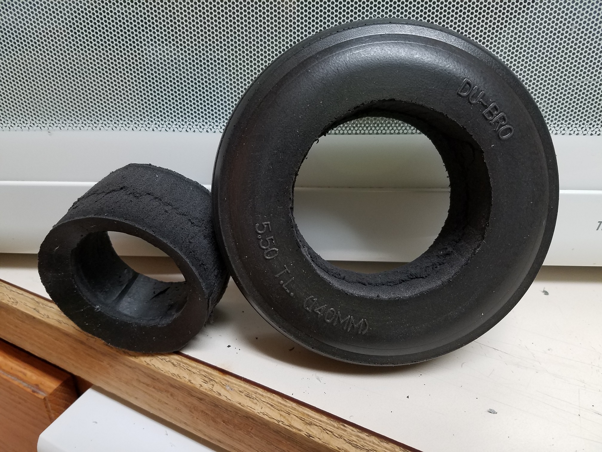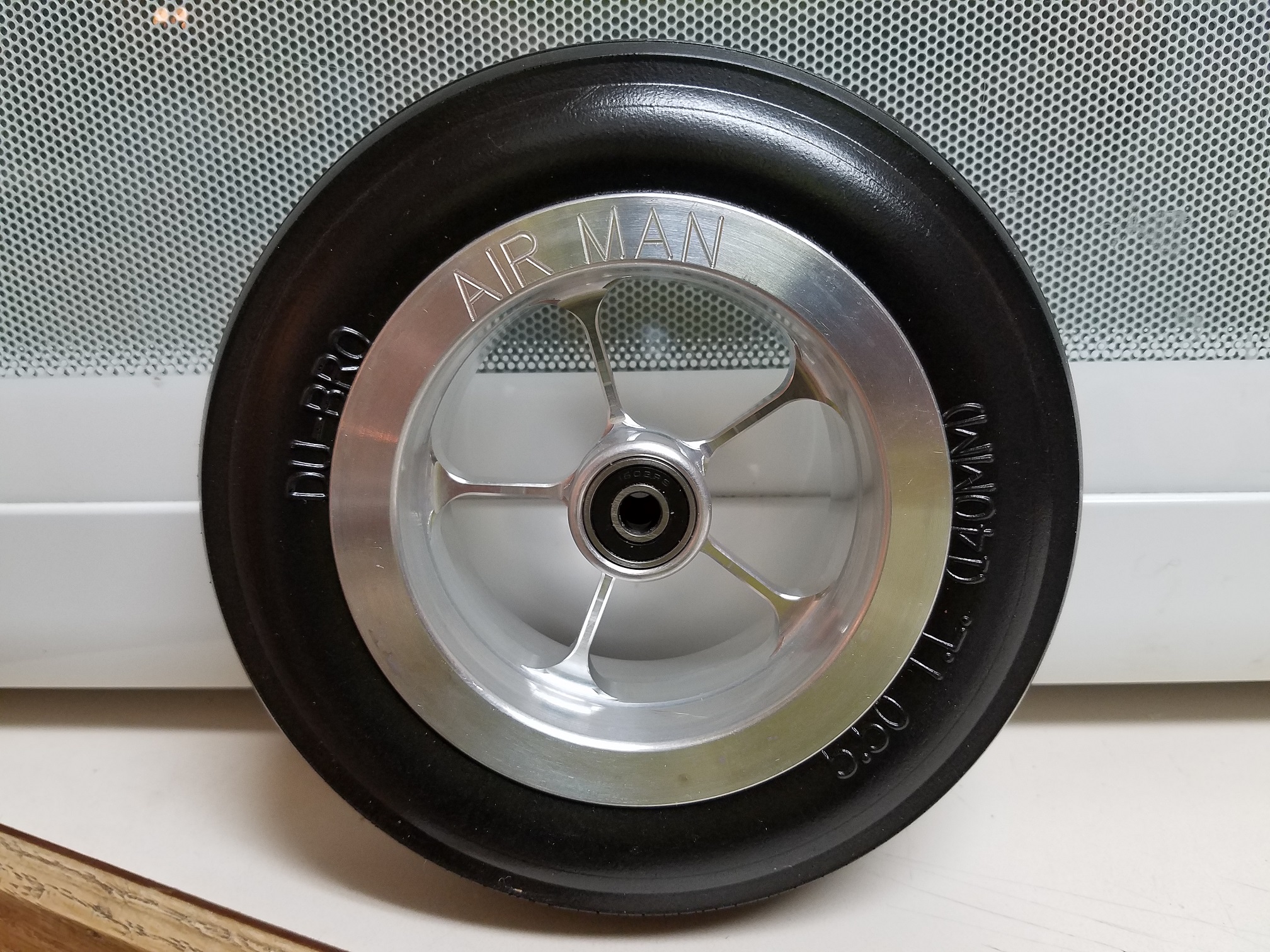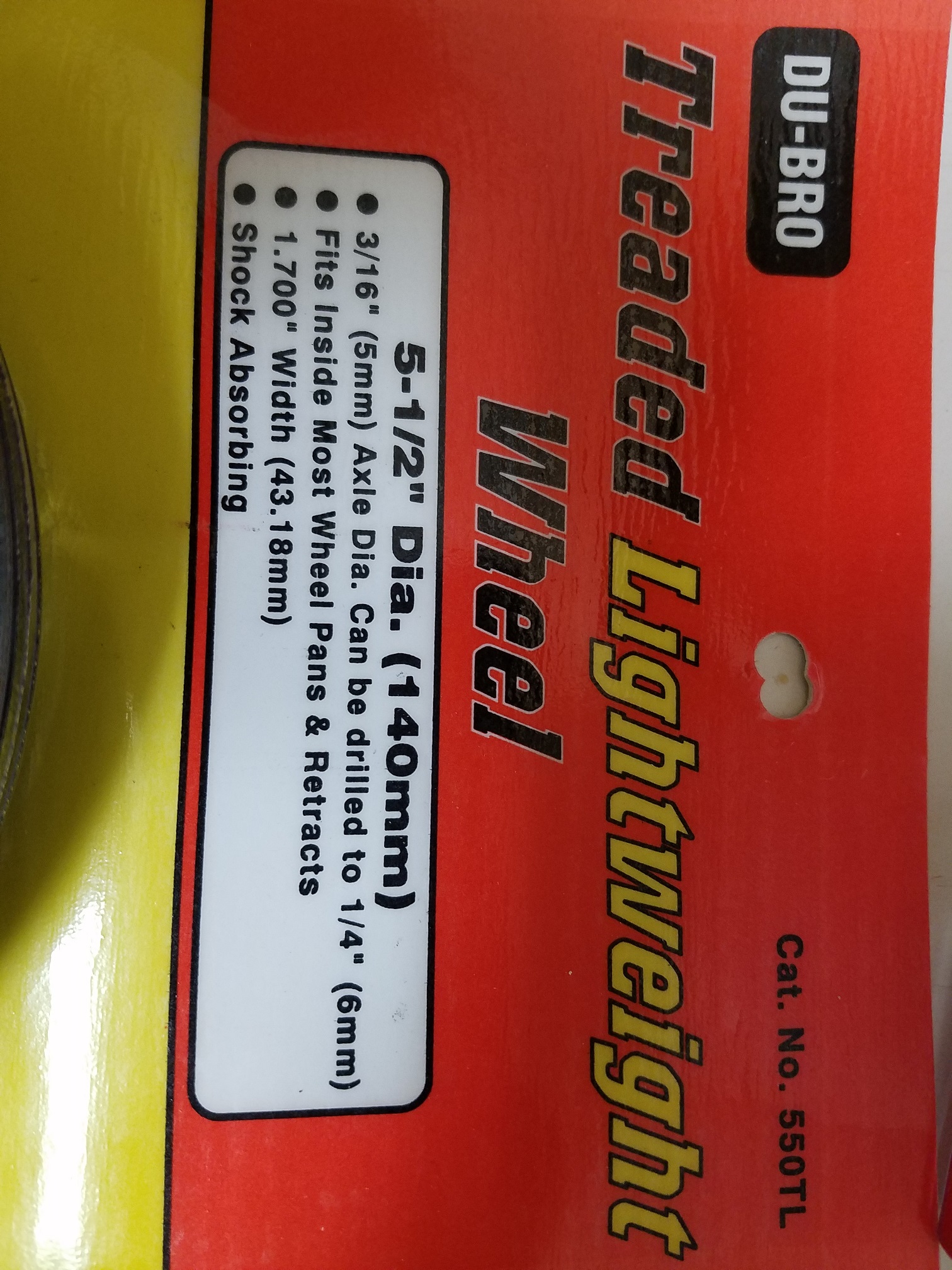 As most of you remember, I installed new Airman wheels on the new Behemoth Yak (2) when I put her together. One from the previous Yak was damaged beyond repair so I had to pick up a new set. Well, I used the Dubro 5.00 TL Tires on the new set of wheels for the big Yak. I liked them just fine, but somehow looking at them was rubbing a raw spot on my brain. They looked great, just felt they were a little too small for that size of bird. I acquired my third set of Airman wheels and got to thinking...how about if I go to a larger tire? Should work right? Well, I ordered up some Dubro 5.50TL tires and they finally arrived today.